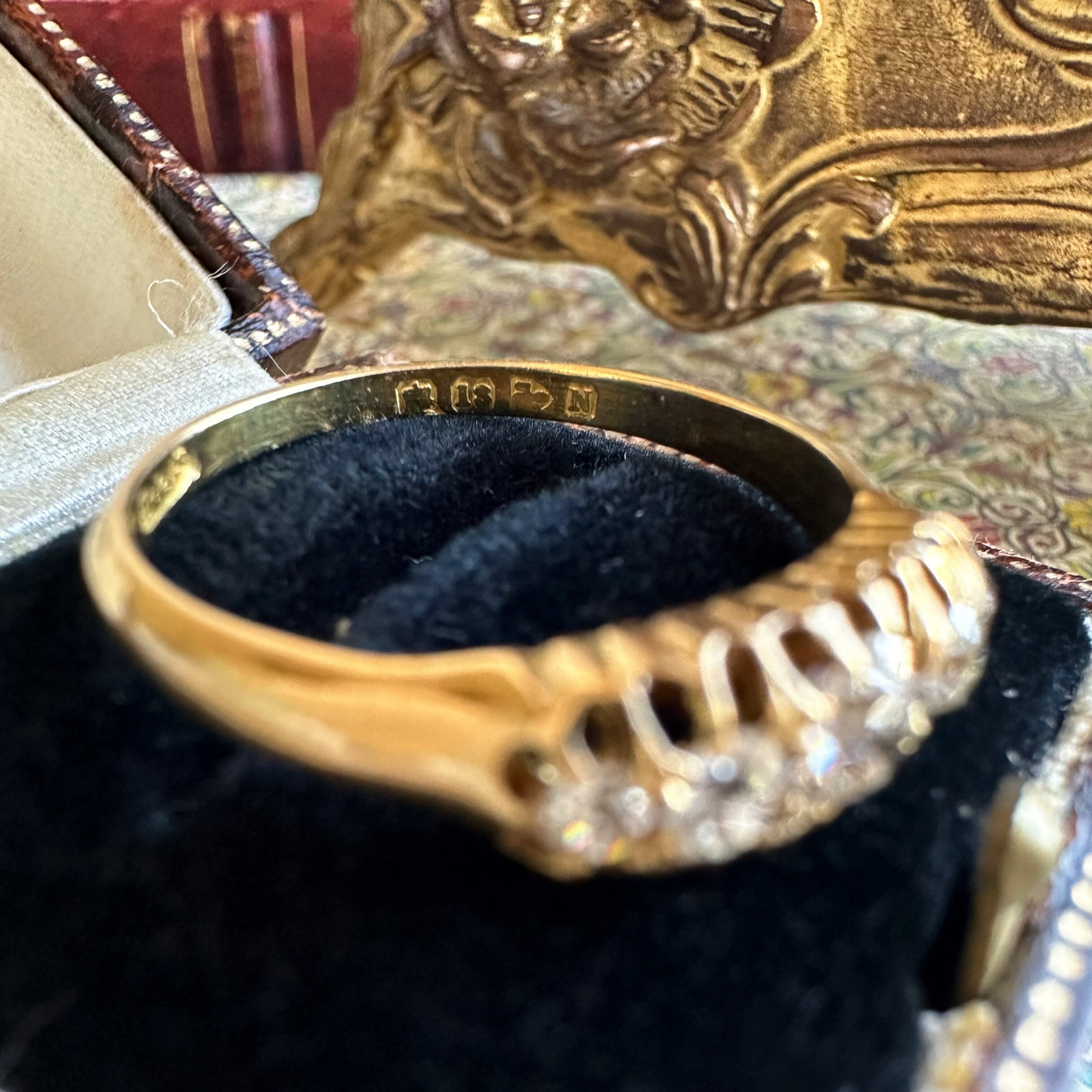リングに配置された5石のダイヤモンドはオールドヨーロピアンカットダイヤモンド、ご存知のように歴史的なカットの一つで、19世紀から20世紀初頭にかけて非常に人気があり、その美しさは現代でも高く評価されています。