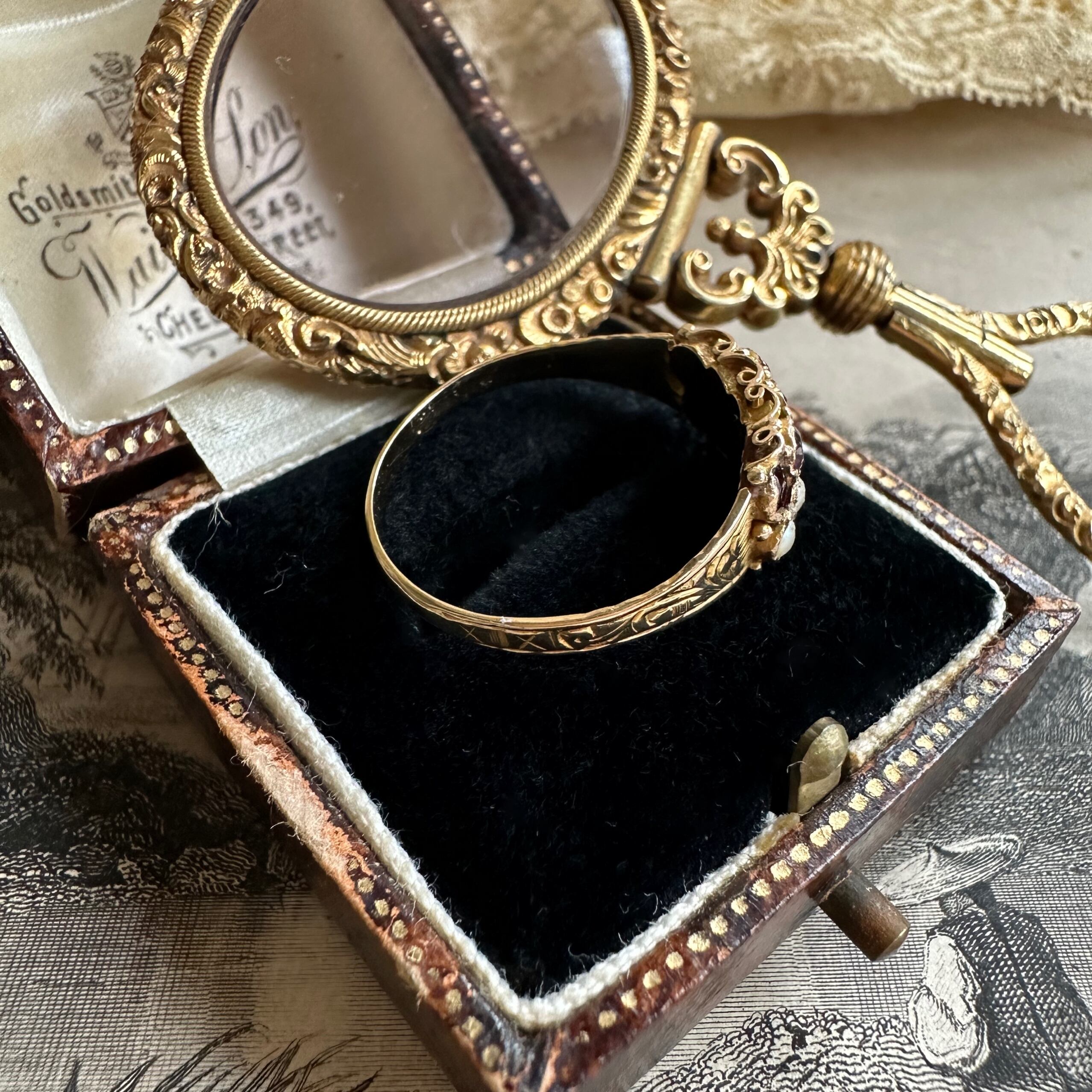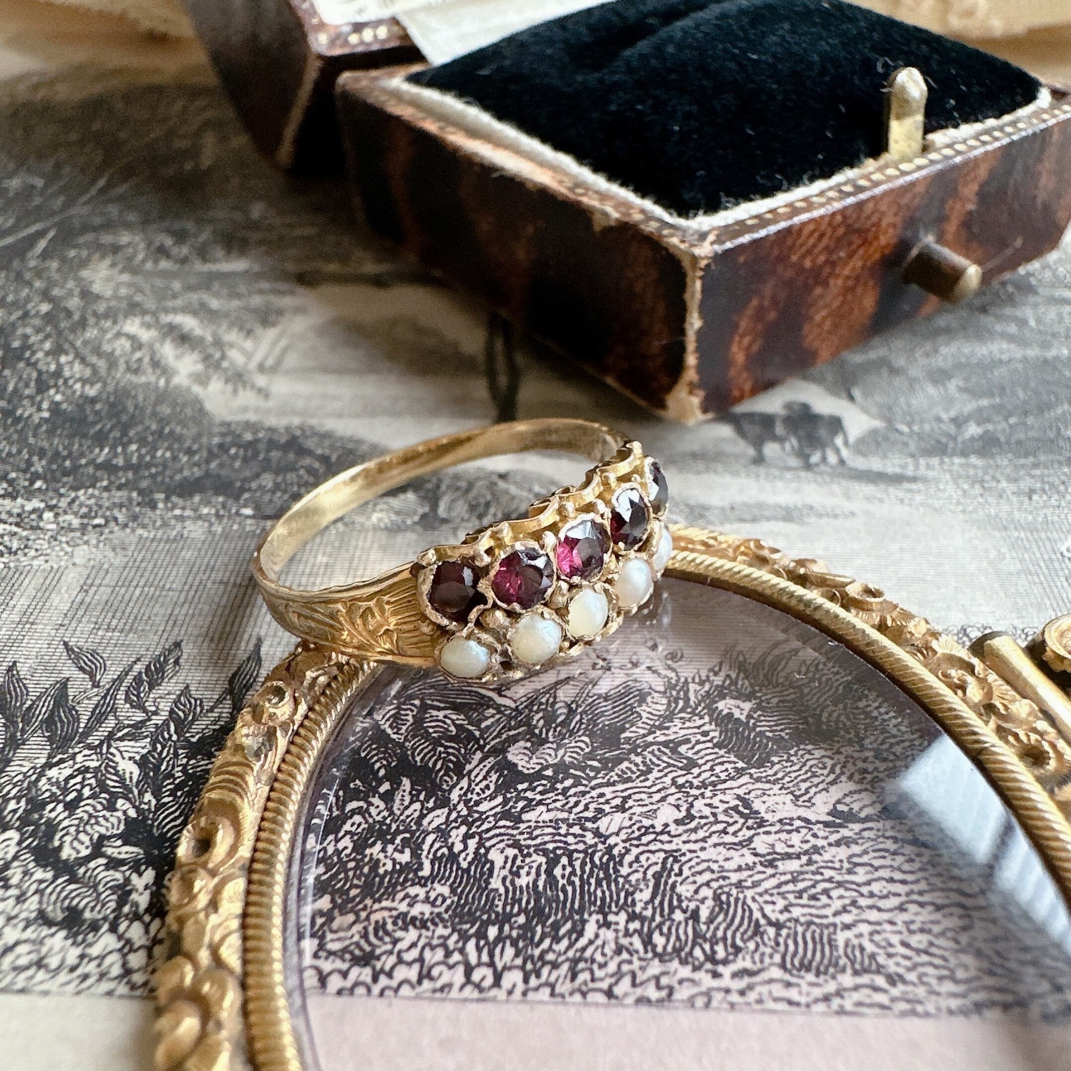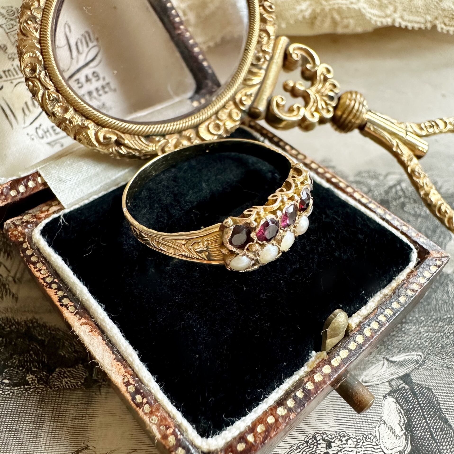 リングの上下に配置された5粒ずつのガーネットとハーフパールは、当時の美的傾向を見事に反映した素敵なデザイン!