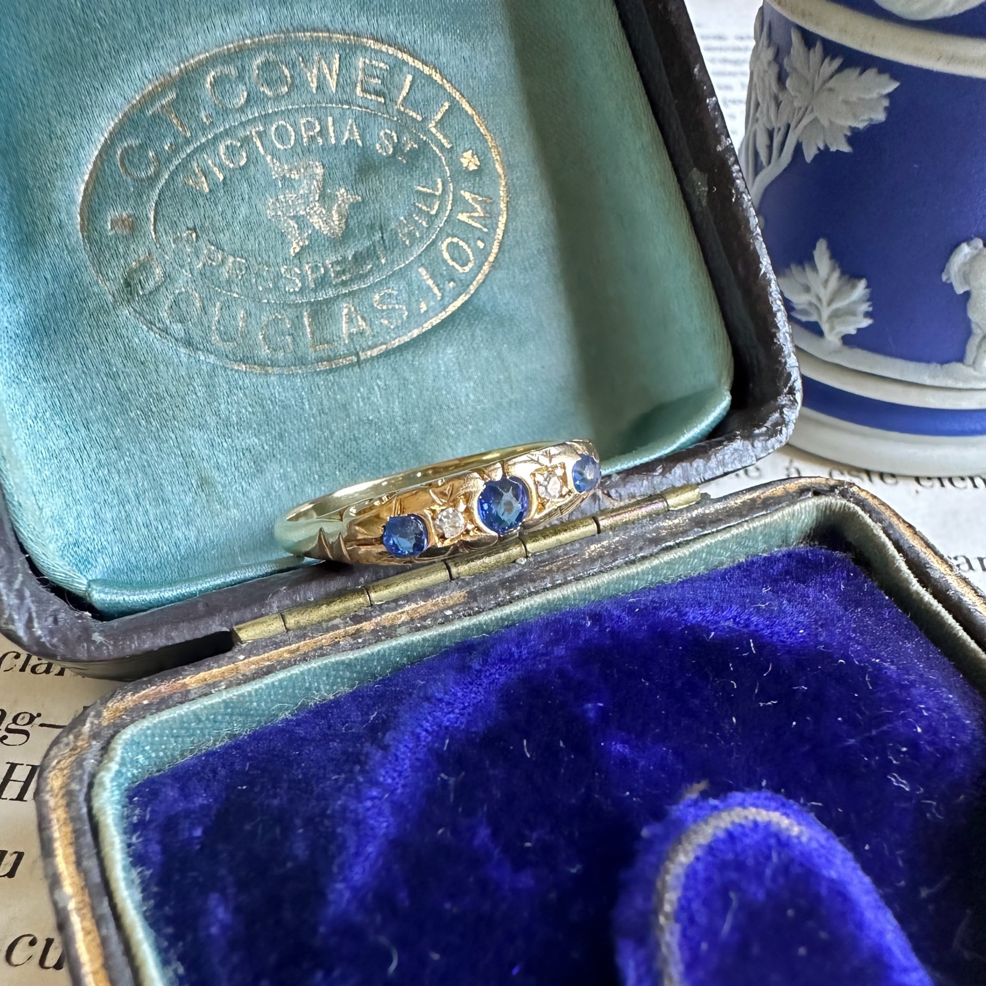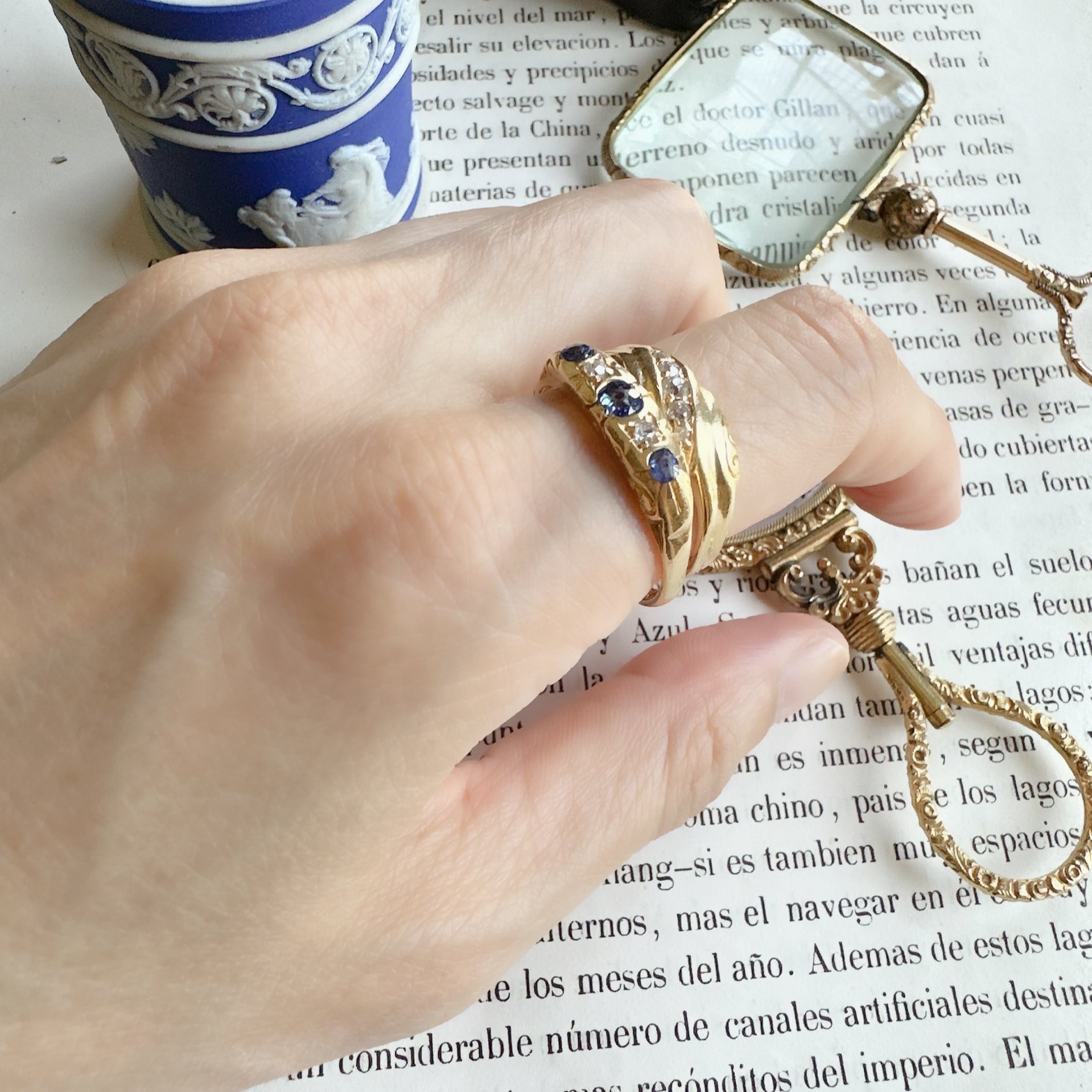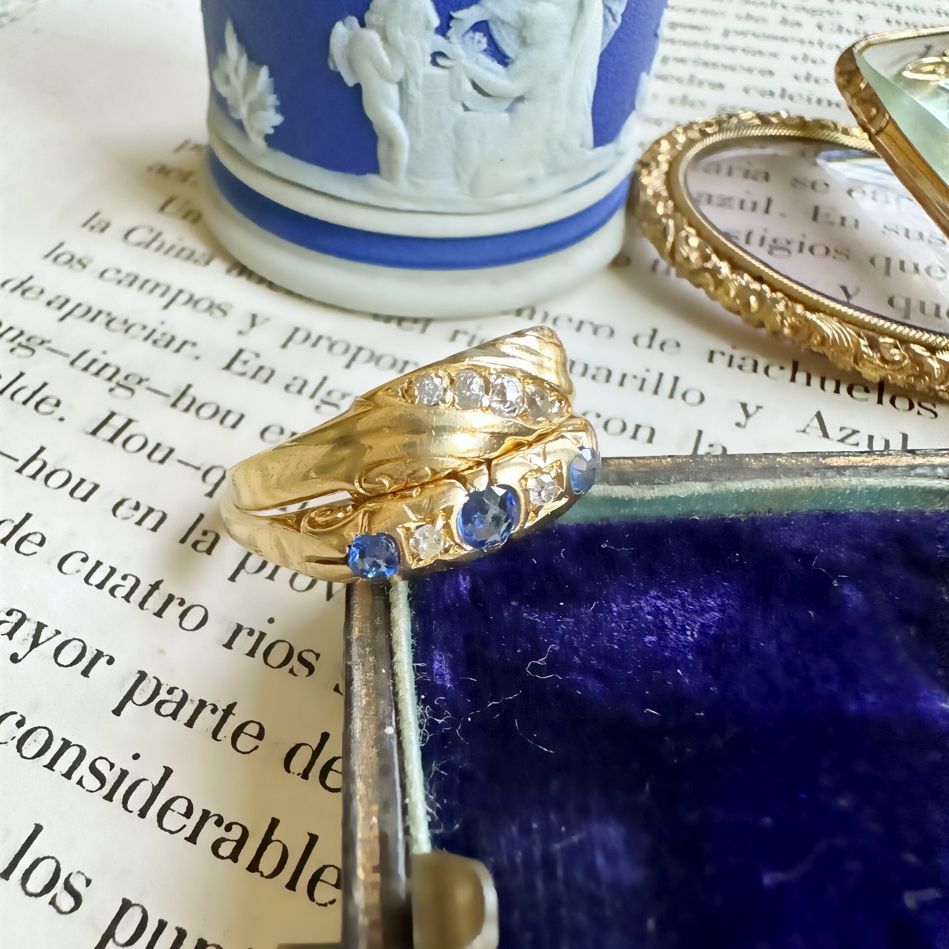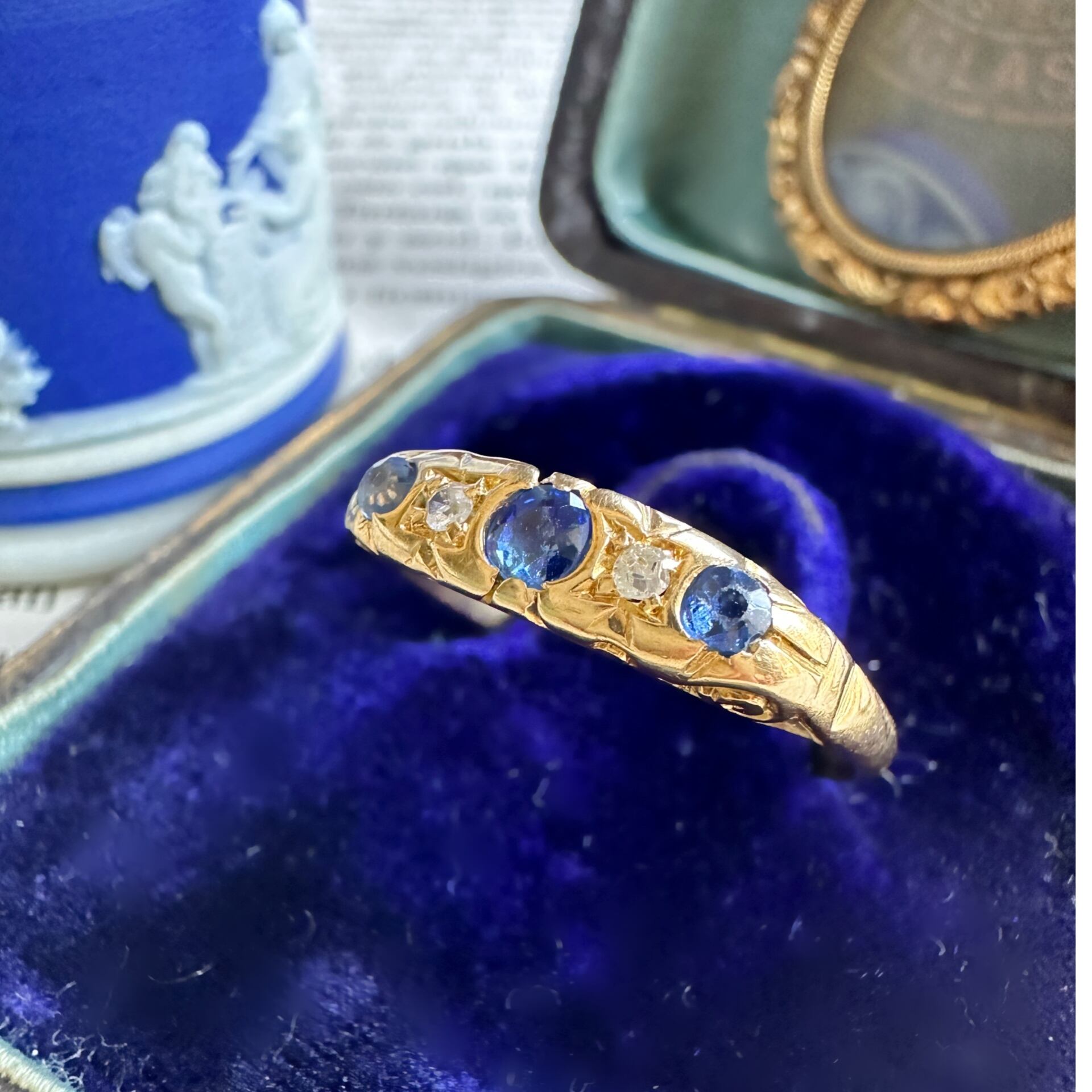フェイスにはアンティークらしく色味が少し違う3石のサファイアとその合間にオールドシングルカットダイヤモンドがセットされ、エレガントでクラシックなデザインが特徴です。