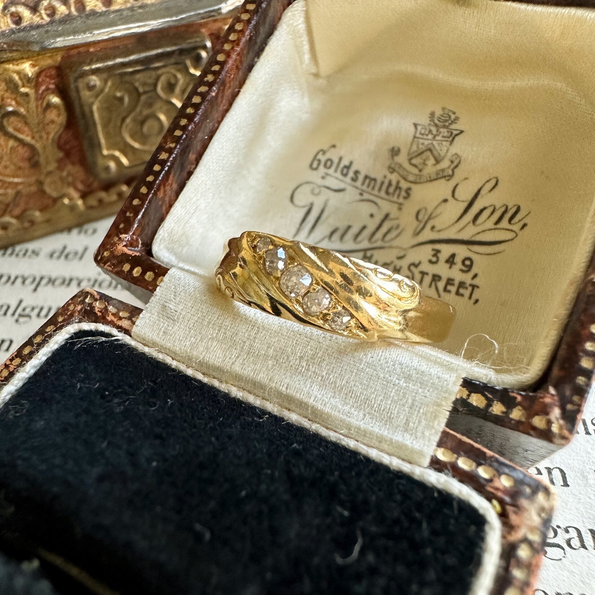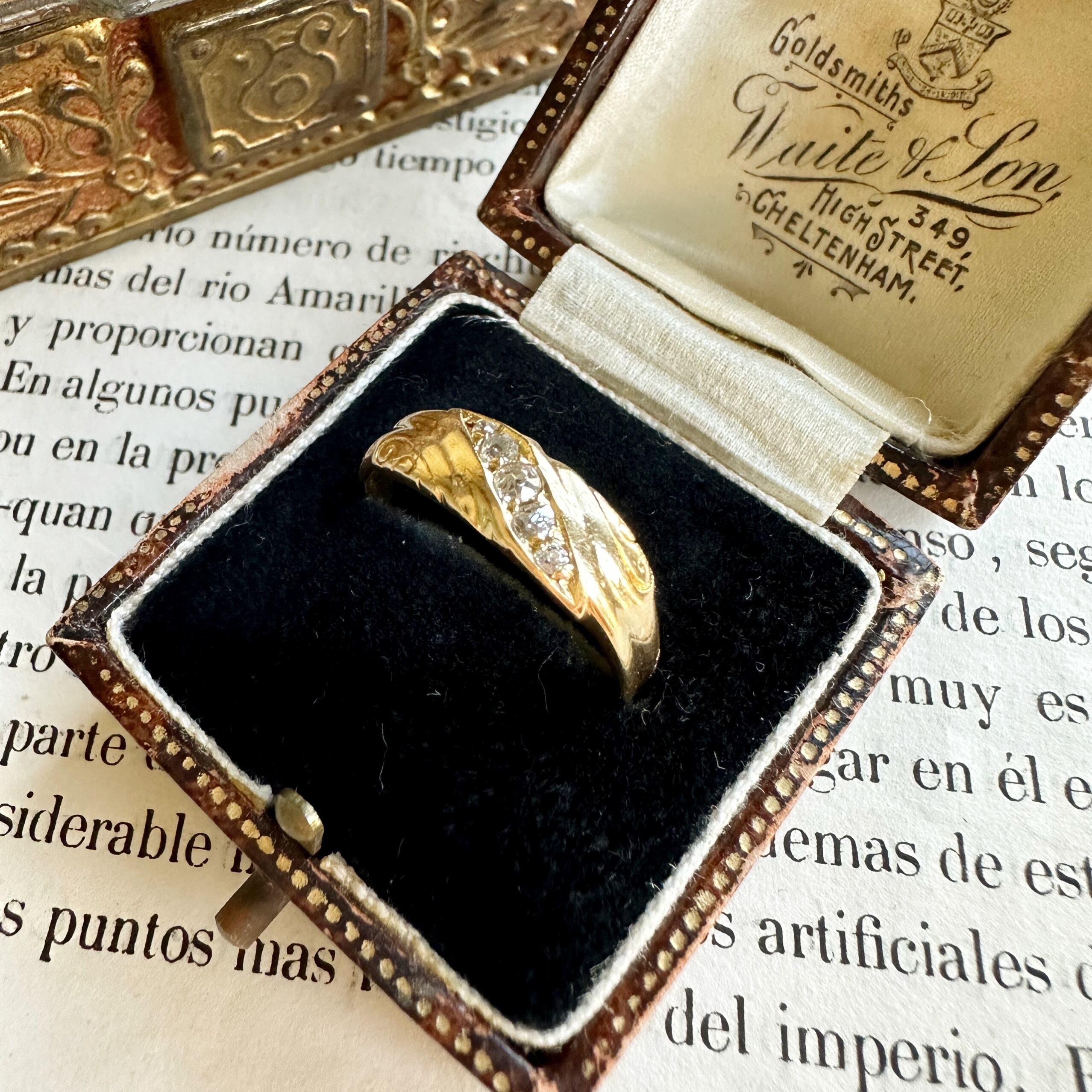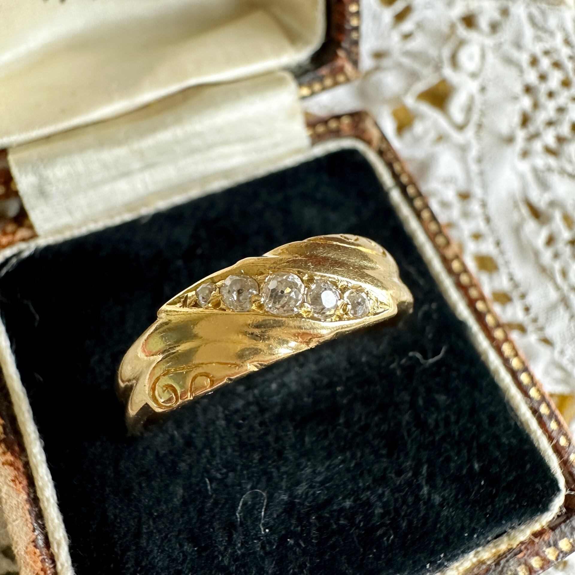 リングに輝く5つのオールドマインカットダイヤモンドは、星のようなきらめきで、穏やかな光を灯し、特別な瞬間を永遠に刻むための宝物です。