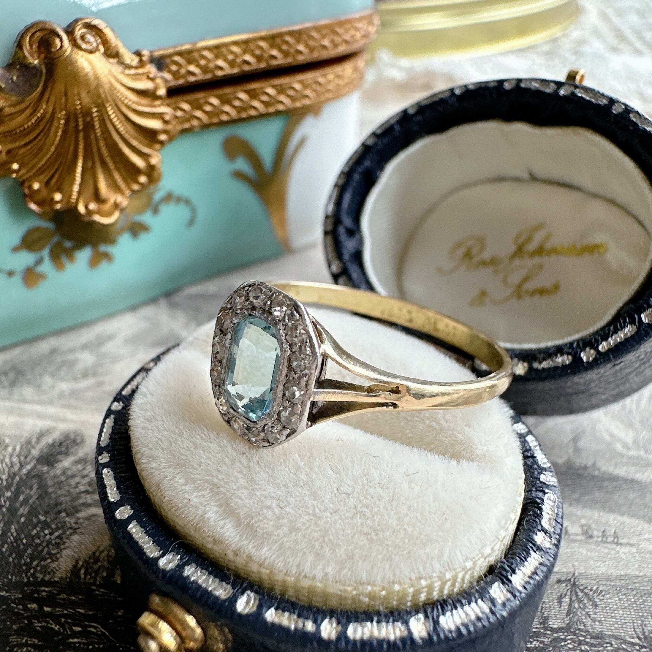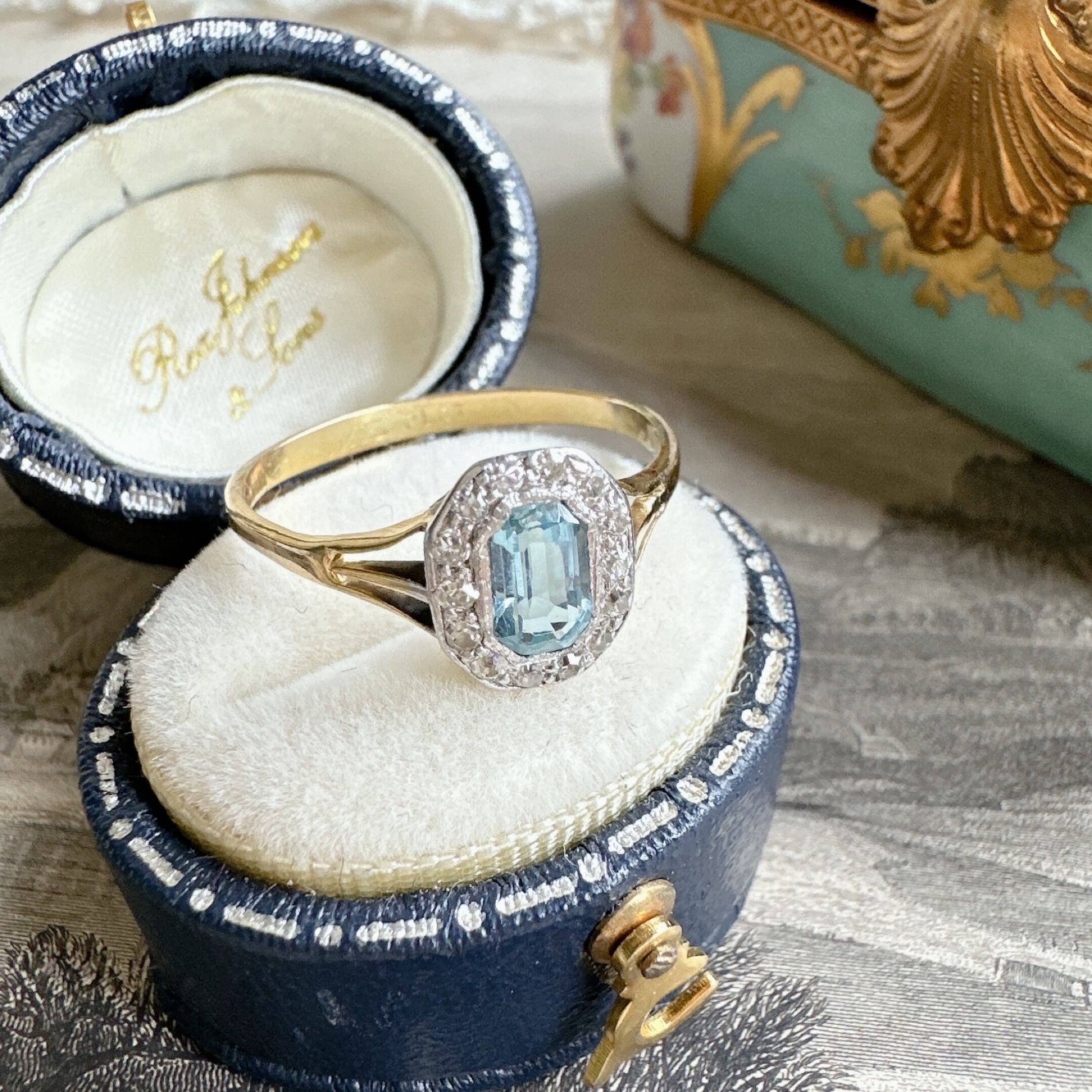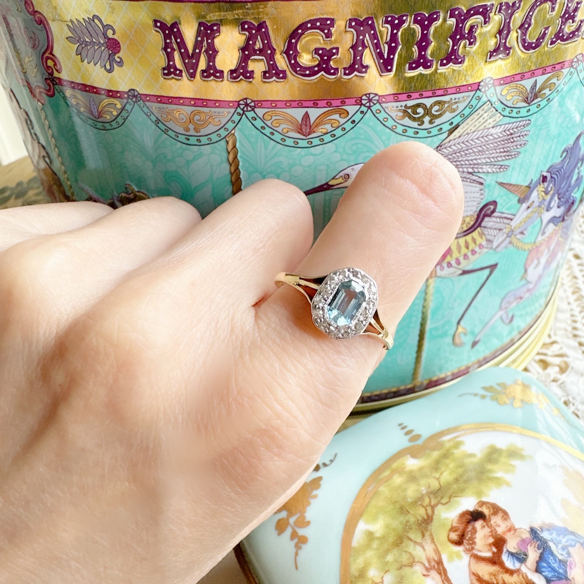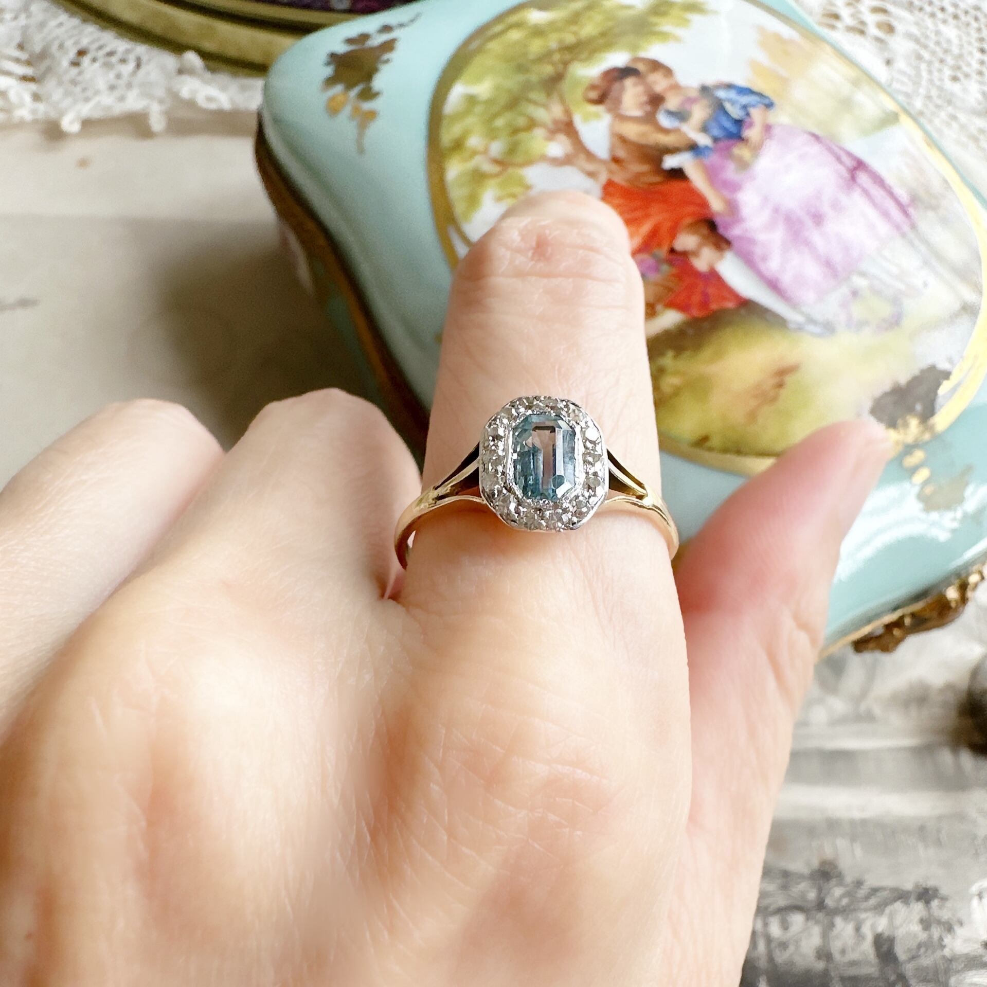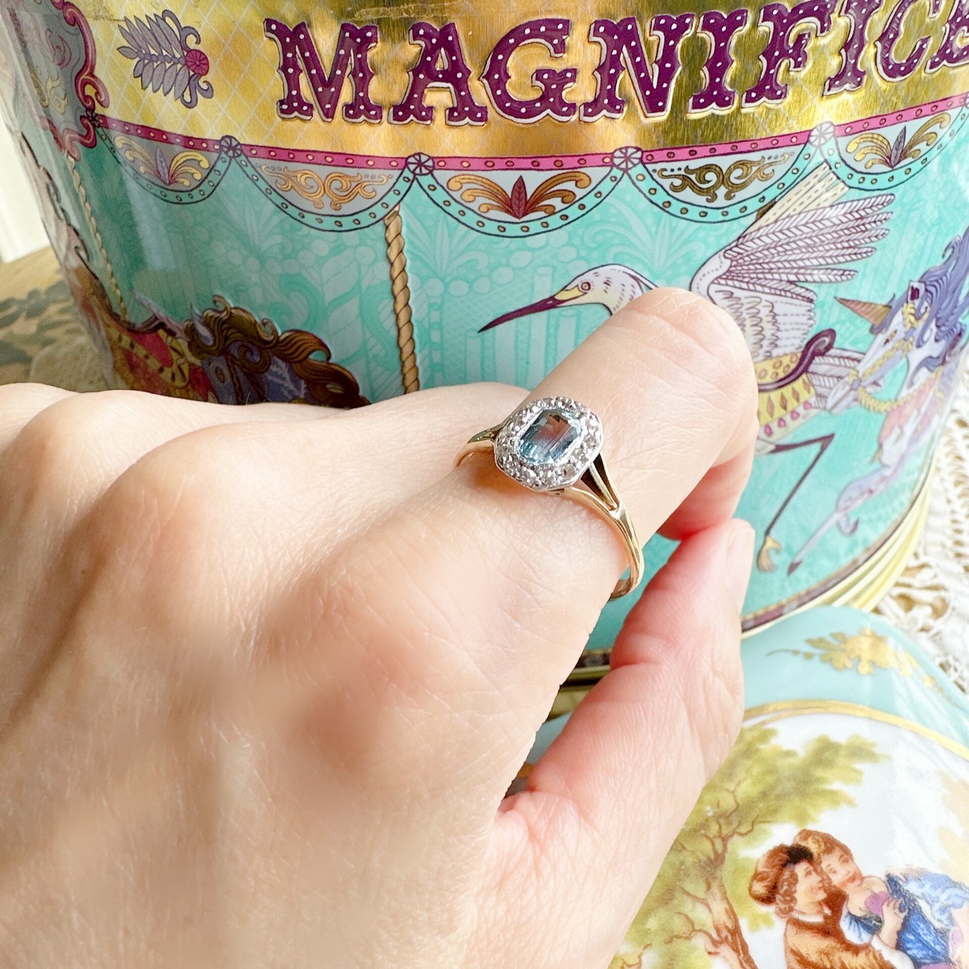 アクアマリンの色が、この時代のジュエリーに魅力的な鮮やかさをもたらした、とっておきのリングです。