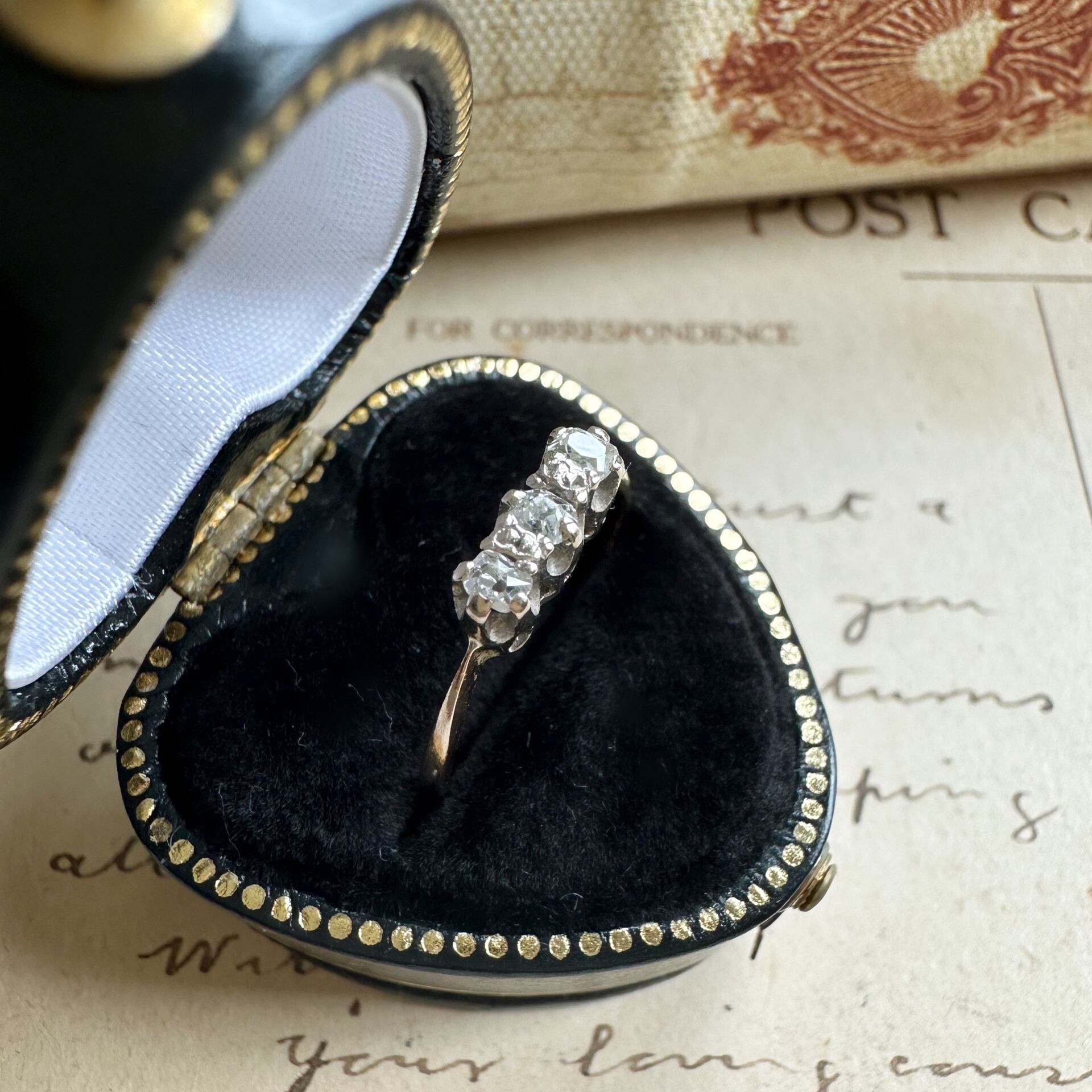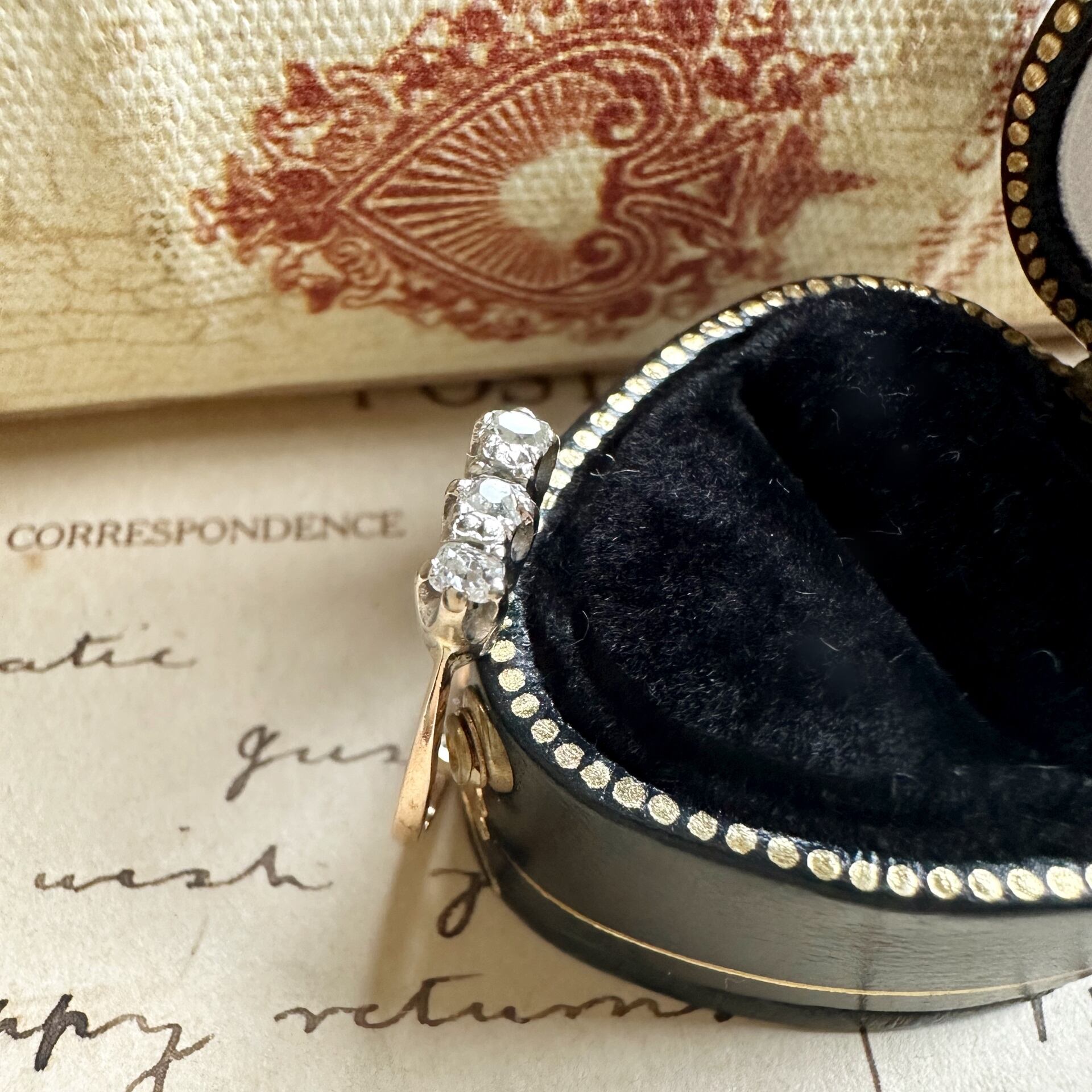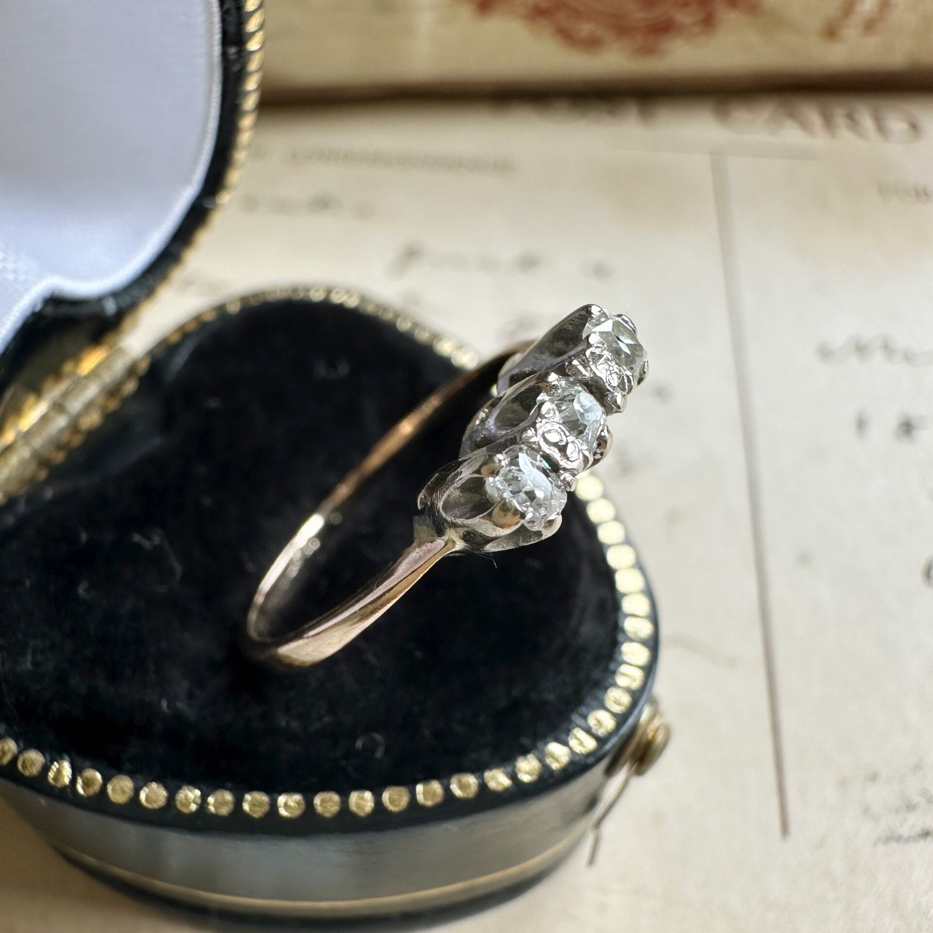 こちらの三粒の小さなダイヤモンドは一見するとそれがアンティークダイヤモンドであるかわかりませんが、ルーペでのぞいたり、カメラをズームにしてみると初めて見えてくる世界が広がっているのです。