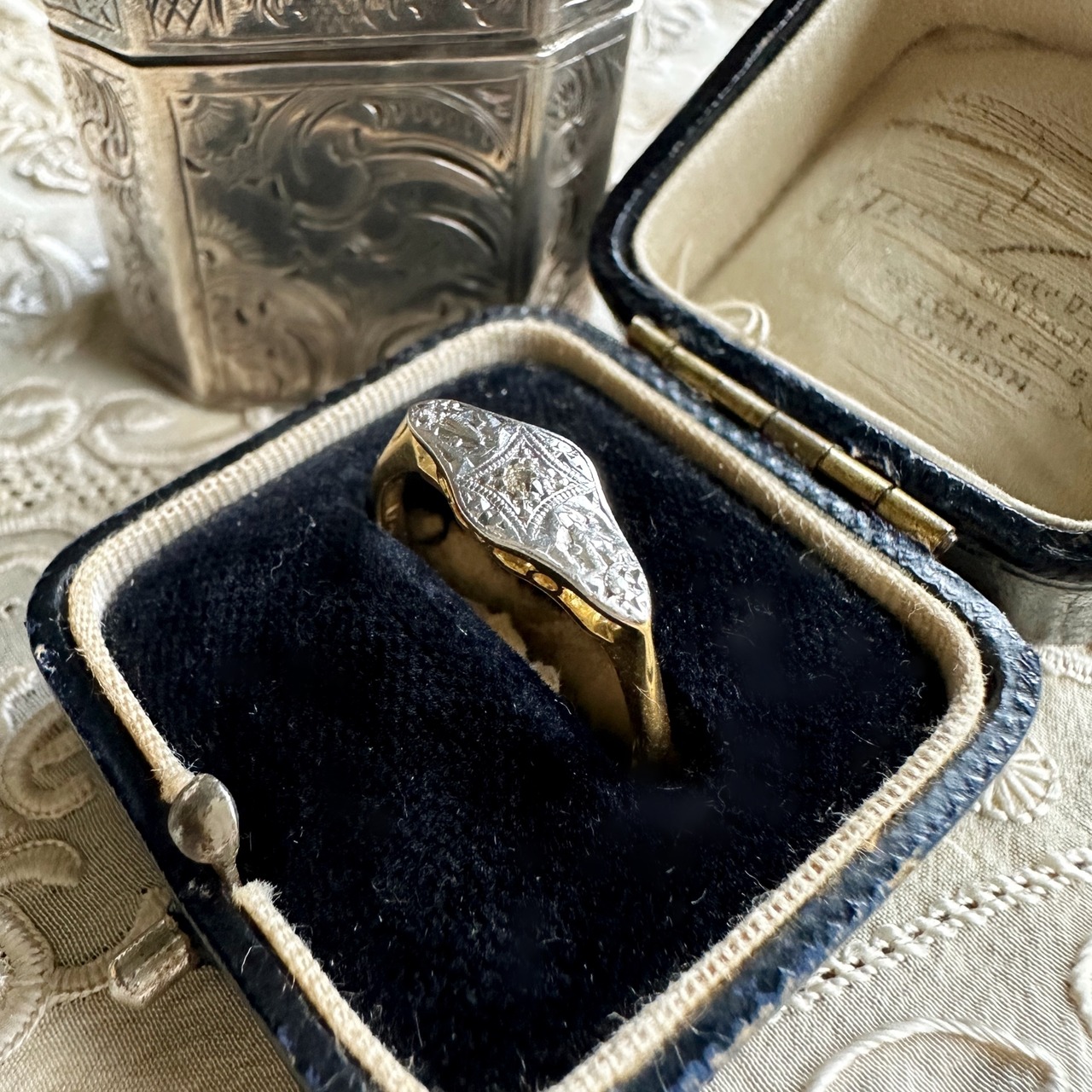 緩やかな曲線がフェミニンな菱形のプラチナフェイスに施された彫金が、まるで宝石のように輝き、手仕事の繊細さが見事に表れている美しいリングのご紹介です。