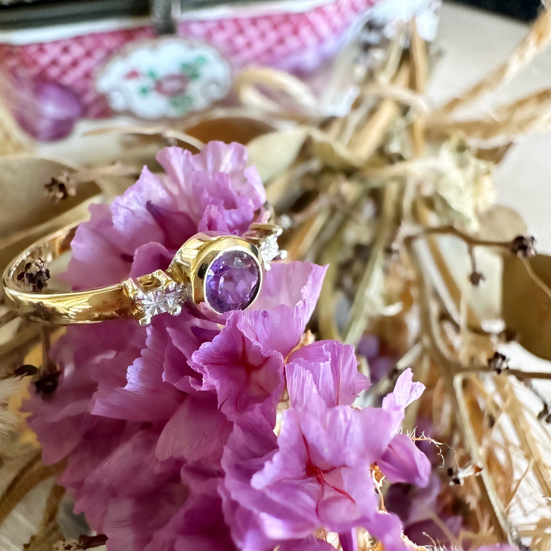 そのシンプルなブリティッシュヴィンテージリングにセットされた小さなアメシス、その小ささ故に、守ってあげたくなるほどの優しげな空気感がたまらなく可愛いひと品です。