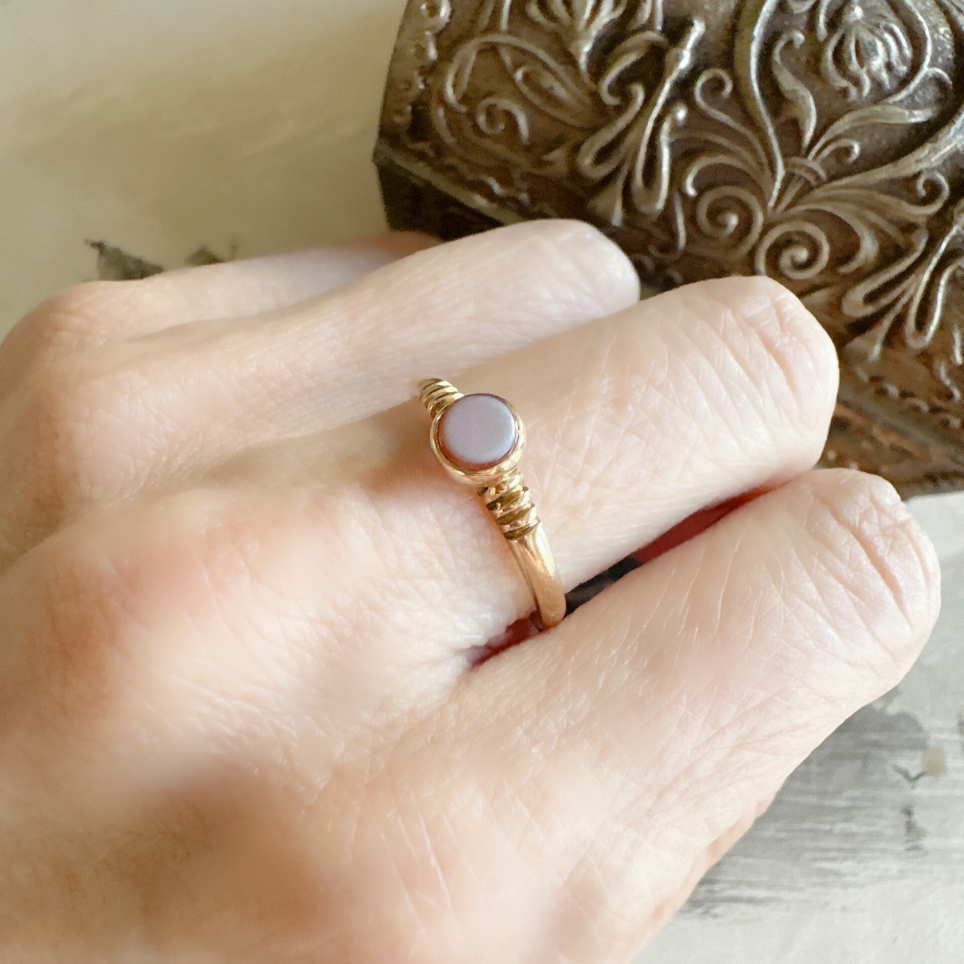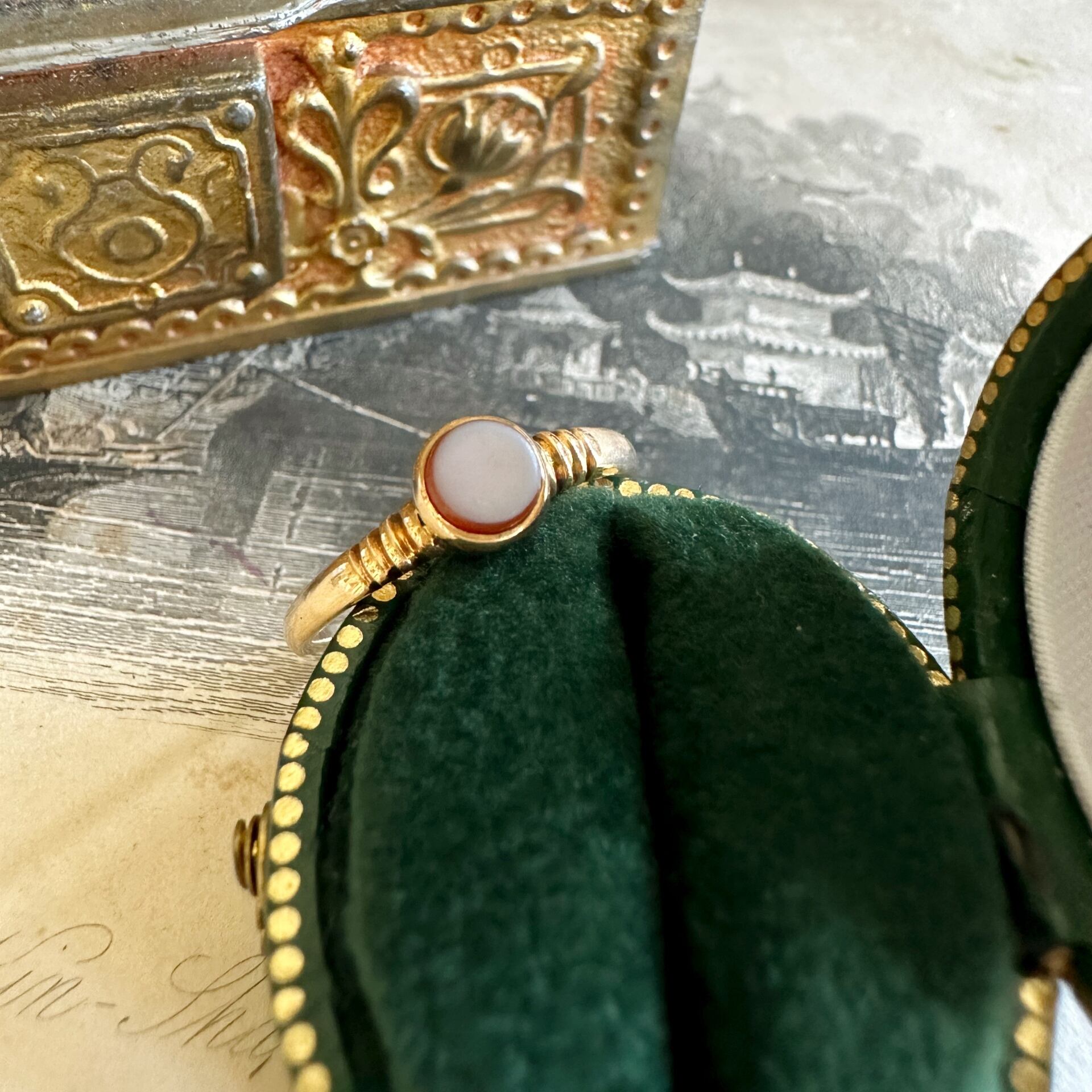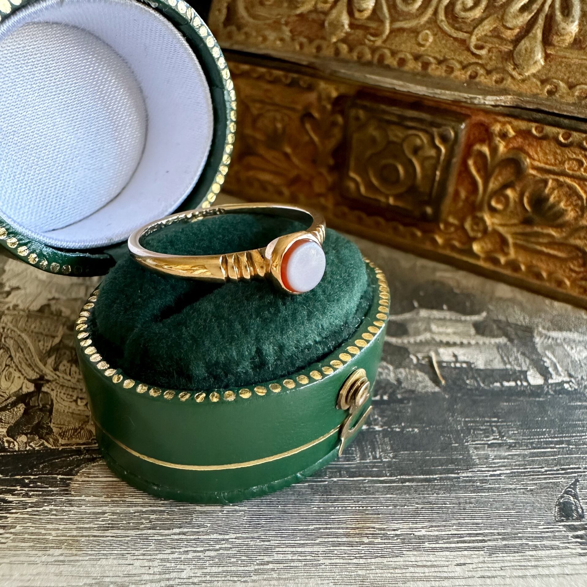 このオレンジと白の二層でできたサードニクスをセットしたアンティークリング、まん丸の形状が、その可愛らしさを一層引き立てていますね。
