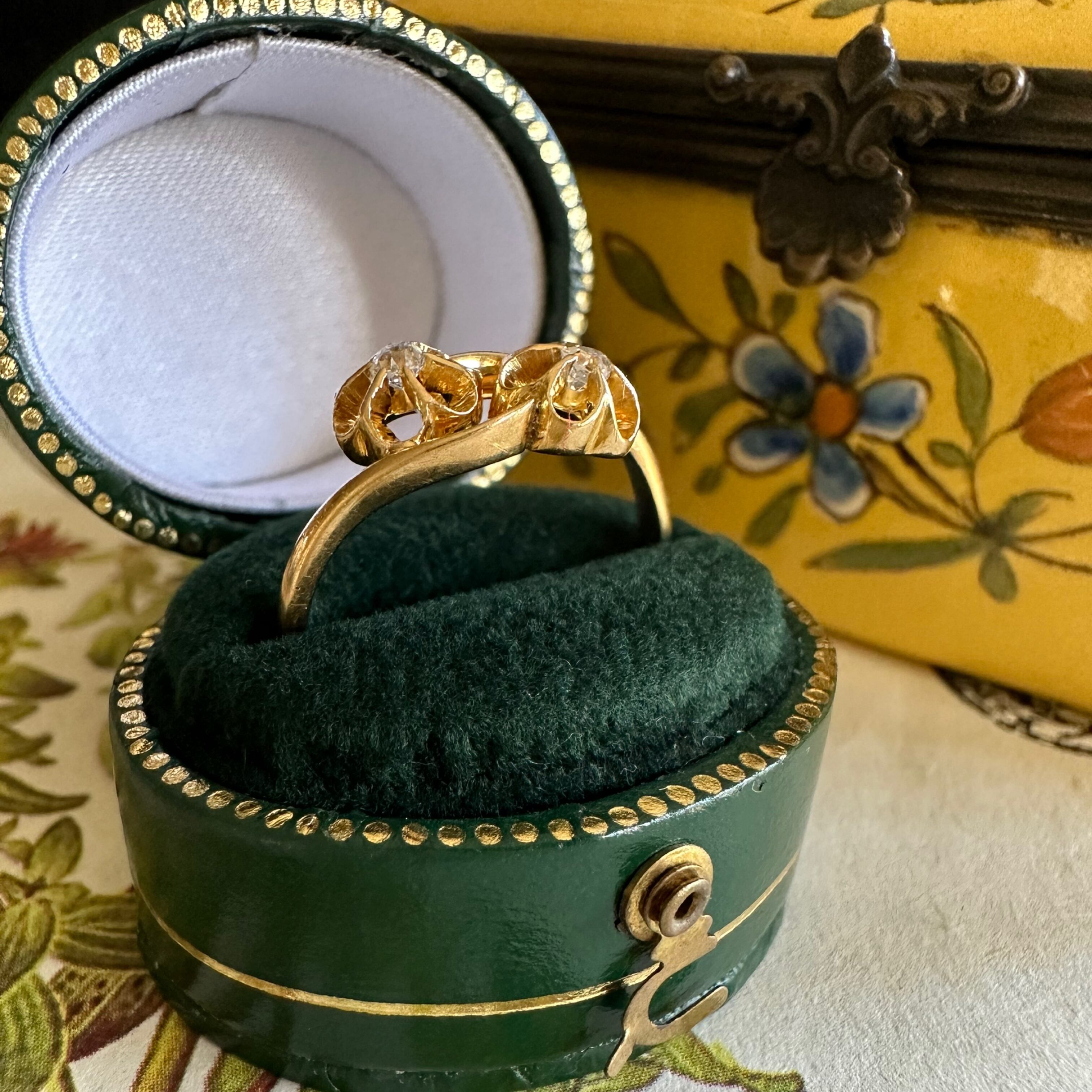 18金のイエローゴールドを用いたこのクロスオーバーリングは、まるで愛の交差点に立つような美しさを持っていますね。