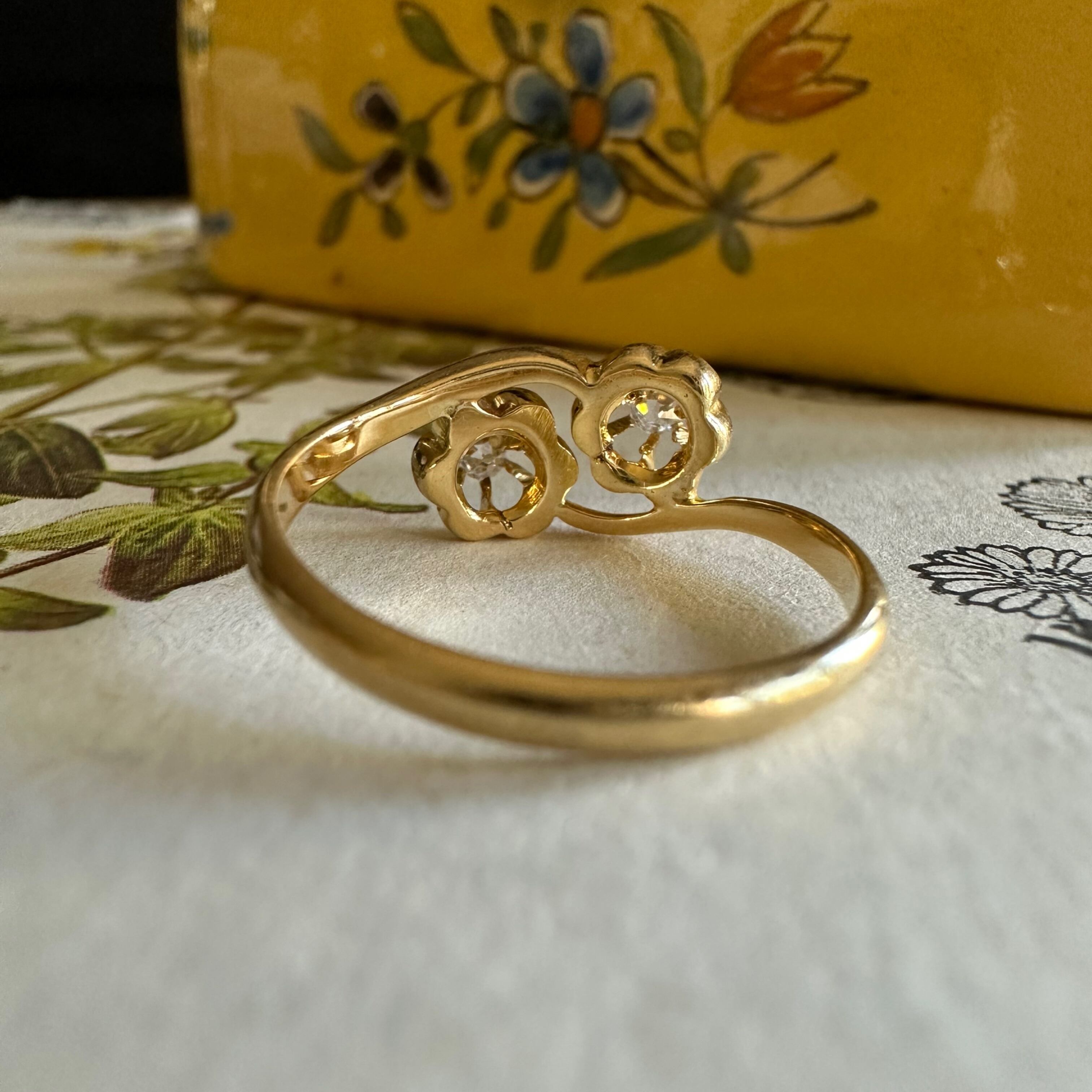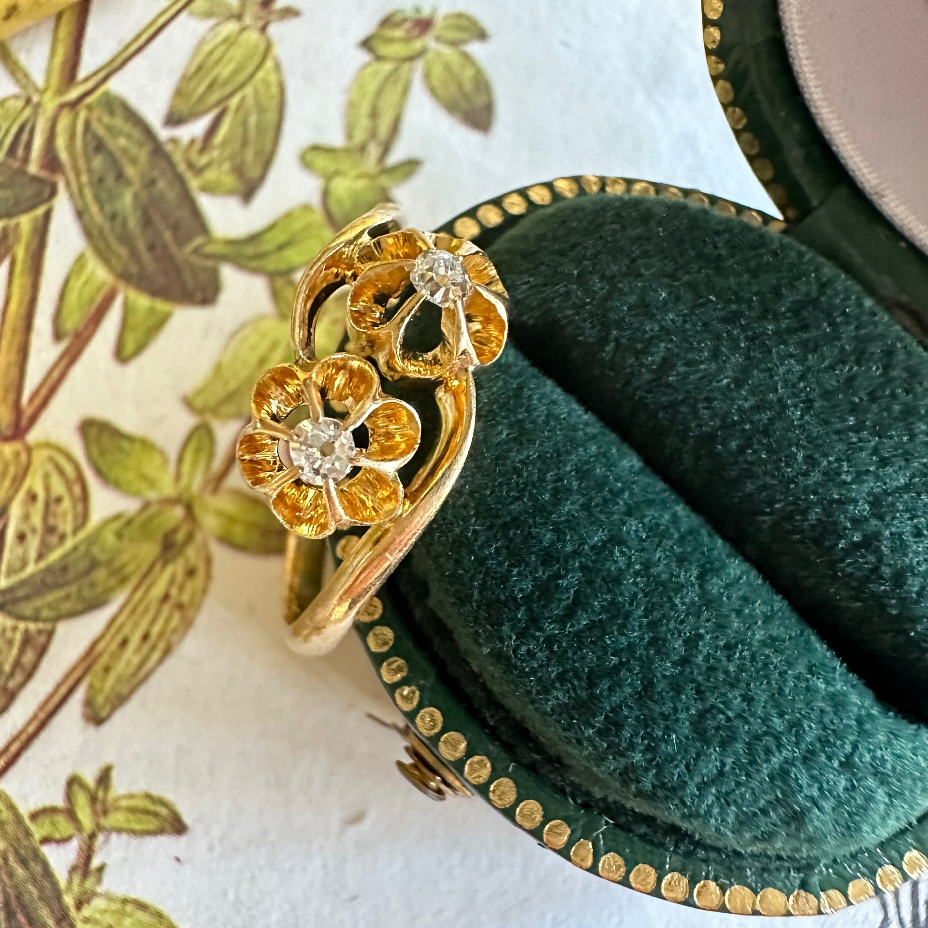 バターカップの花が斜めに2つセットされた優美なデザインが特別な、toi et Moi(あなたと私)リングのご紹介です。