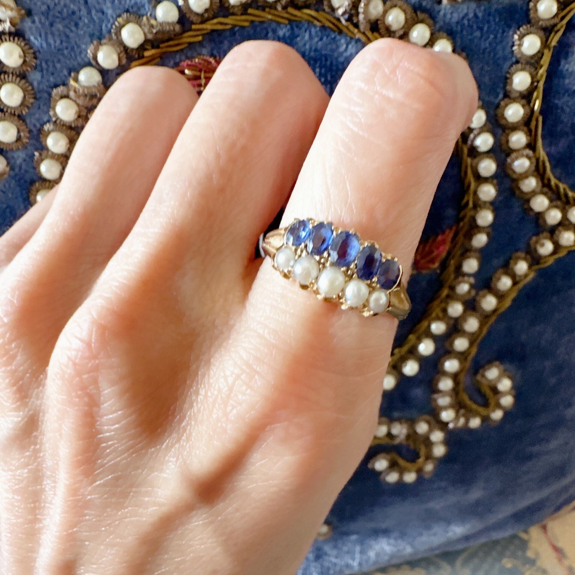 このタイプのダブルリングは今では市場に滅多に出会わない希少な宝石の一つです。現代では、多くの宝石が量産されており、希少性が減少していますが、このリングはまさにその逆です。その天然真珠と美しいサファイアが組み合わさった本当に贅沢なひと品はコレクションとして持っておくのにもオススメですよ。