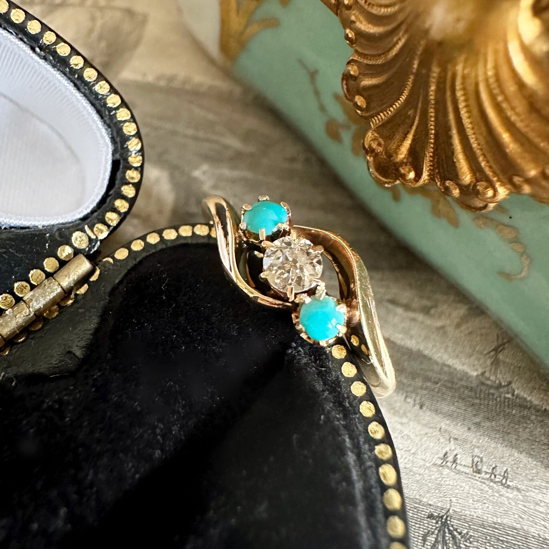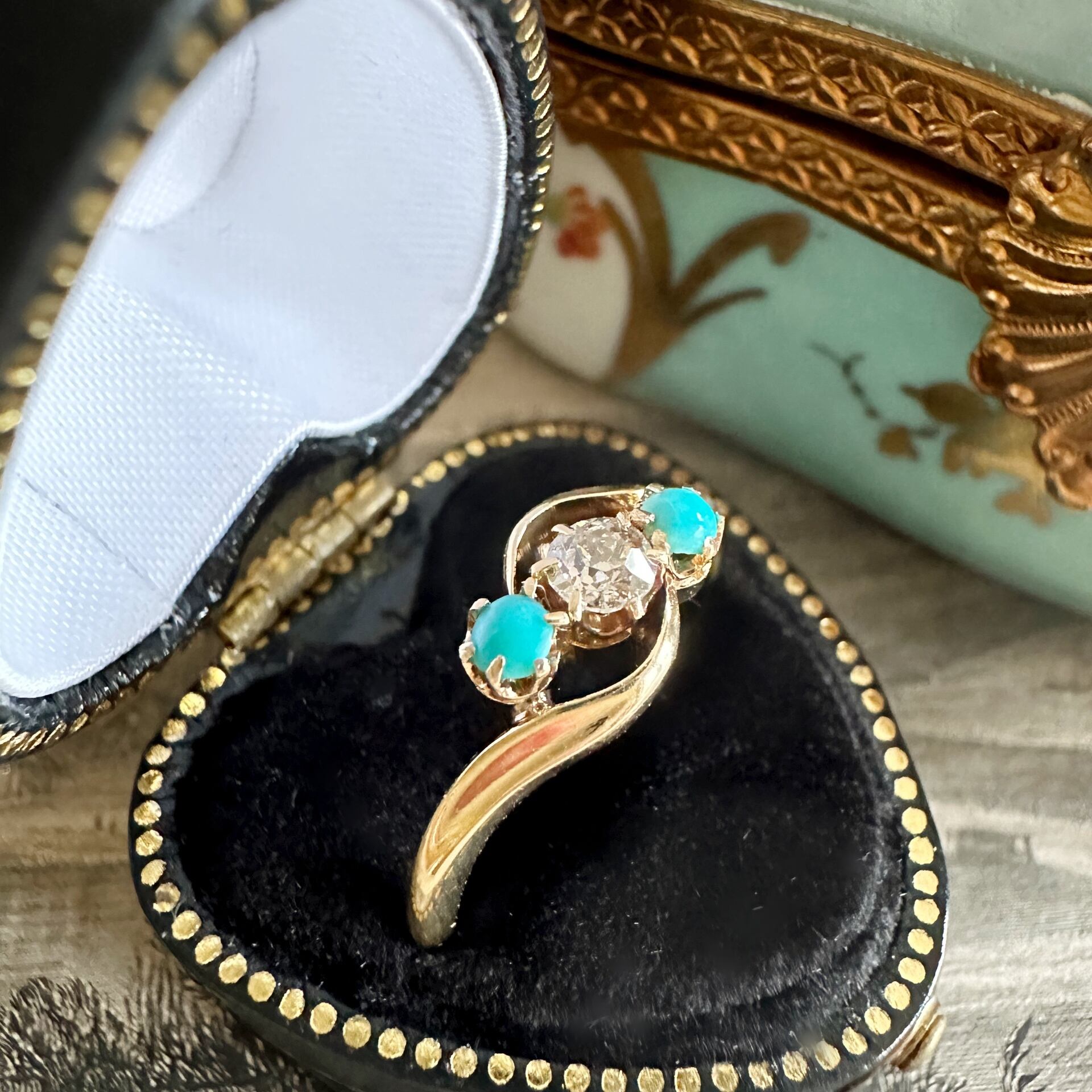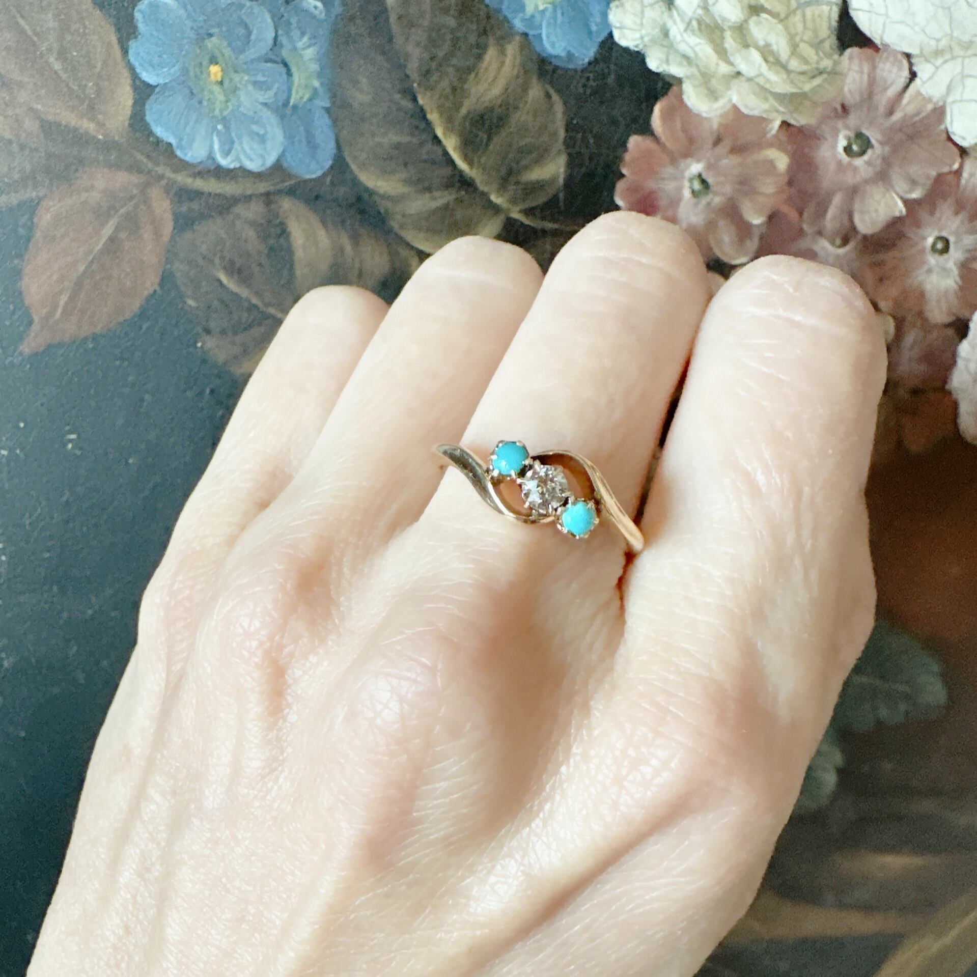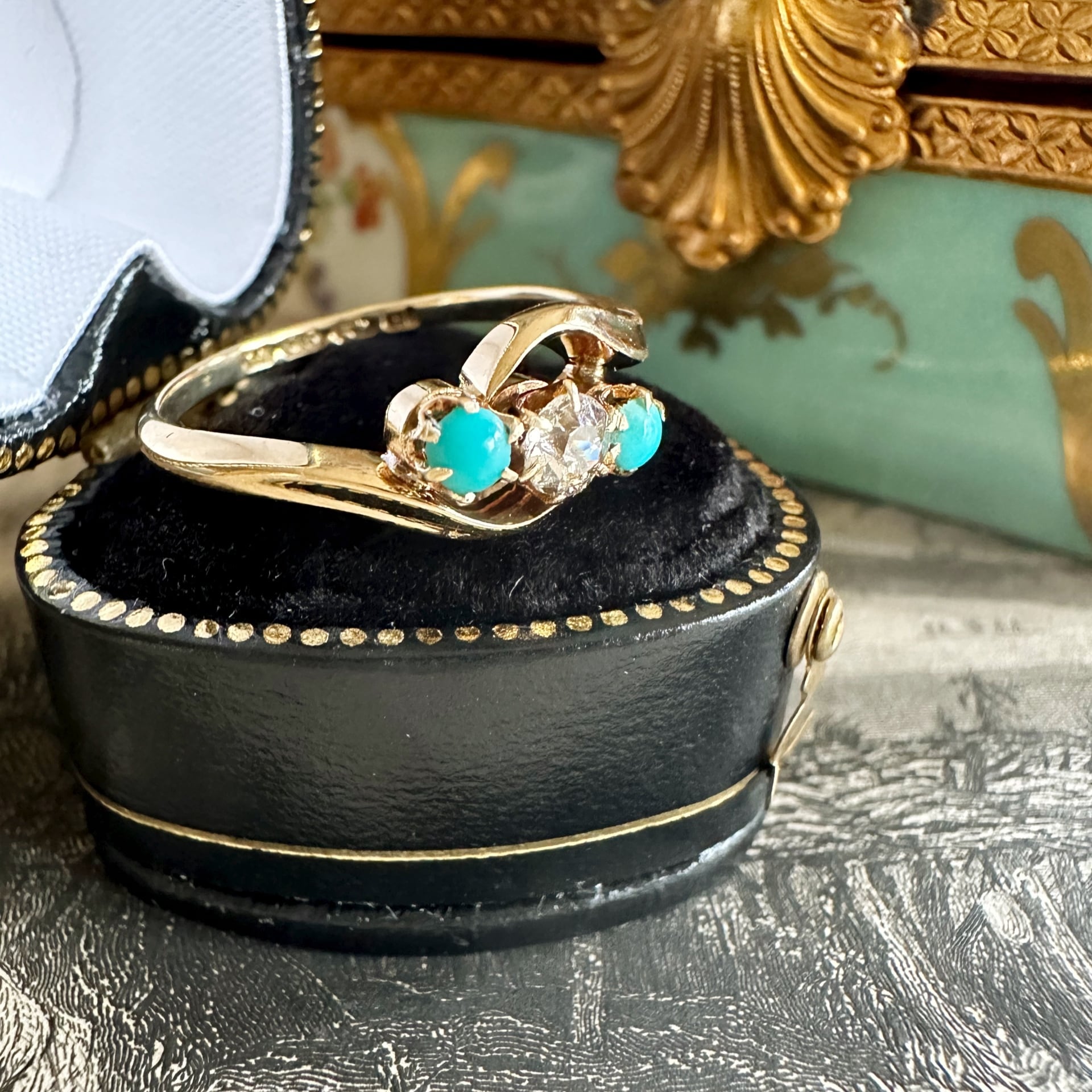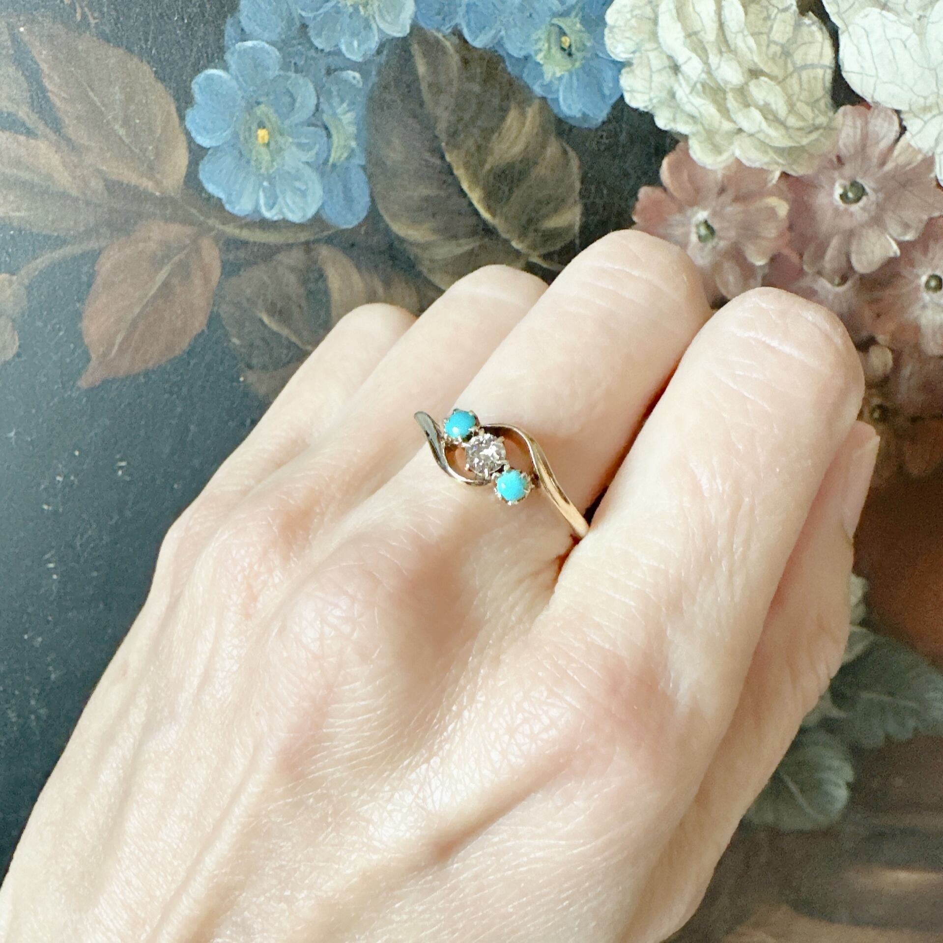 オールドヨーロピアンカットダイヤモンド&ターコイズ トリロジークロスオーバーリング
