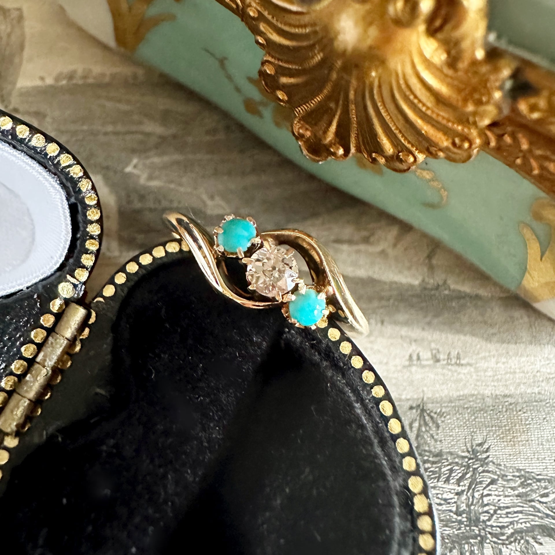 ターコイズはヴィクトリア女王のお気に入りの宝石であり、ヴィクトリアンジュエリーには、このリングような素敵なターコイズジュエリーが数多く存在します。1915年はエドワーディアンになりますが、まだヴィクトリアンジュエリーの影響も随所にみられますね。