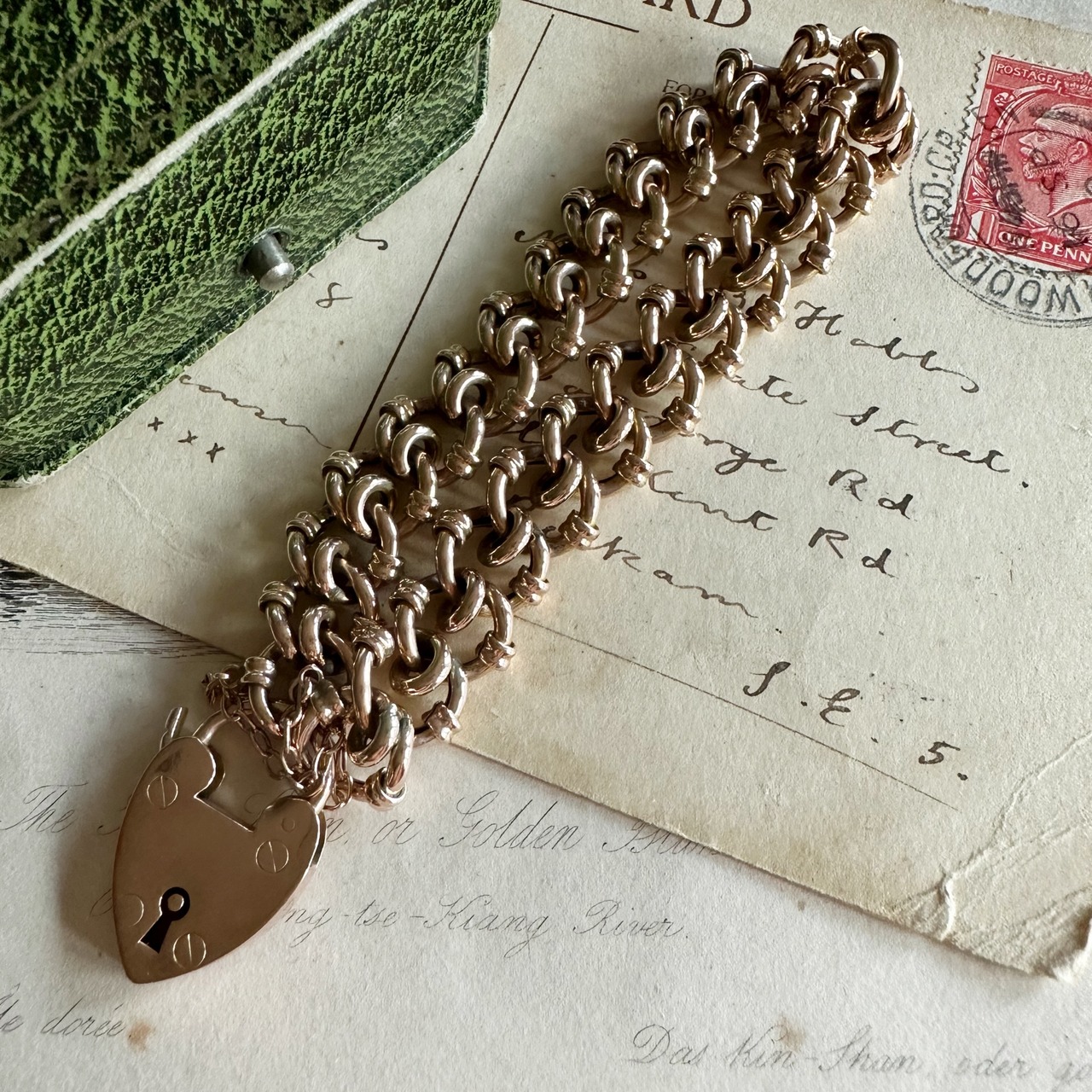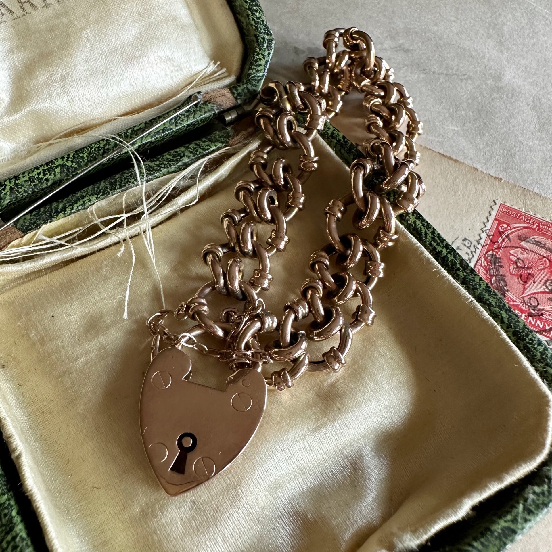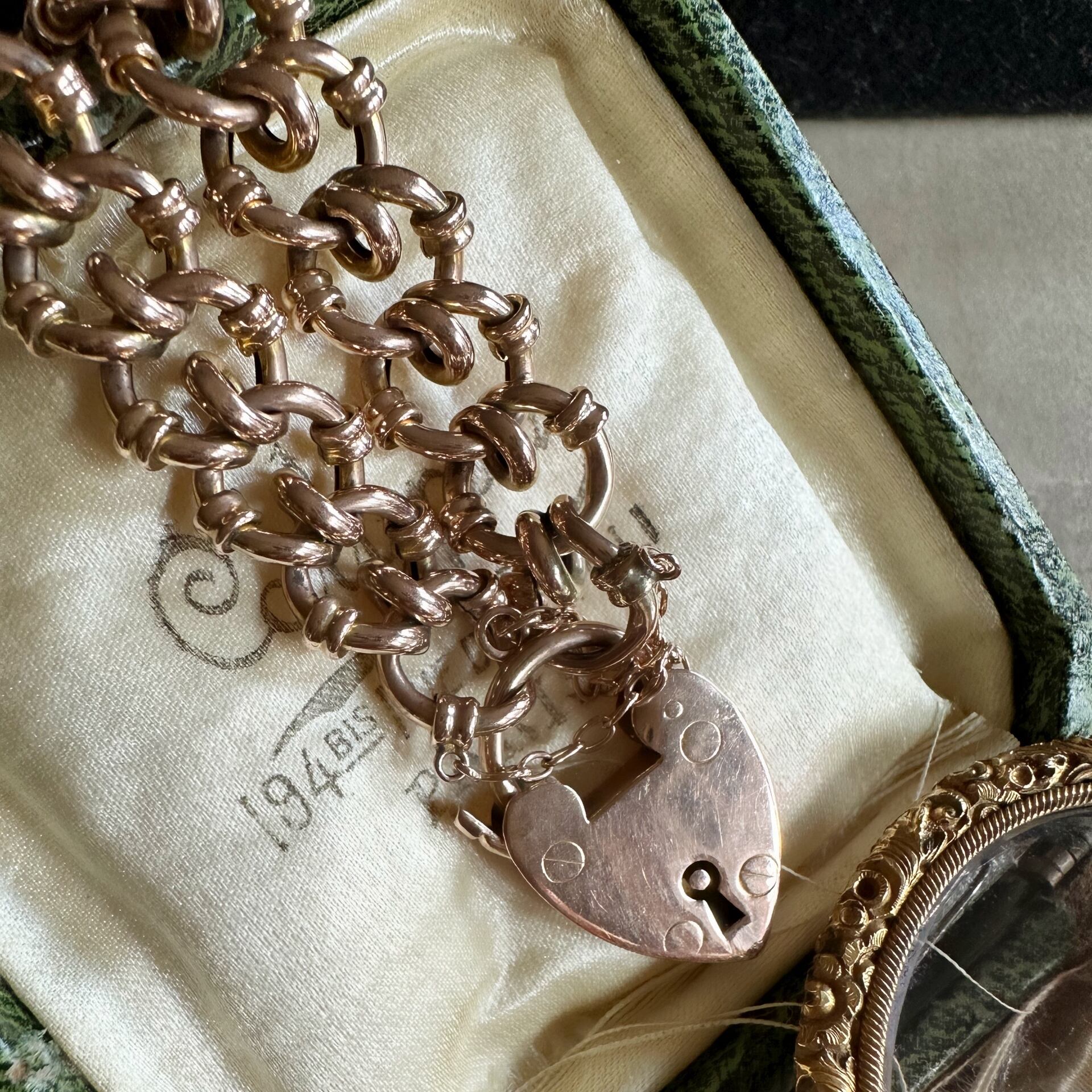 バンブーを連想させるオリエンタルなデザインは、ヴィクトリアン時代におけるオリエンタルブームの流行を思い起こさせ、地金が織りなす印影がとても美しいハートのパドロックがついたチェーンブレスレット。