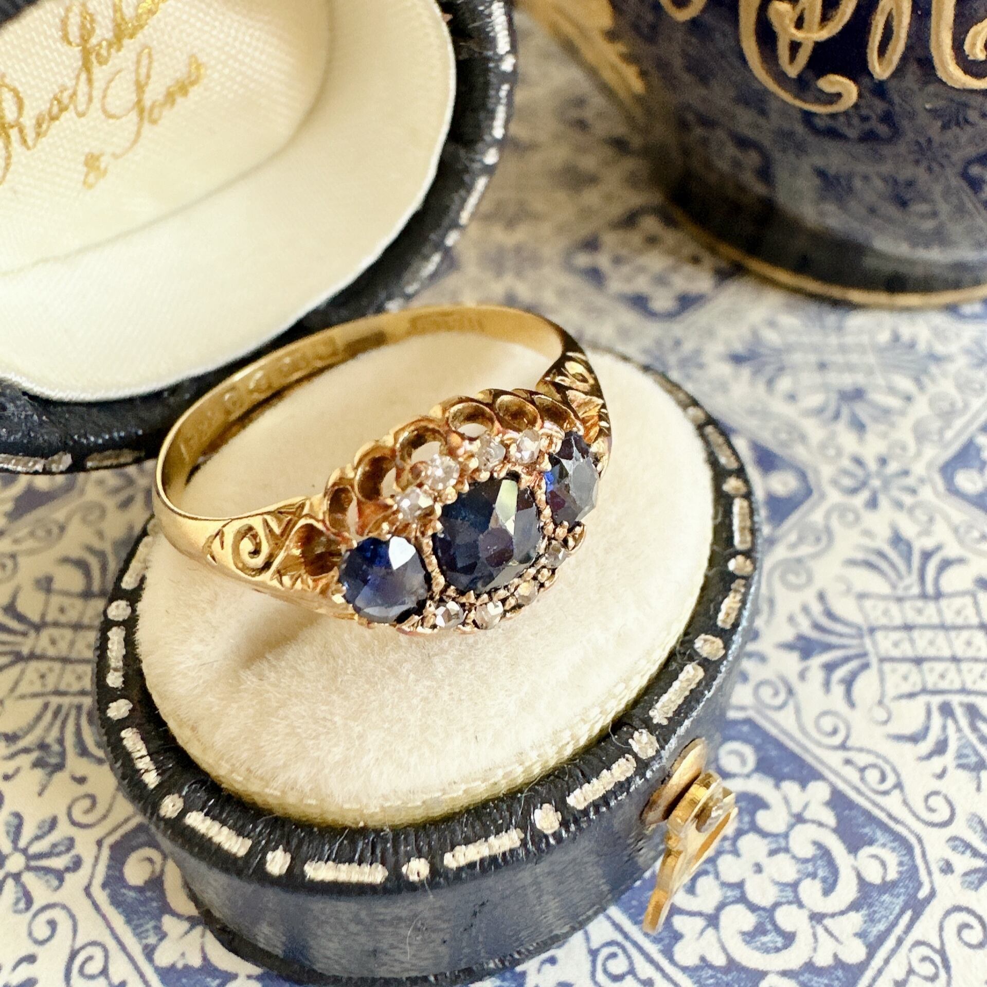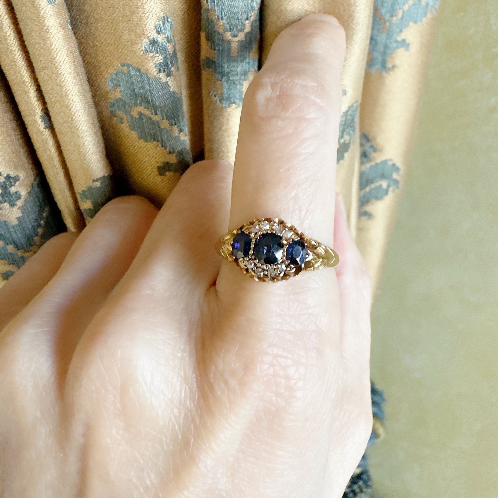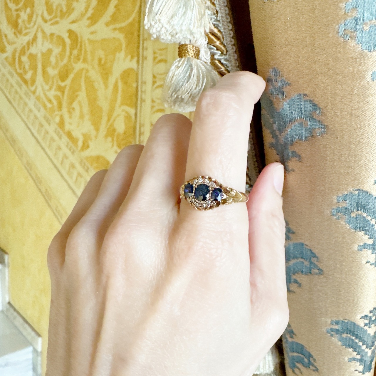 3石の立派なブルーサファイアが、重厚であたたかな雰囲気を醸し出す暗めの濃深な色合いを放ちながら、小さなローズカットダイヤモンドによって上品に囲まれたヴィクトリアンリング。