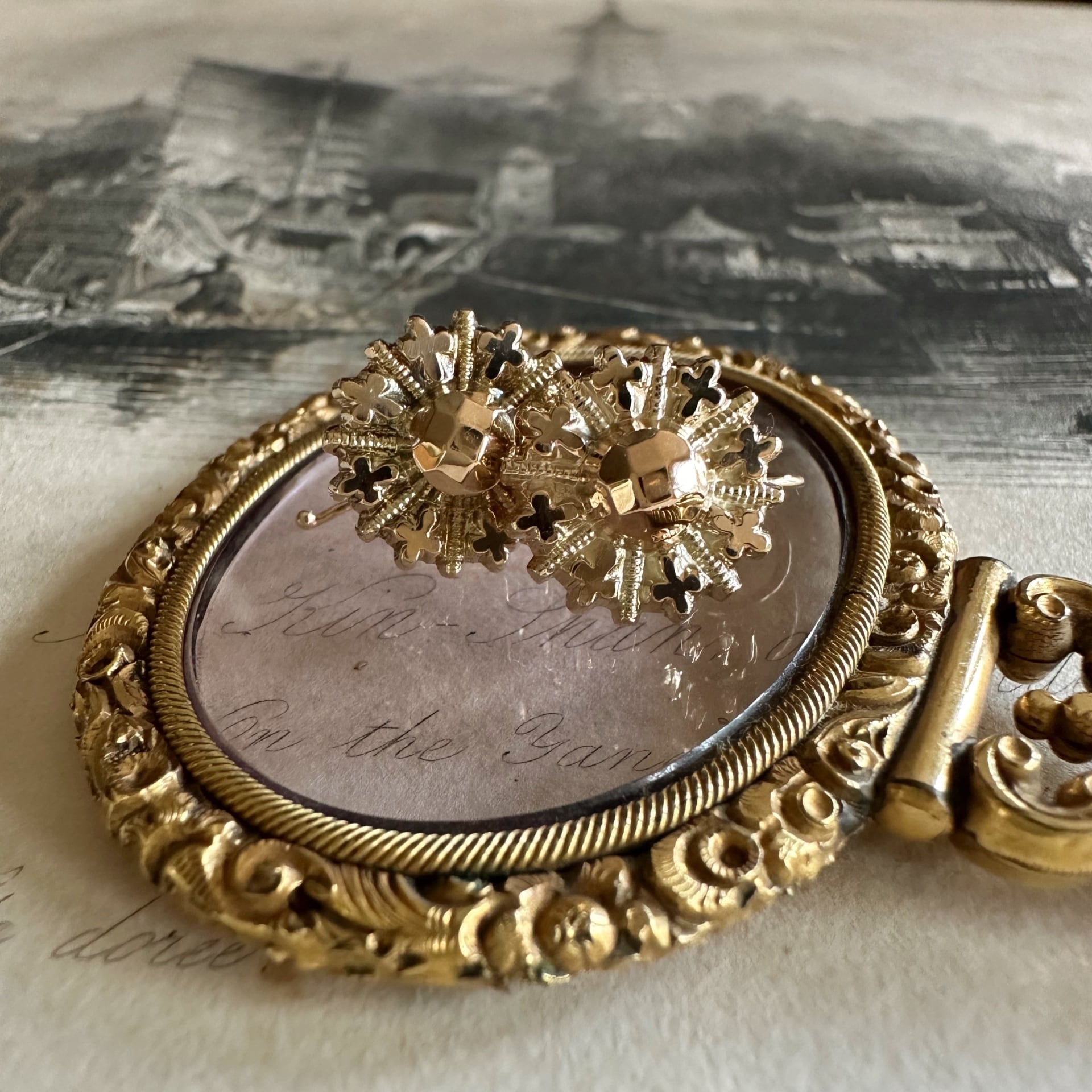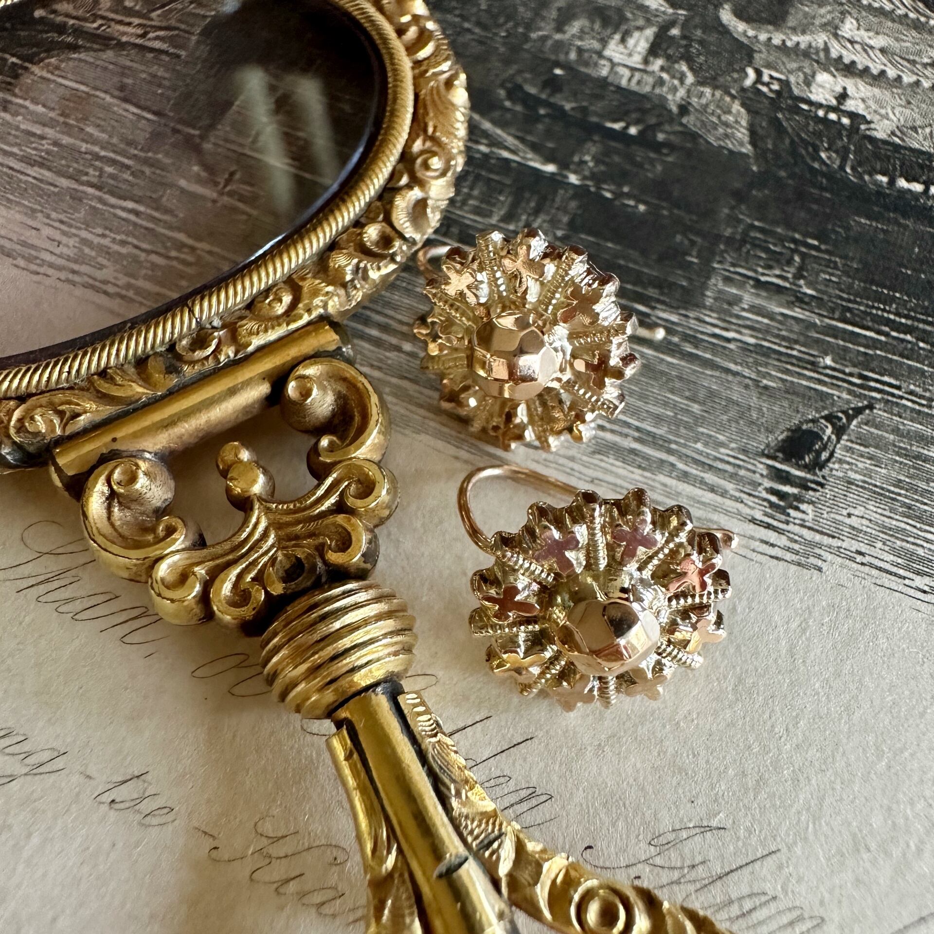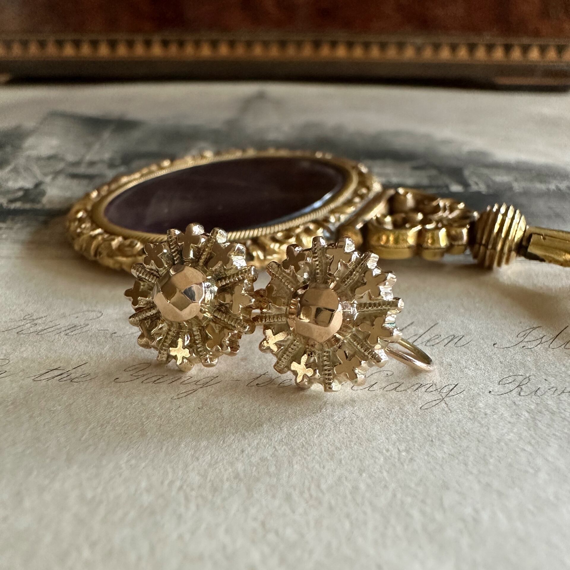 エトルスカン文化を讃えるヴィクトリアン時代の美しさが宿る、9金ゴールドのみで作られた煌めくピアス。