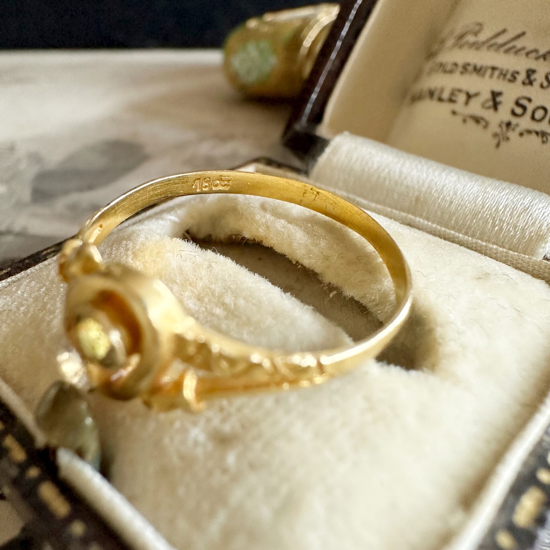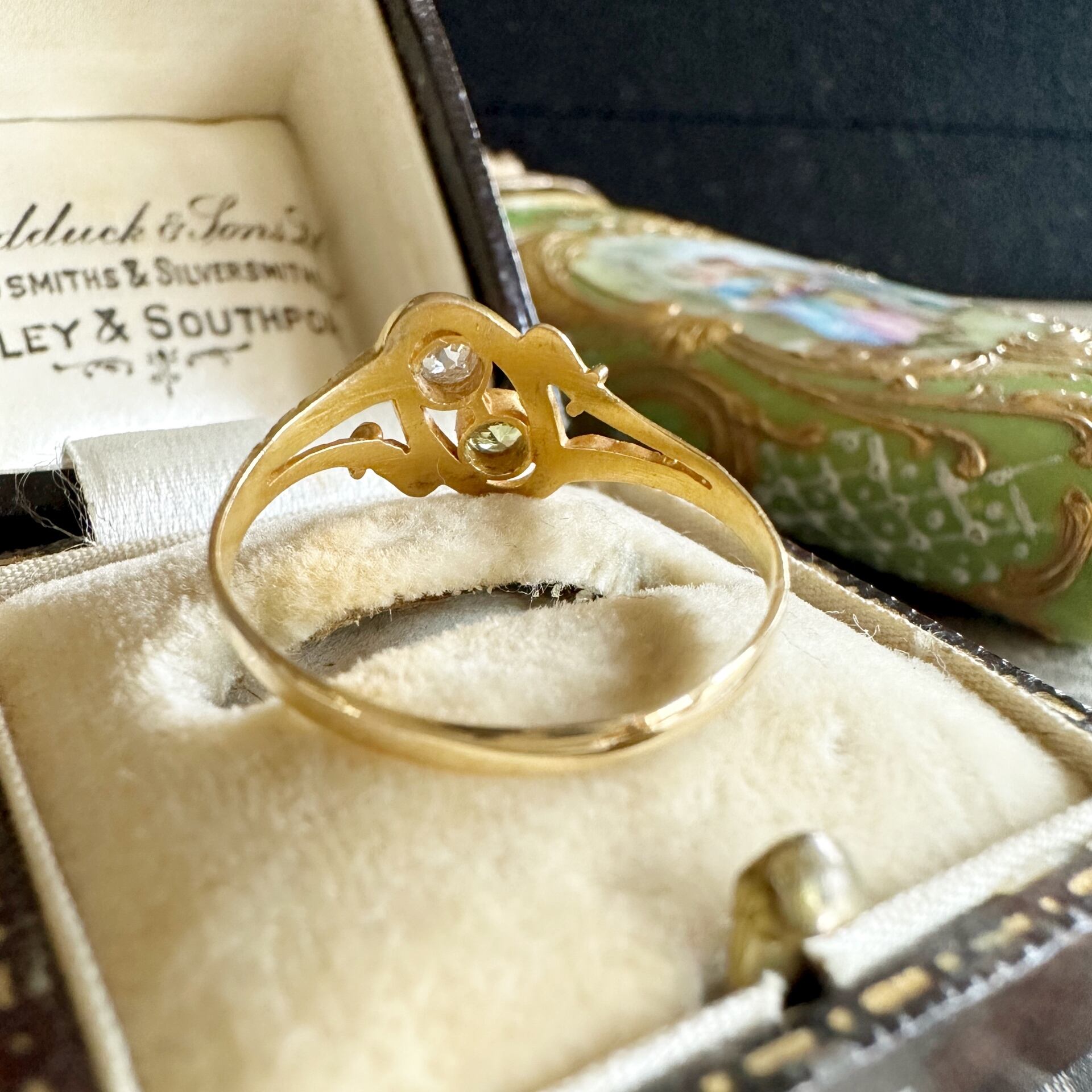 18金イエローゴールドの地金が華やかな舞台となり、オープンキュレットのオールドカットダイヤモンドとデマントイドガーネットの2石が優雅に縦斜めに輝くトワエモワリングのご紹介です。