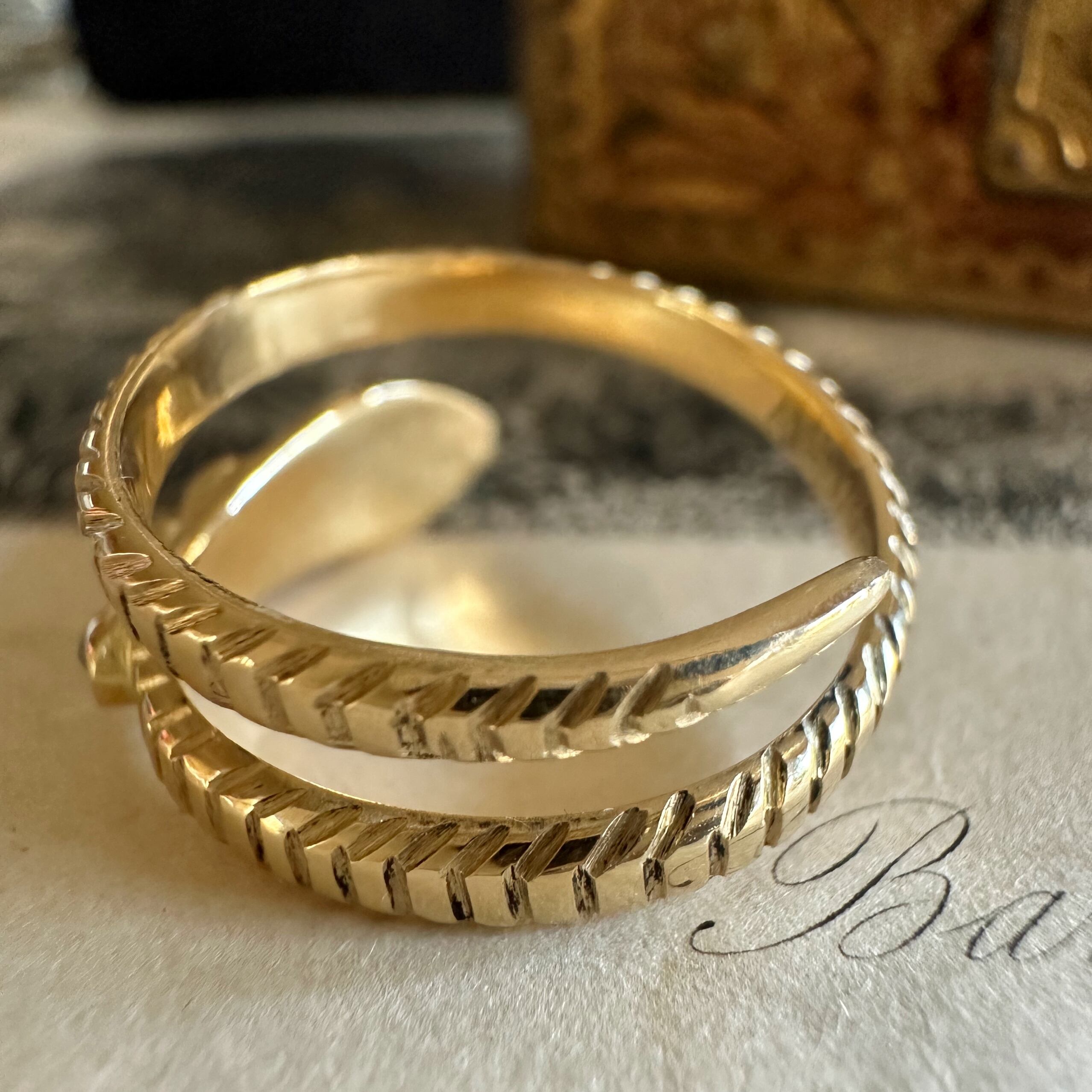 また愛らしい蛇の表情が、リングに親しみと温かさを添え、装着者との絆をより深く感じさせるように思います。コイル状に巻かれた胴体はしなやかで、コイル状に巻かれた胴体は優雅で美しく、まるで蛇が優しくからまるようなデザインが心を引き寄せますね。
