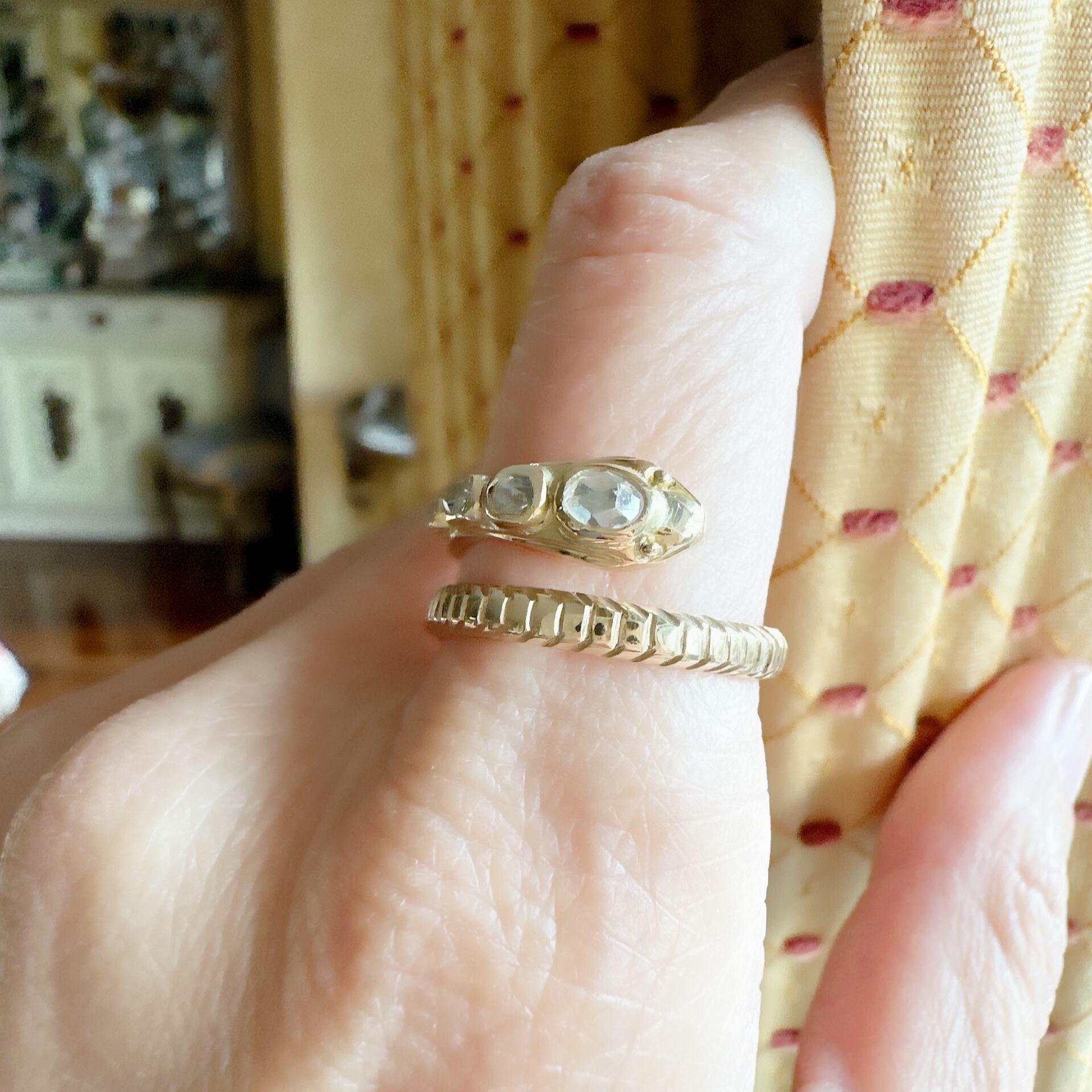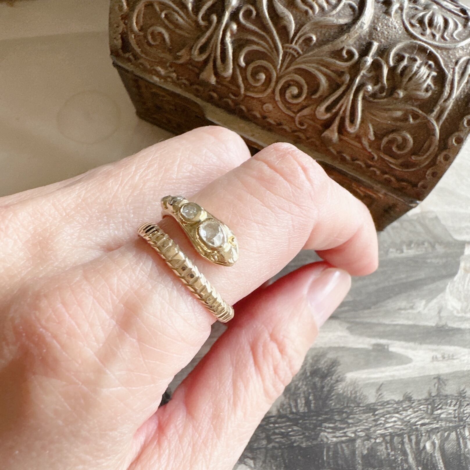 そしてそのローズカットダイヤモンドと蛇のコンビネーションの素敵な事!蛇は古代からさまざまな文化で変幻自在な象徴とされ、特にヴィクトリア女王が蛇のモチーフをファッションに取り入れたことがきっかけとなり蛇ジュエリーの流行を牽引しました。女王の嗜好が流行に拍車をかけ、その魅力が広がっていったのですね。