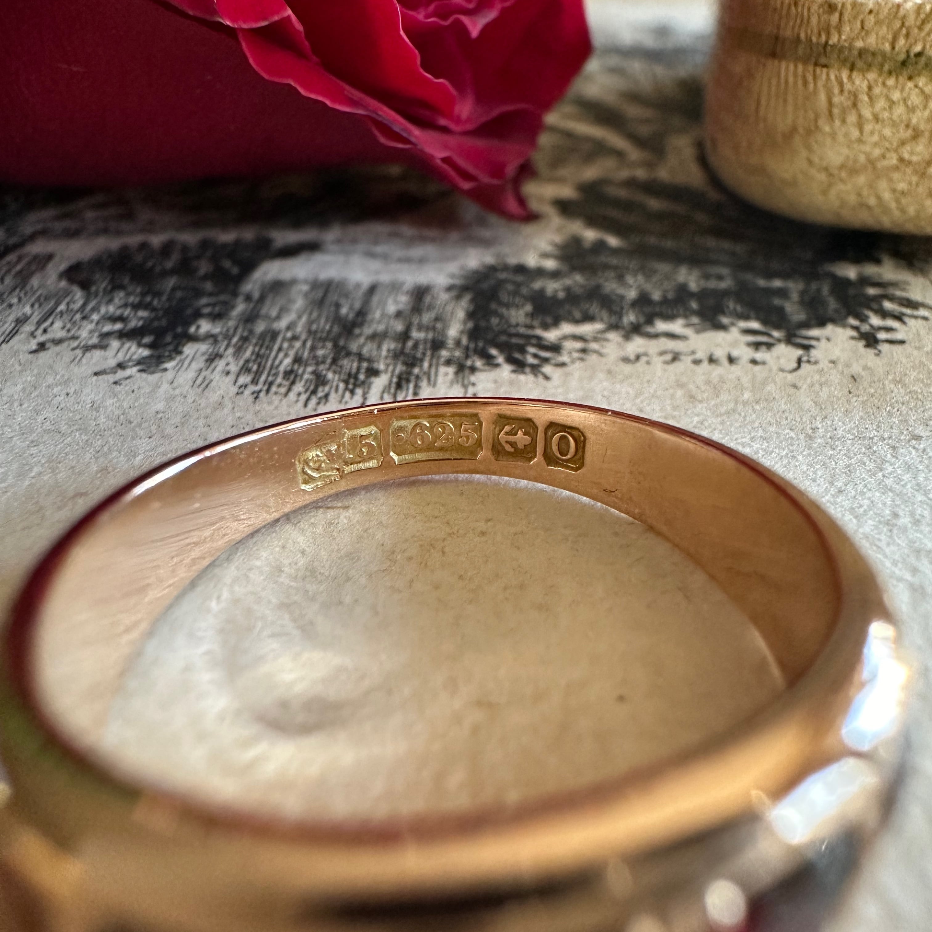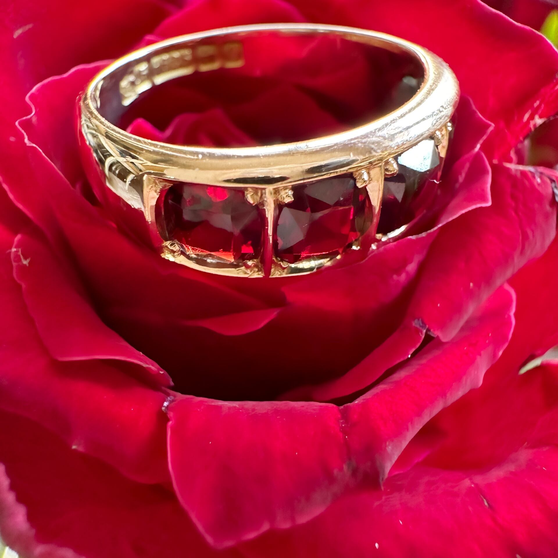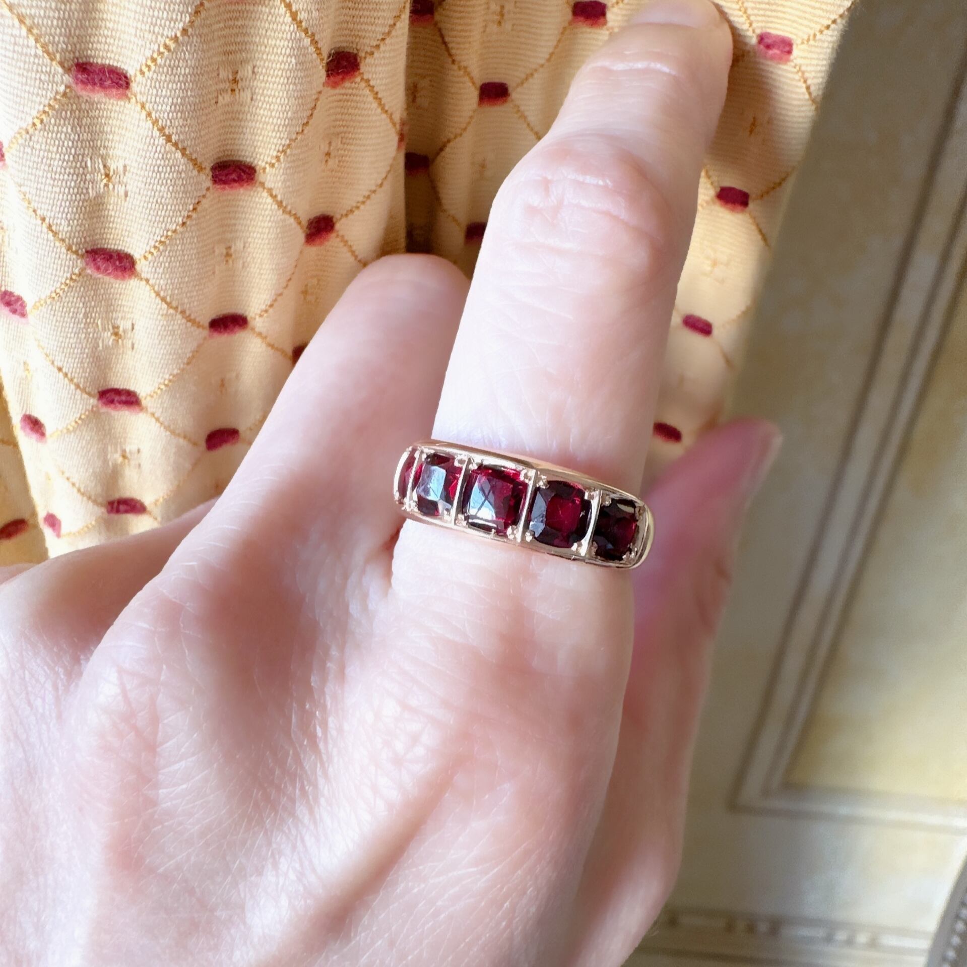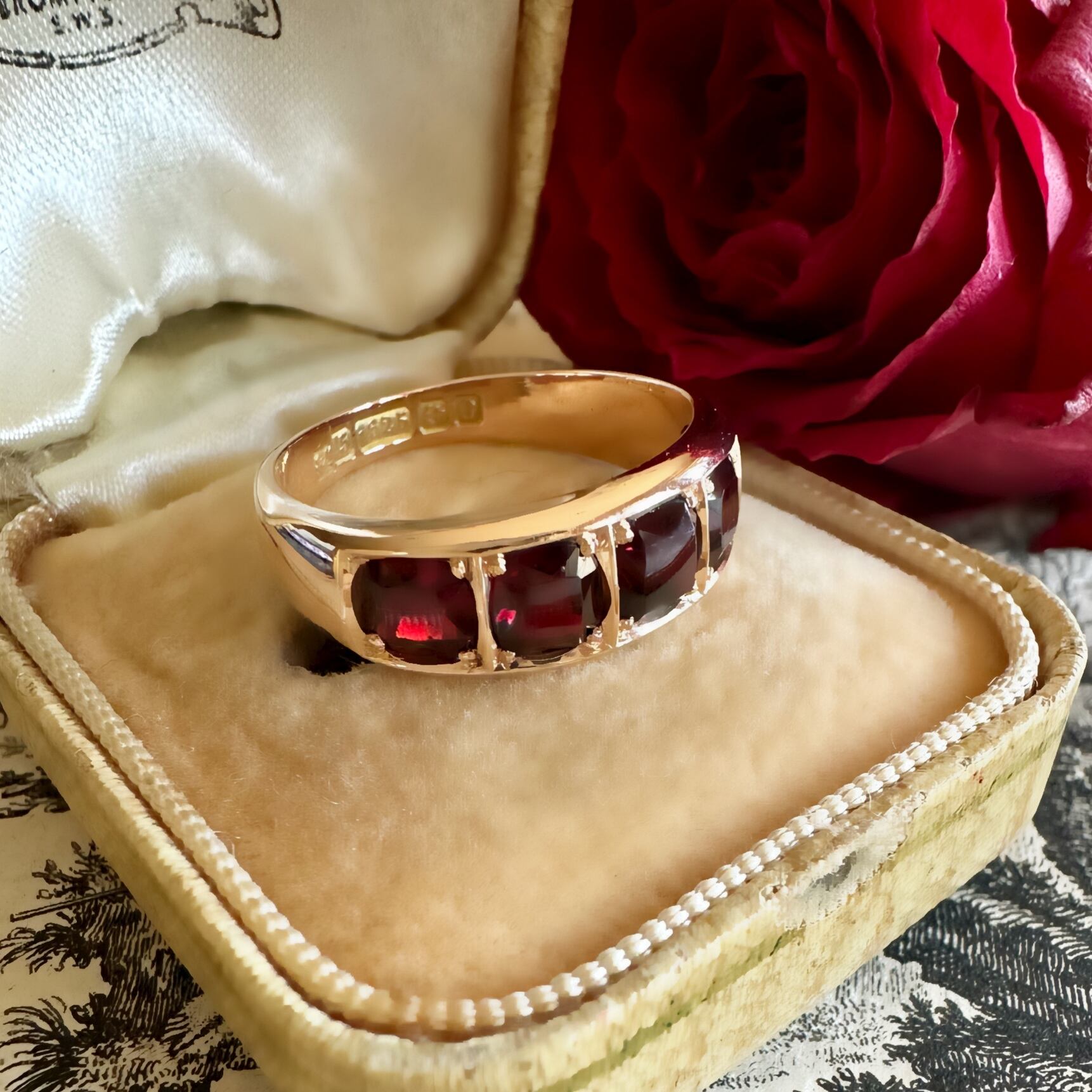 1913年のバーミンガムの刻印が残る15金ゴールドの地金に大粒のガーネットが深々とセットされていますが、光が入ると、まるでそれが押し出されるような存在感を秘めたファイブストーンリングのご紹介です。