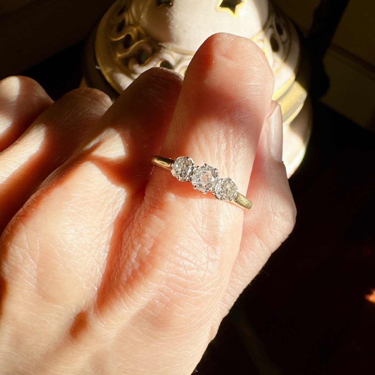 瑞々しい輝きを放つオールドマインカットダイヤモンドを横に3石配置したトリロジーリング。