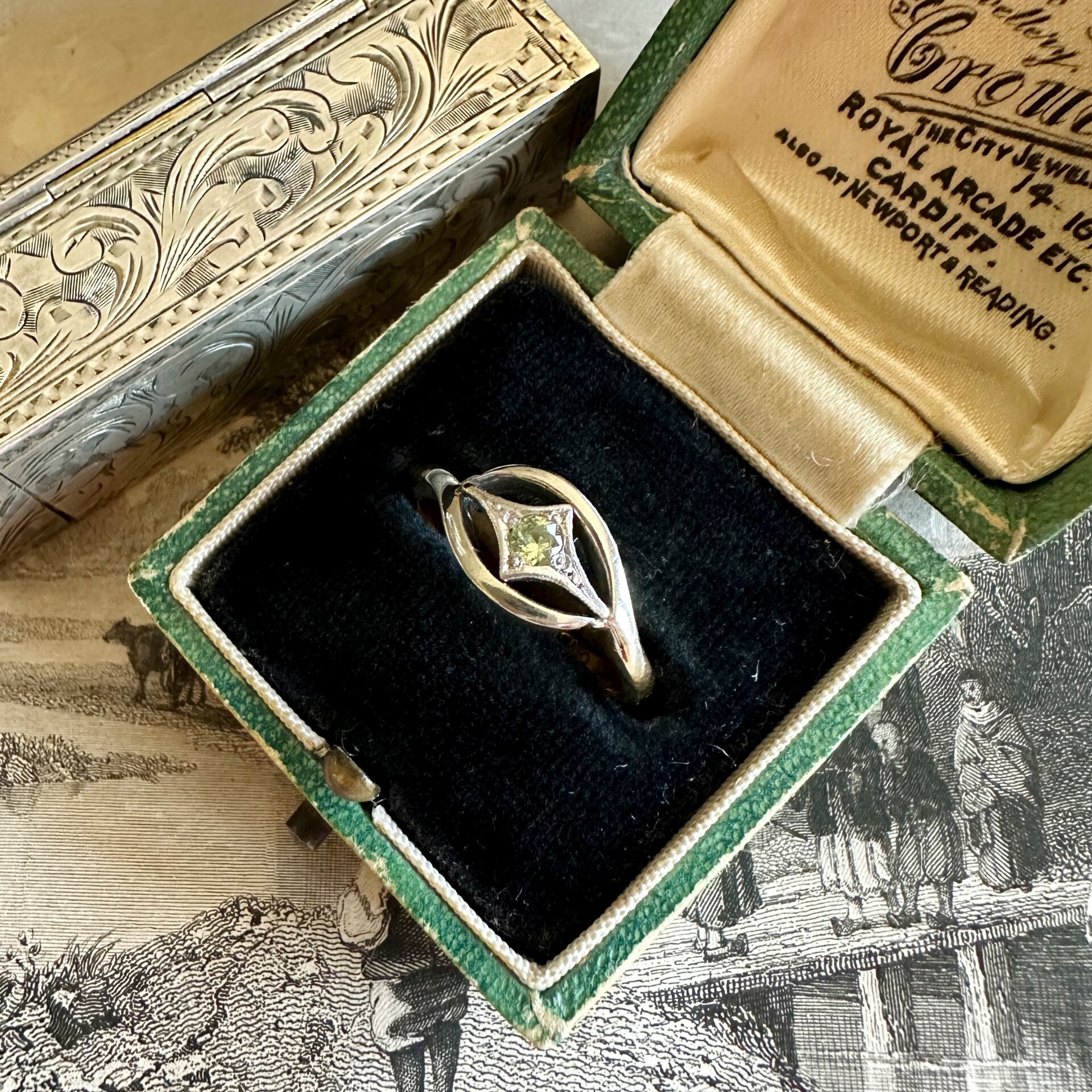 その中心に輝くデマントイドガーネットは、まるでグリーンアイのように輝き、菱形の台座に美しくセットされています。光がさすと、デマントイドガーネット特有のグリーンネオン色に煌めき、神秘のエッセンスが閉じ込められたかのようなグリーンの光を放ちます。