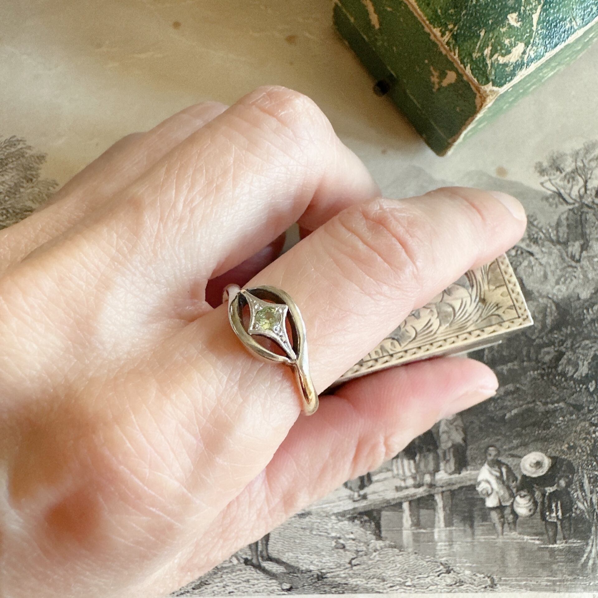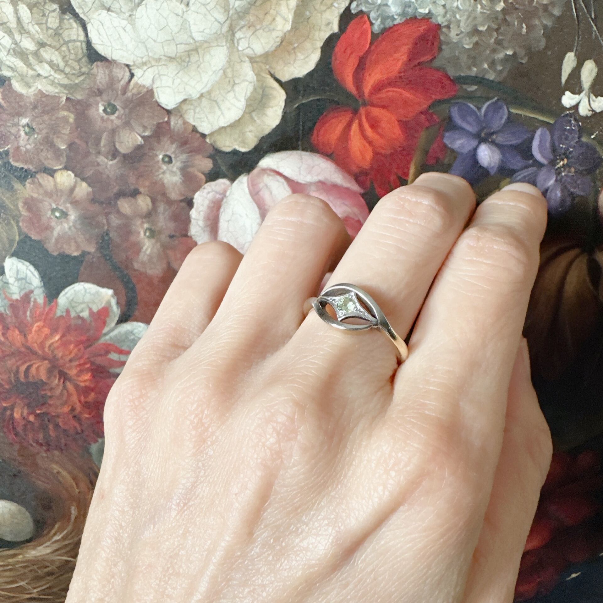 なんとも言えない魅惑的なリングは、目に見えぬ力を宿すかのような存在感を放ち、デマントイドガーネットが、まるで遠い星座を映し出しているようで、菱形の台座がリングの"守り"を象徴し、リング全体が神秘を抱えたような、上手く説明できないのですが、その美は、まさに個性的なデザインの融合から生まれた、誰もが心惹かれる存在なのでは?と思います。