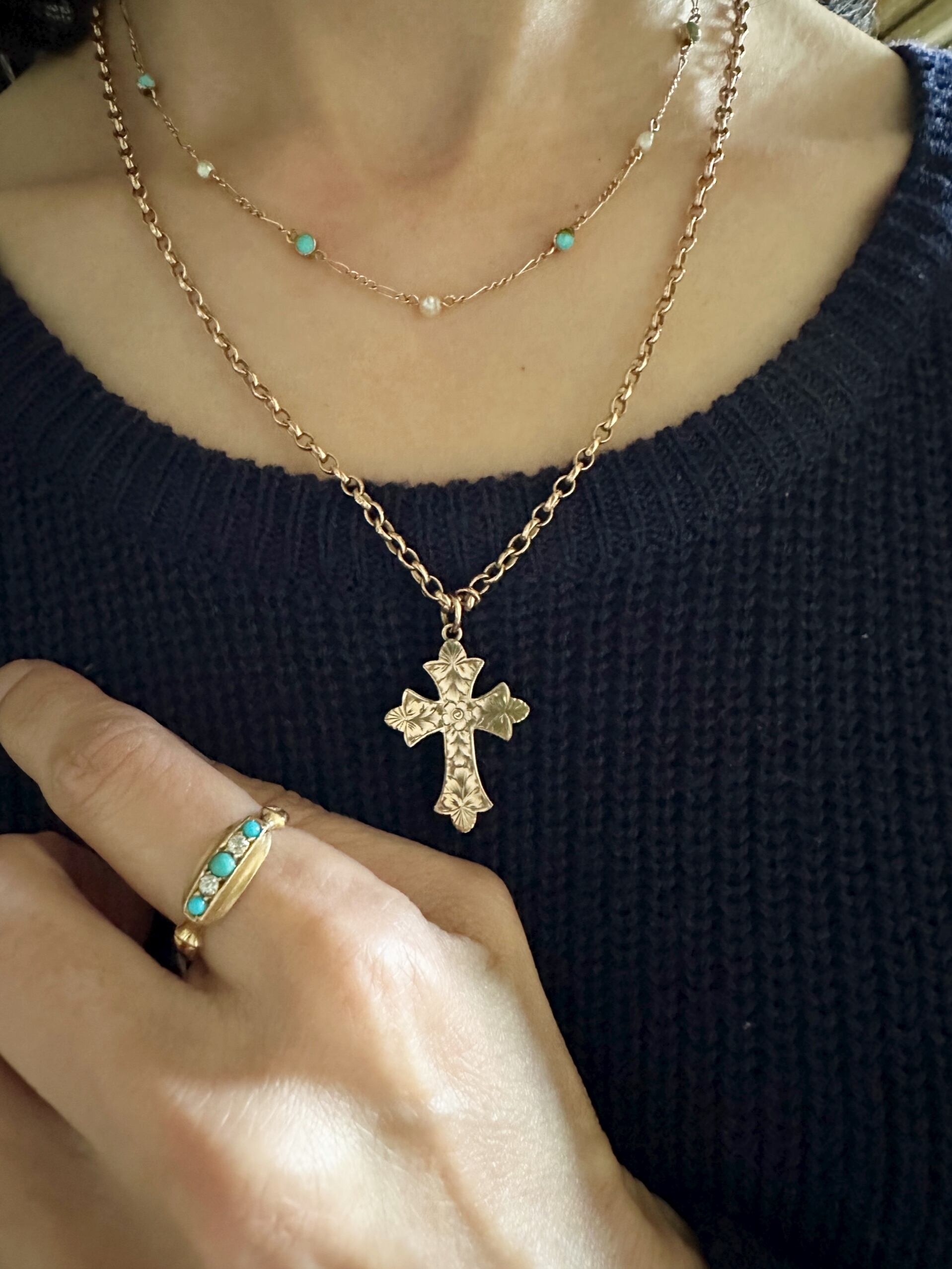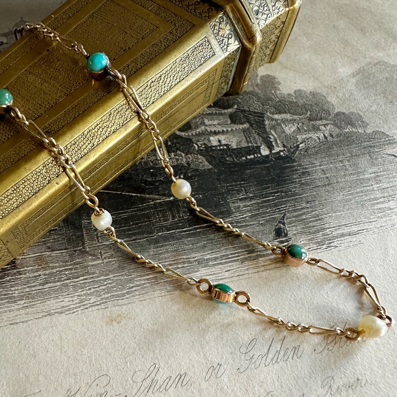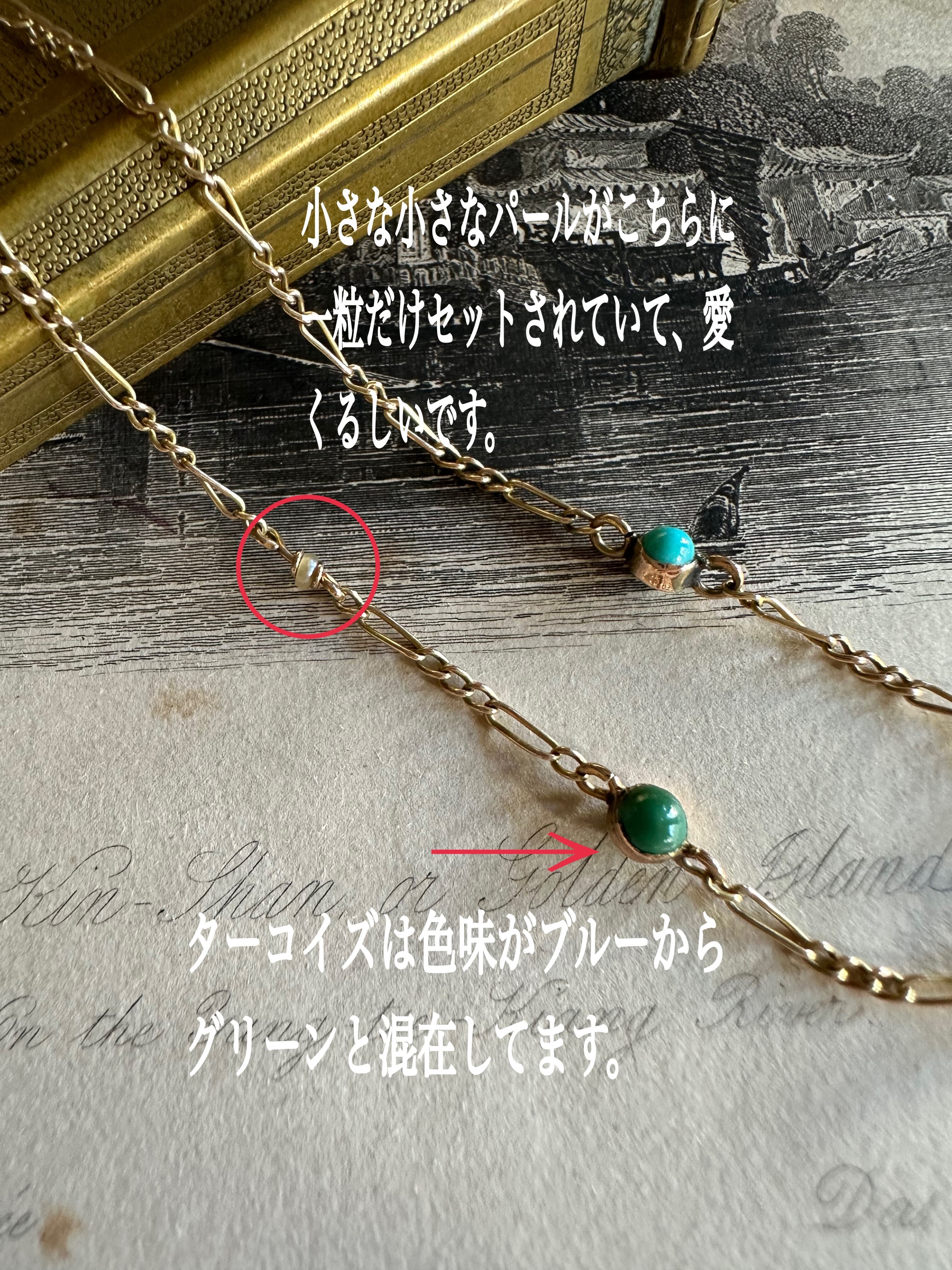 ターコイズとパールの可愛らしいコンビネーションによって、アンティークジュエリーのエレガントな伝統を感じて頂けるチェーンネックレスのご紹介です。