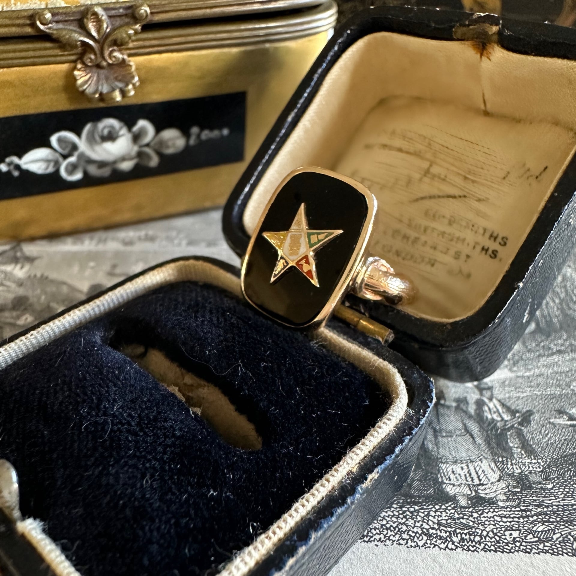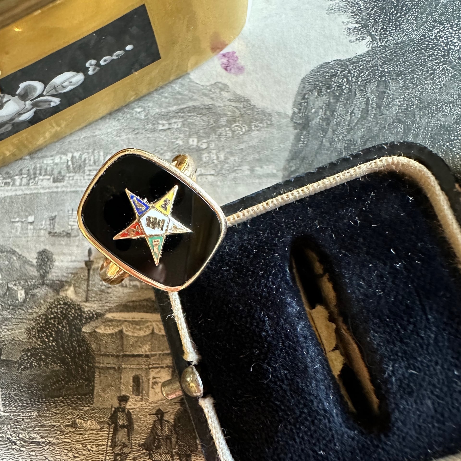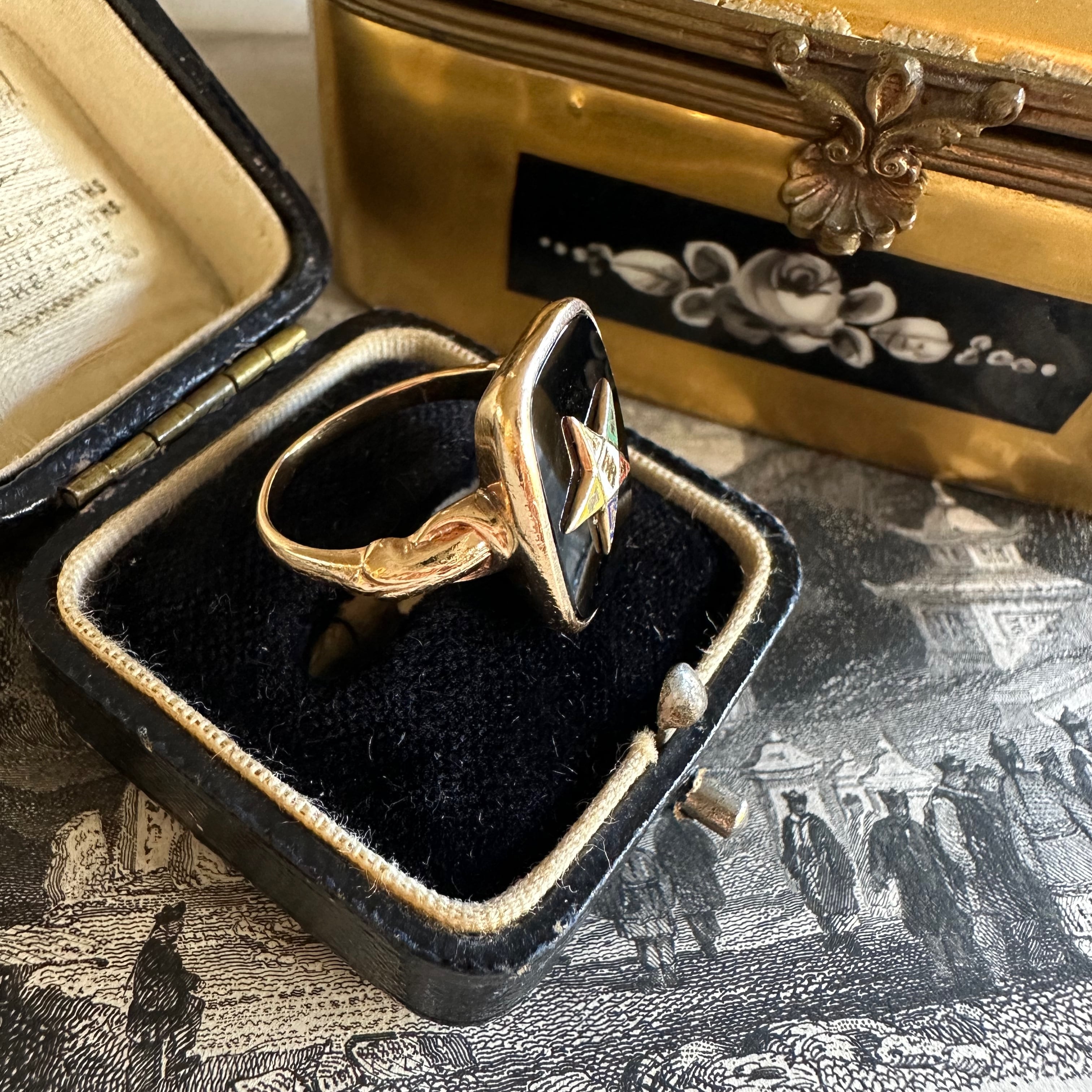 黒光りの艶感が美しいオニキスの中心にはエナメルで焼き付けされたオーダー・オブ・ザ・イースタン・スターのシンボルが、謎めいた魅力を放ちながら美しくセットされています。