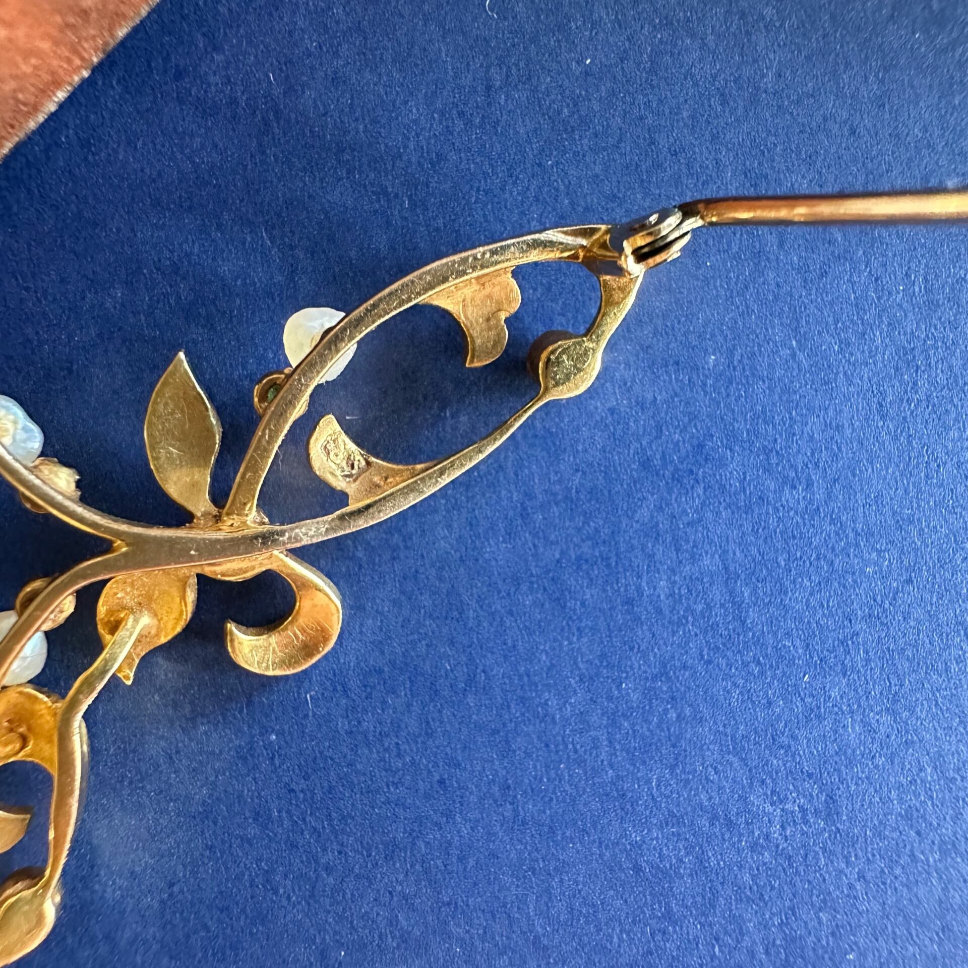 15ct デマントイドガーネット&パールの宿木のアールヌーヴォーブローチ