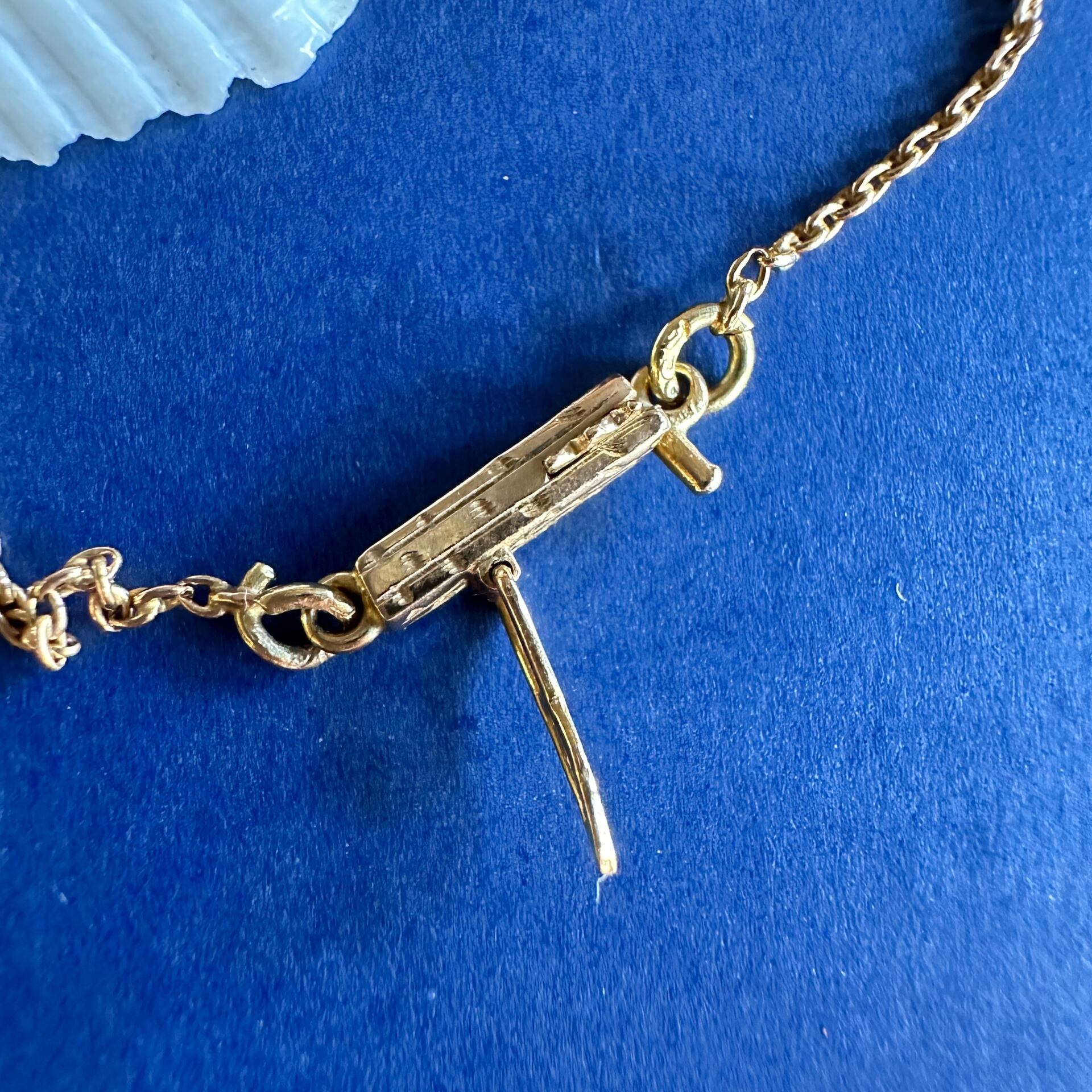 この美しいペンダントは、上品な14金ゴールドのチェーンに繋がれ、全体を引き締める一層の輝きを与えています。高品質の素材と精巧なデザインで作られており、繊細でしなやかで、クラスプまでも凝った造りの素敵なチェーンです。