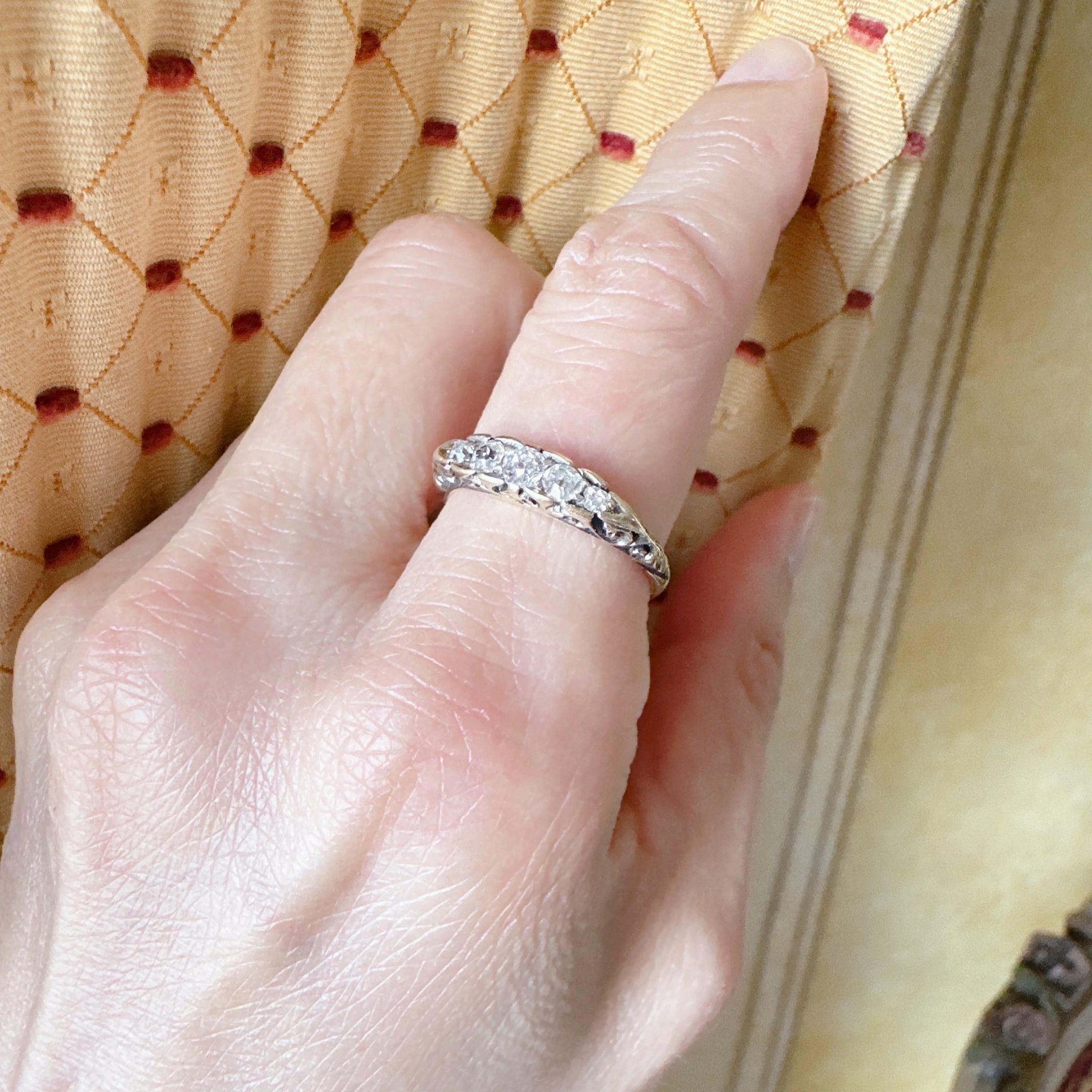 ダイヤモンドファイブストーンリングはアンティークジュエリーの定番のデザインですが、こちらのファイブストーンリングはヴィクトリアンアンティークらしさを感じますね。