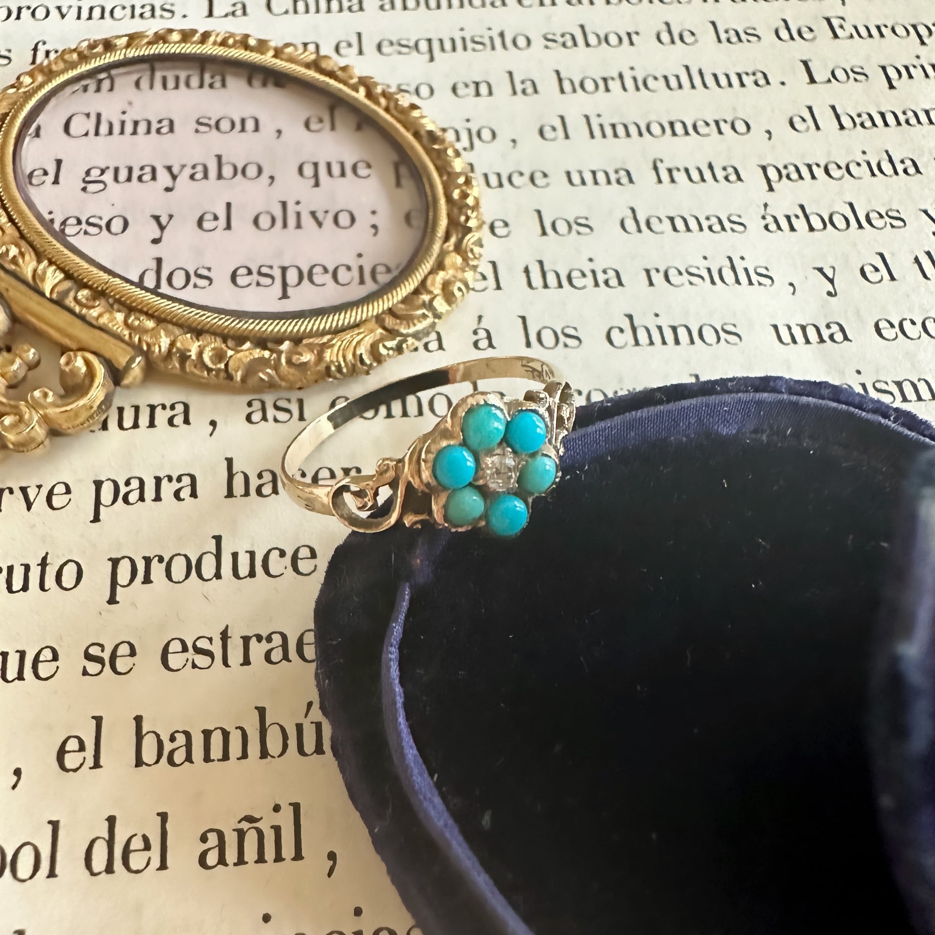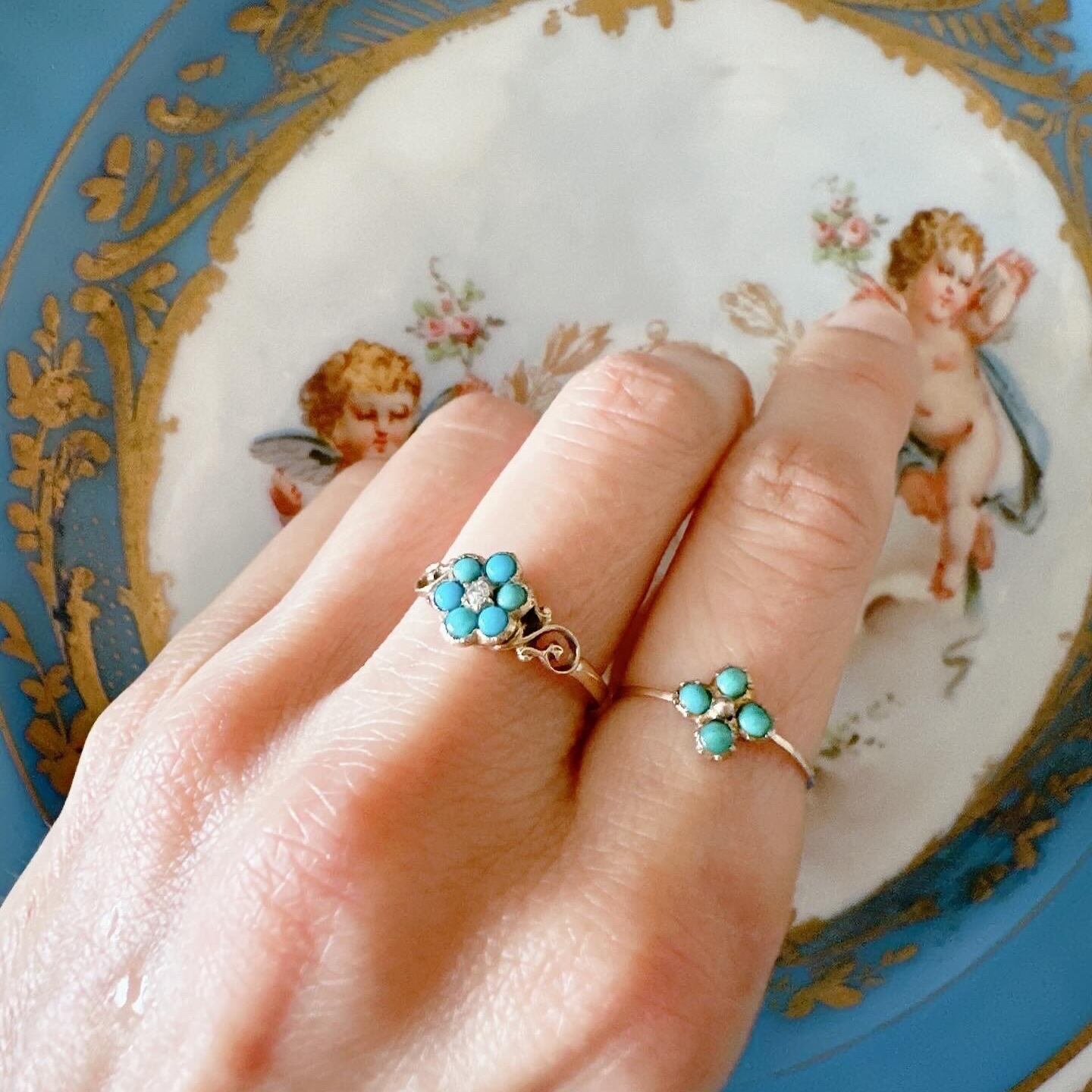 可愛い小花の勿忘草ターコイズ&ダイヤモンドヴィクトリアンリング