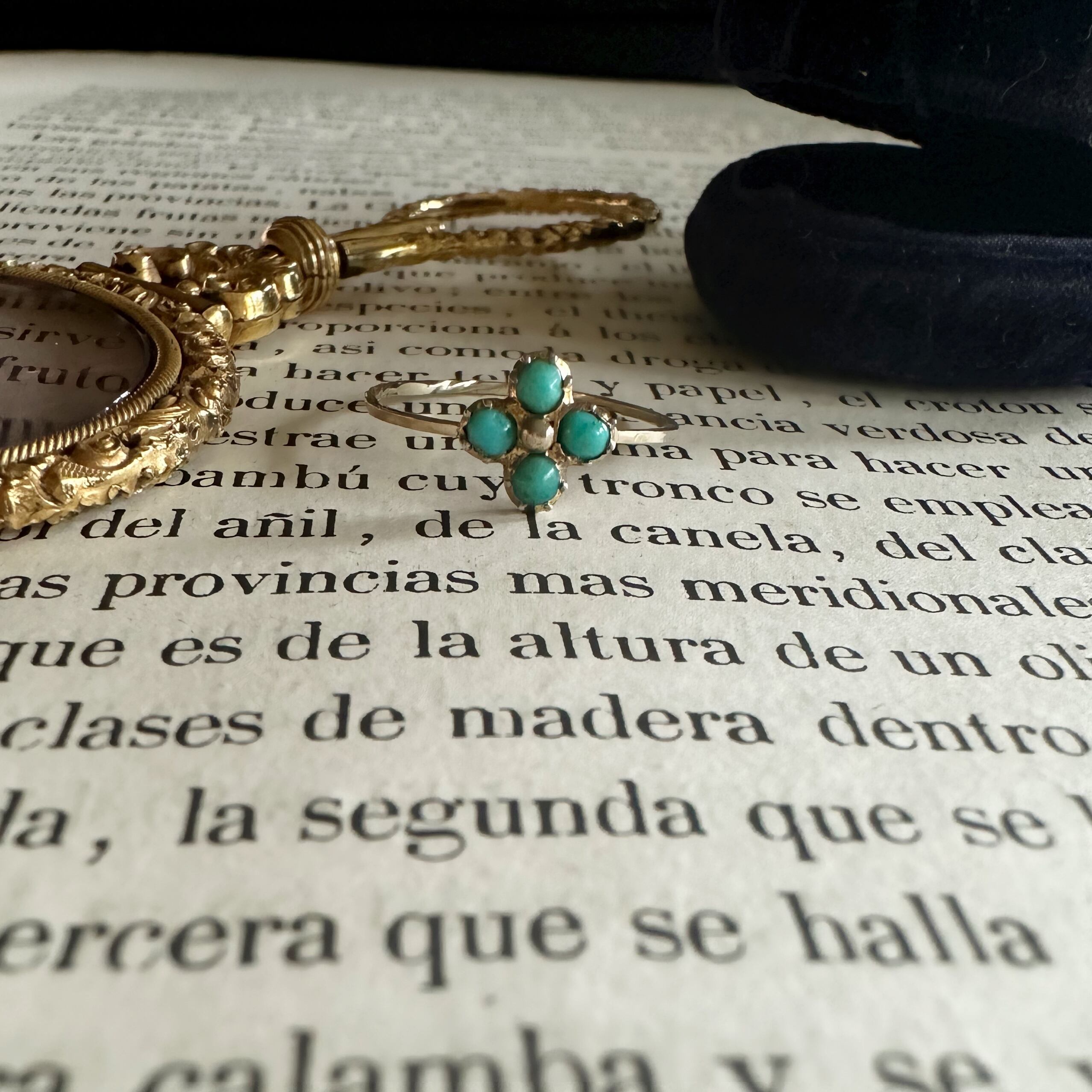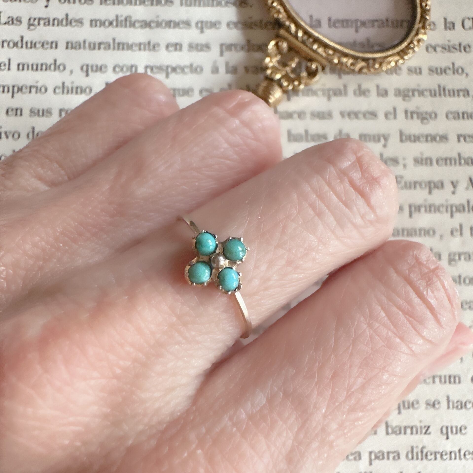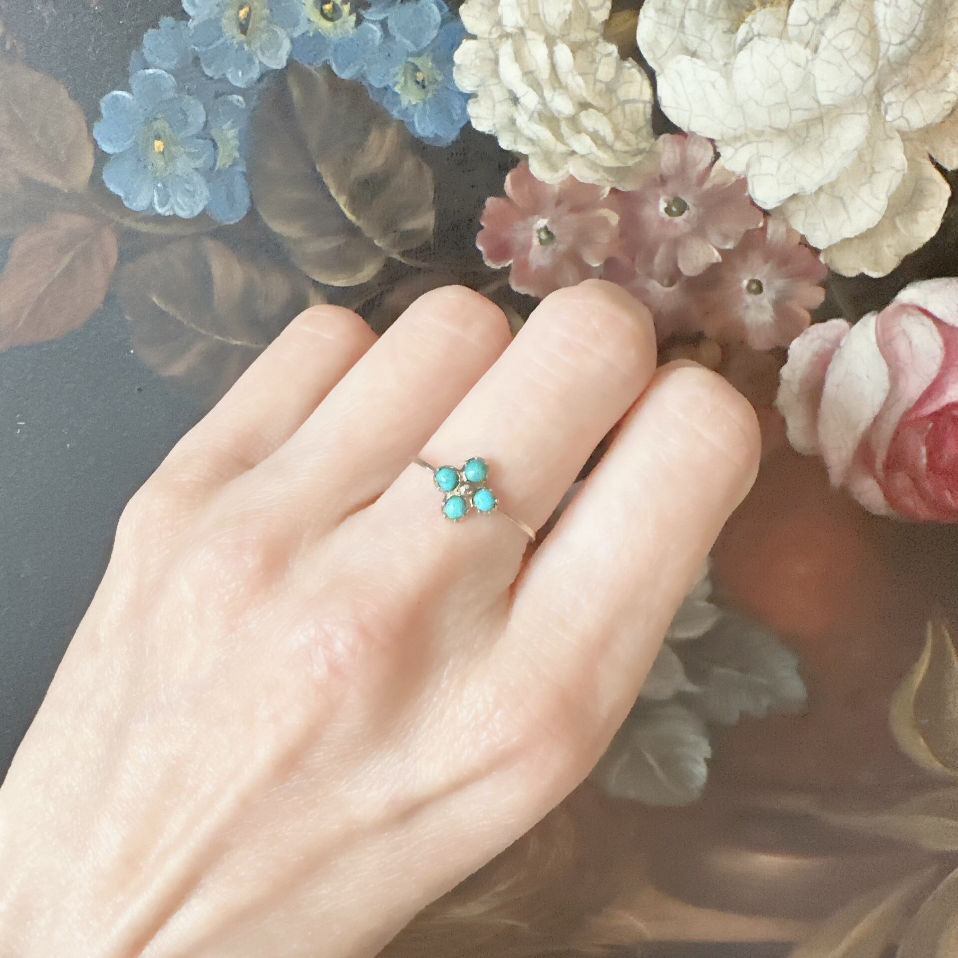 小さな小さなヴィクトリアンリングは、小さなハーフターコイズを4つ集めてまるで四つ葉のクローバーのようで、幸運を運んできてくれそうです。