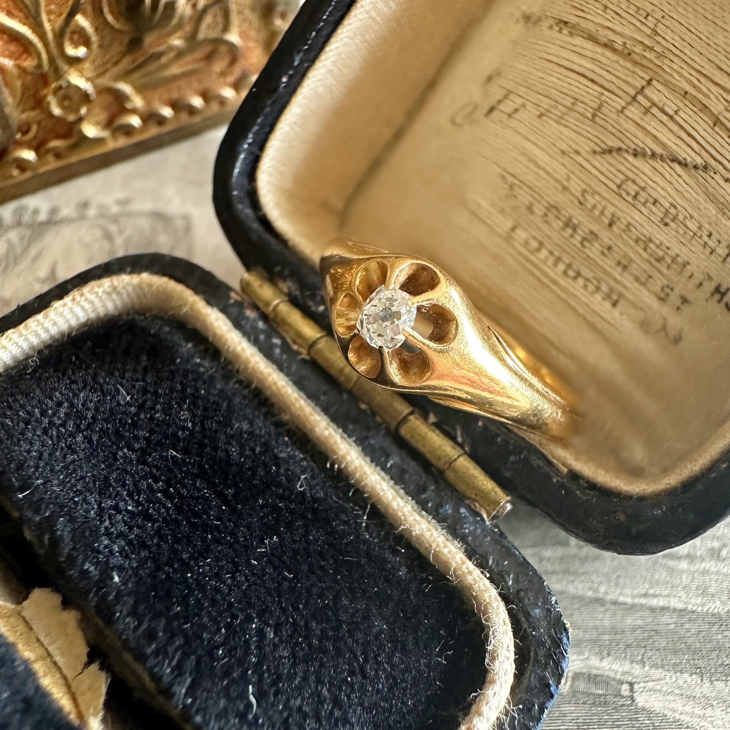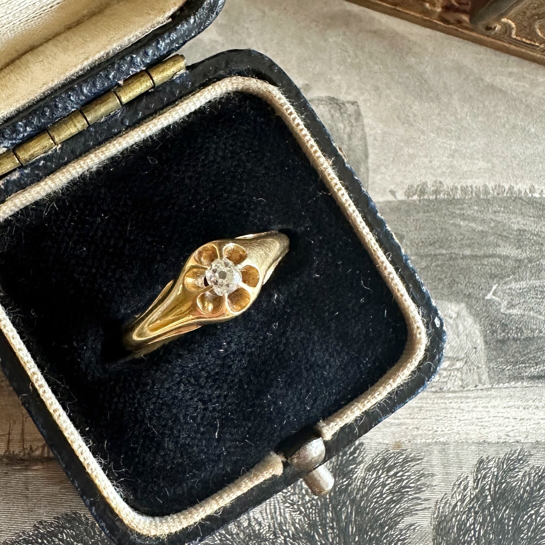 爪と爪の間の大きな雫型の花びらの隙間から光を沢山取り込み、現代の完璧なブリリアントカットとは違ったアンティークダイヤモンドのしっとりとした輝きが愉しめます。ブリリアントカットダイヤモンドに慣れてしまっているとその輝きは穏やかで物足りなく感じるのかもしれませんが、私のようなアンティーク好きにはこの地味な輝きこそがたまらなく感じるので、同じ感性の方の所へ旅立ってもらえたら嬉しいです。