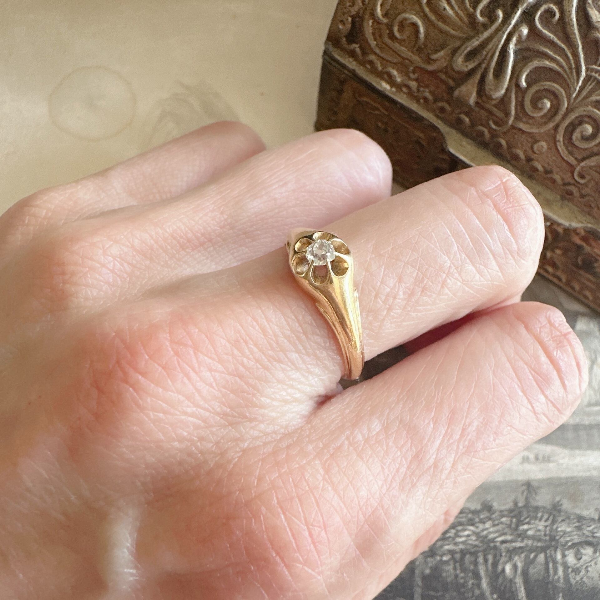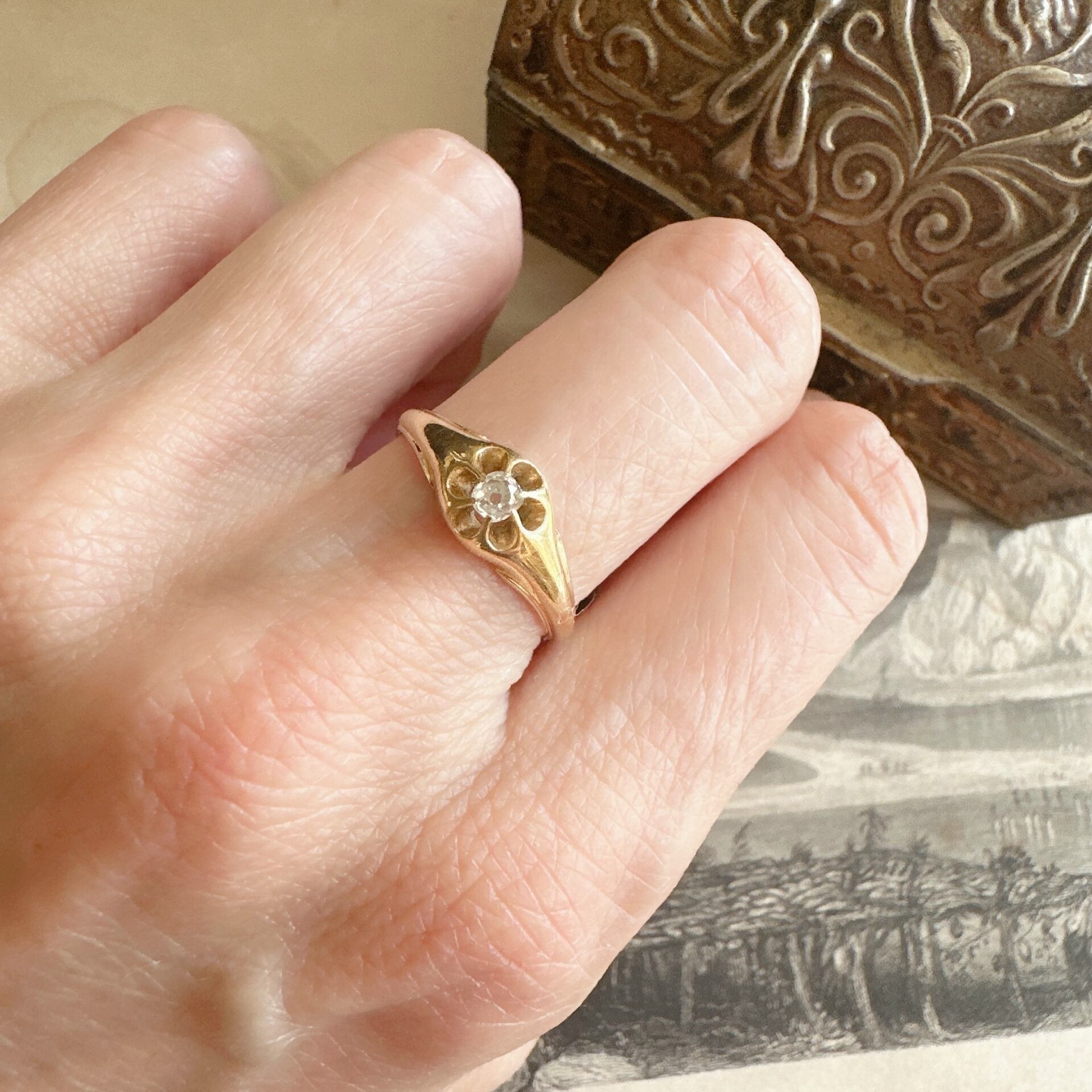 ダイヤモンドは地金のイエローゴールド一色の輝きと相まって、狭く取られたテーブル面にさしこむ光に静かで穏やかな輝きを見る事ができ、春の光に目覚めたお花のように優しげで気張らないその姿に癒されるひと品です。