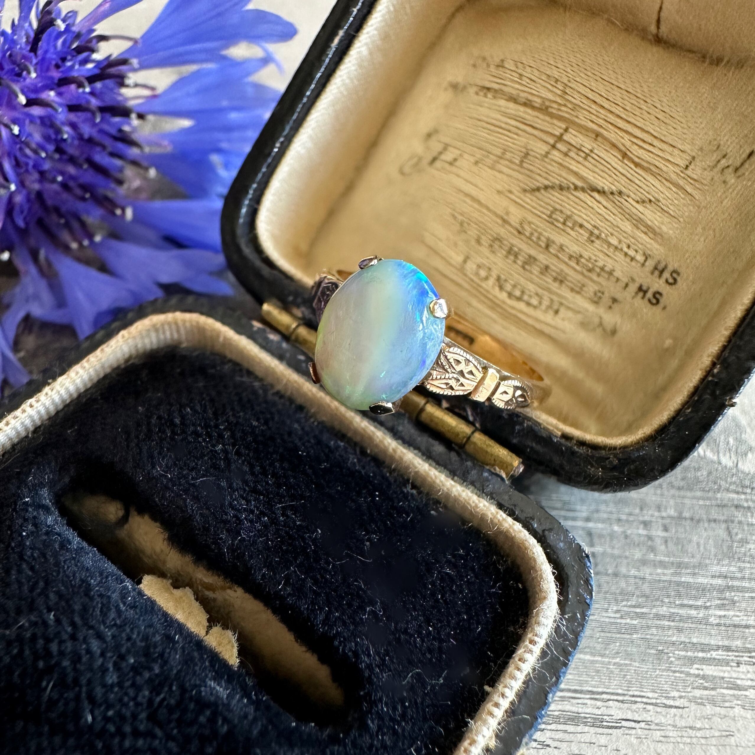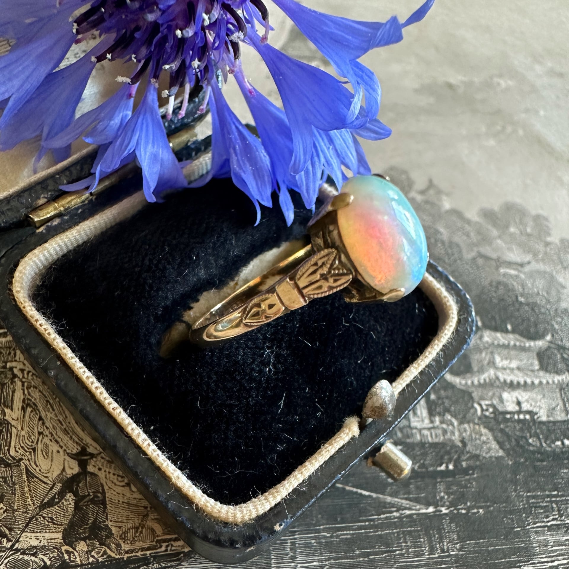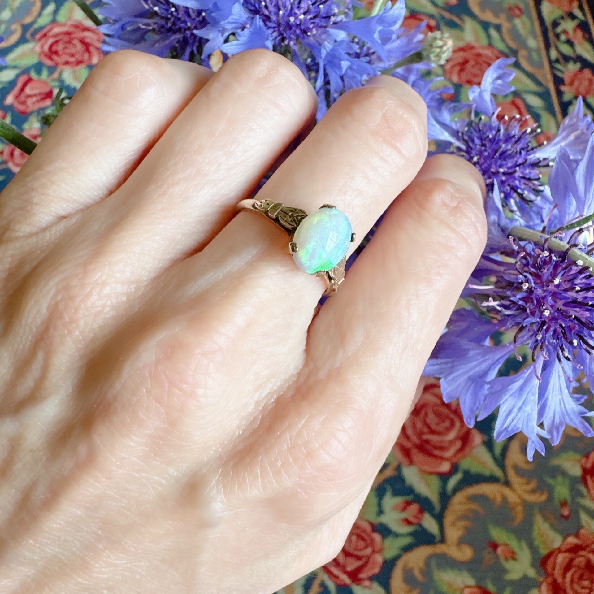 オーロラのようなカボションカットオパールソリテールリング