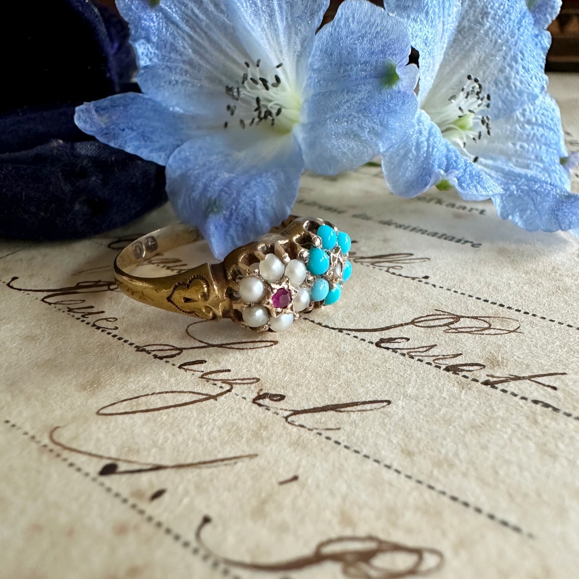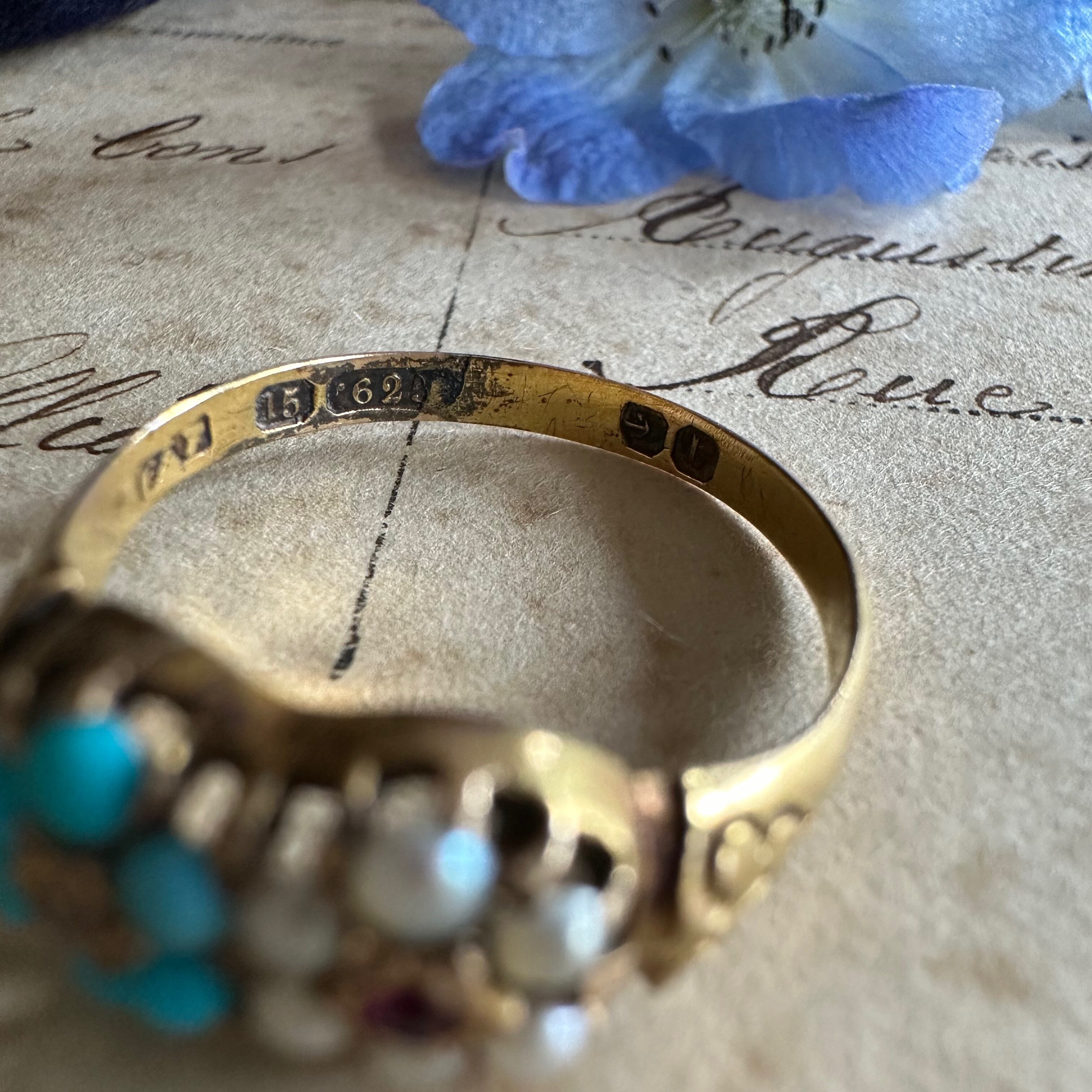 リングに使用されている素材は、天然パール、ターコイズ、ダイヤモンド、ルビー。これらの石はそれぞれ特別な意味を持ち、このリングに深い感情と象徴性を与えています。