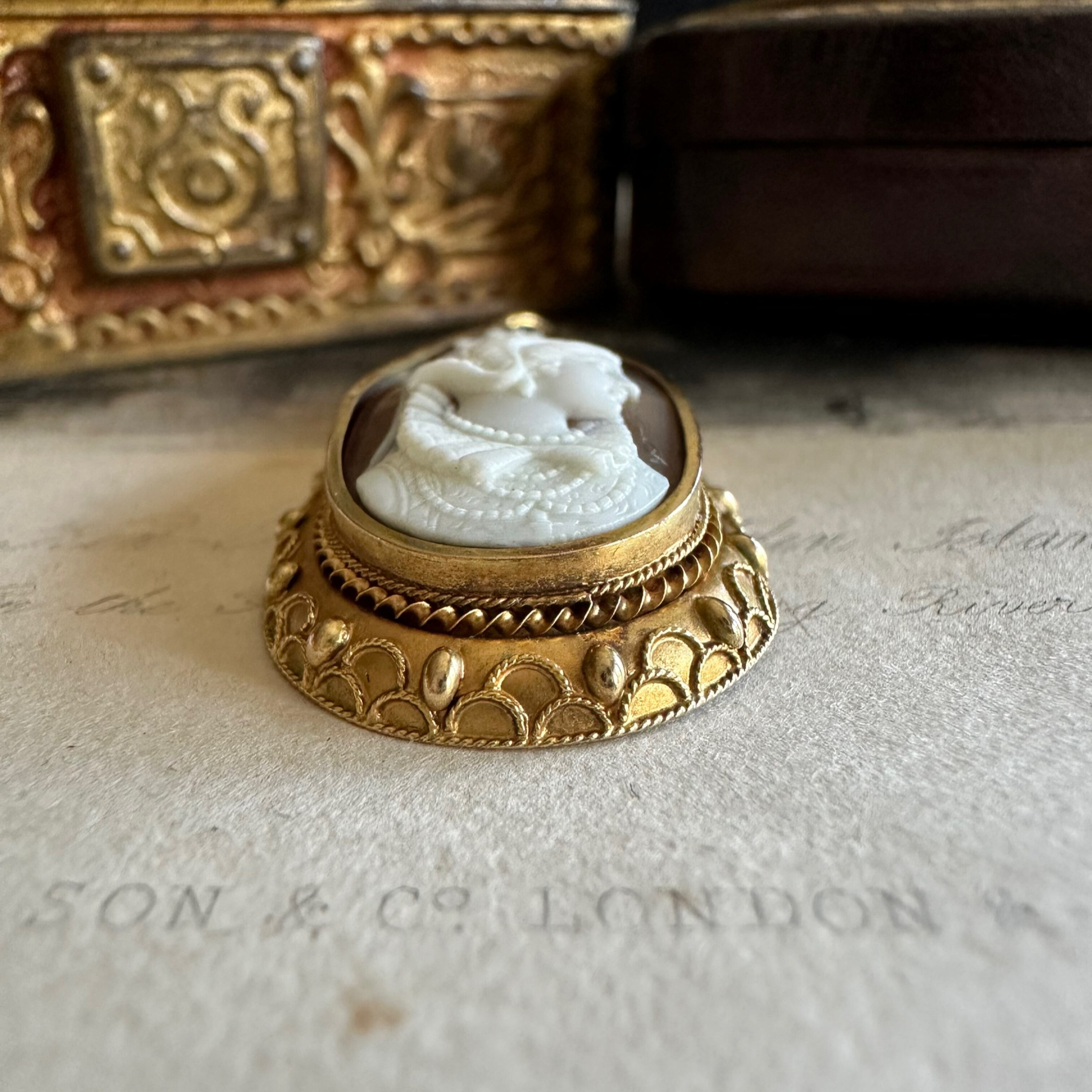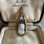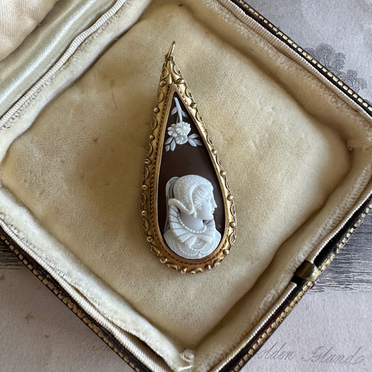 このペンダントは、シェルカメオの歴史と技法、エトルスカンリバイバルの美しさ、そしてエリザベス1世の強い意志と美しさを一体化させた芸術作品です。その細部にわたる精密な彫刻と美しいデザインは、どこから見ても惚れ惚れとするほどの美しさですね。