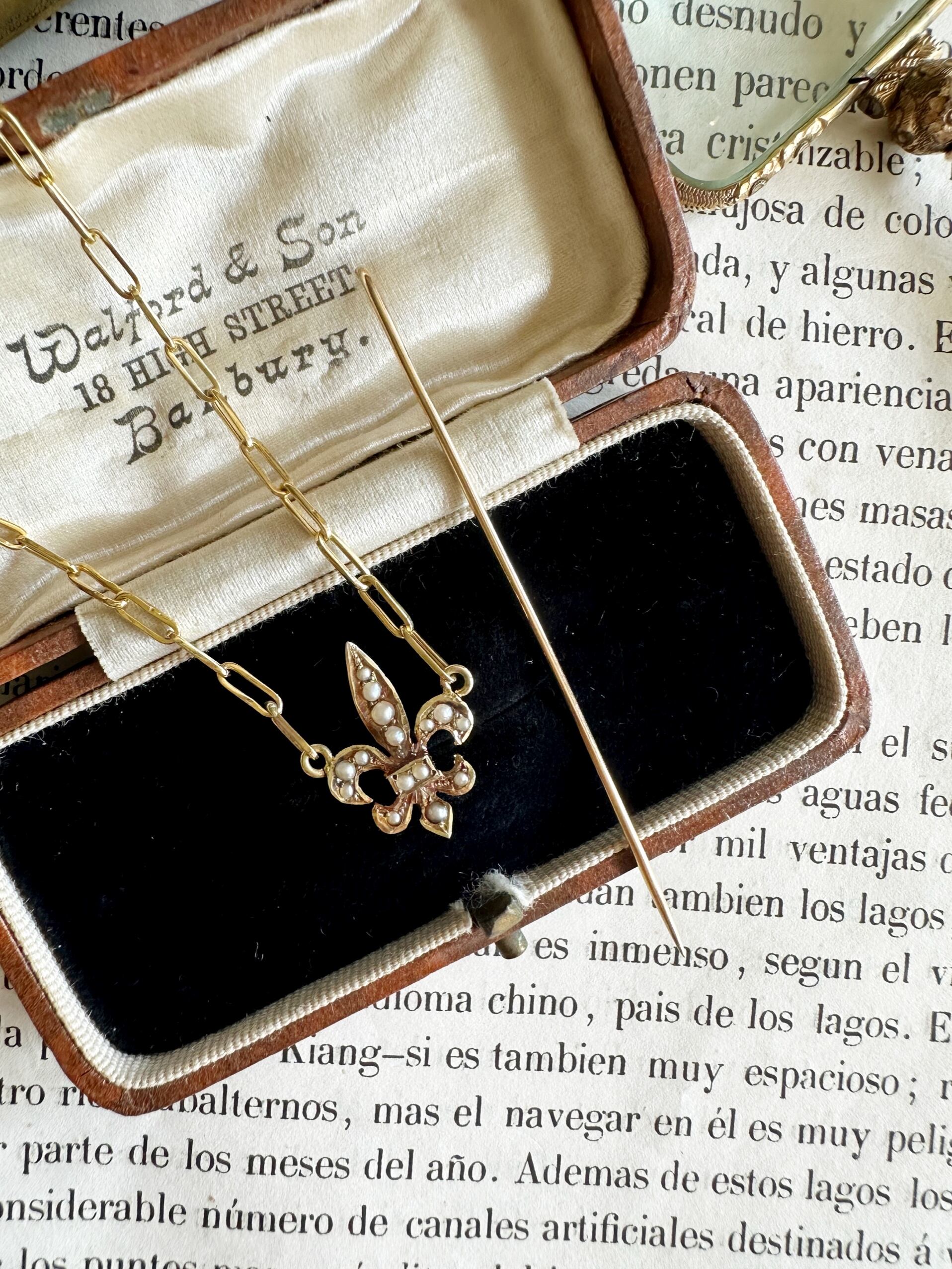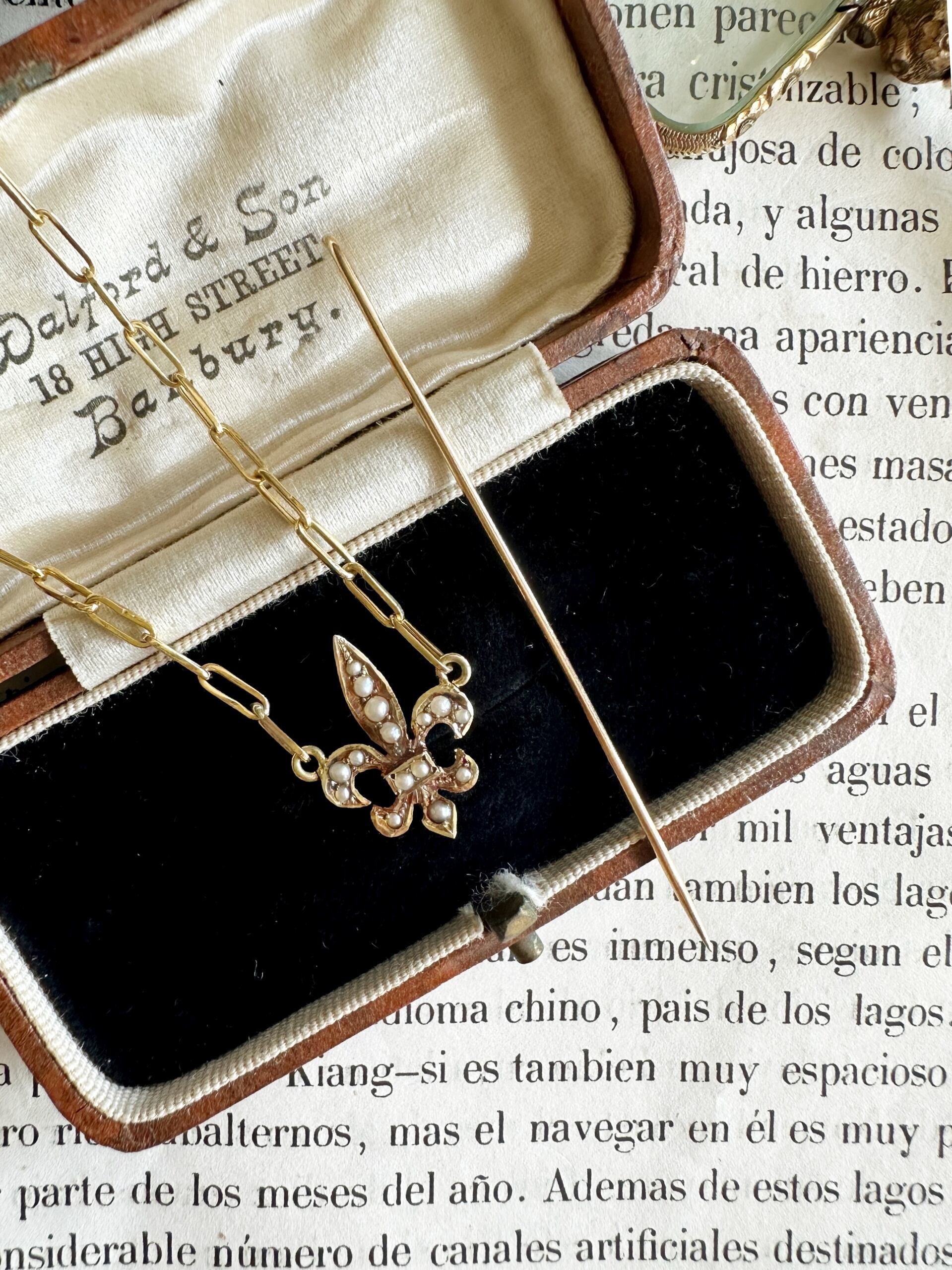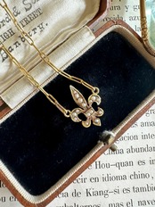フルールドリスのピンブローチをリメイクして、ペーパークリップチェーンを付けたネックレスに加工しました。もともとはピンブローチとして所有していたこのフルールドリスは、そのままではあまり使う機会がなかったため、ネックレスにすることで日常的に楽しめるようにしました。近年、こうしたジュエリーのリメイクは欧米で人気が高まっており、古いアイテムに新たな命を吹き込む手法として注目されています。