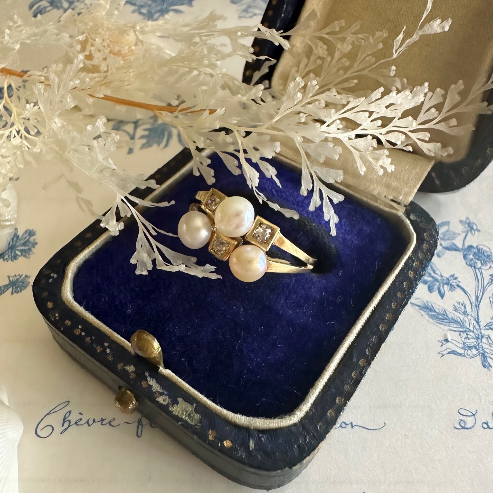 パールが3粒、V字を描くようにセットされ、その間に小さなオープンキュレットのオールドカットダイヤモンドが3石配された、アールデコ期からポストアールデコにかけてのモダンなエスプリを感じる魅力的なリングをご紹介いたします。