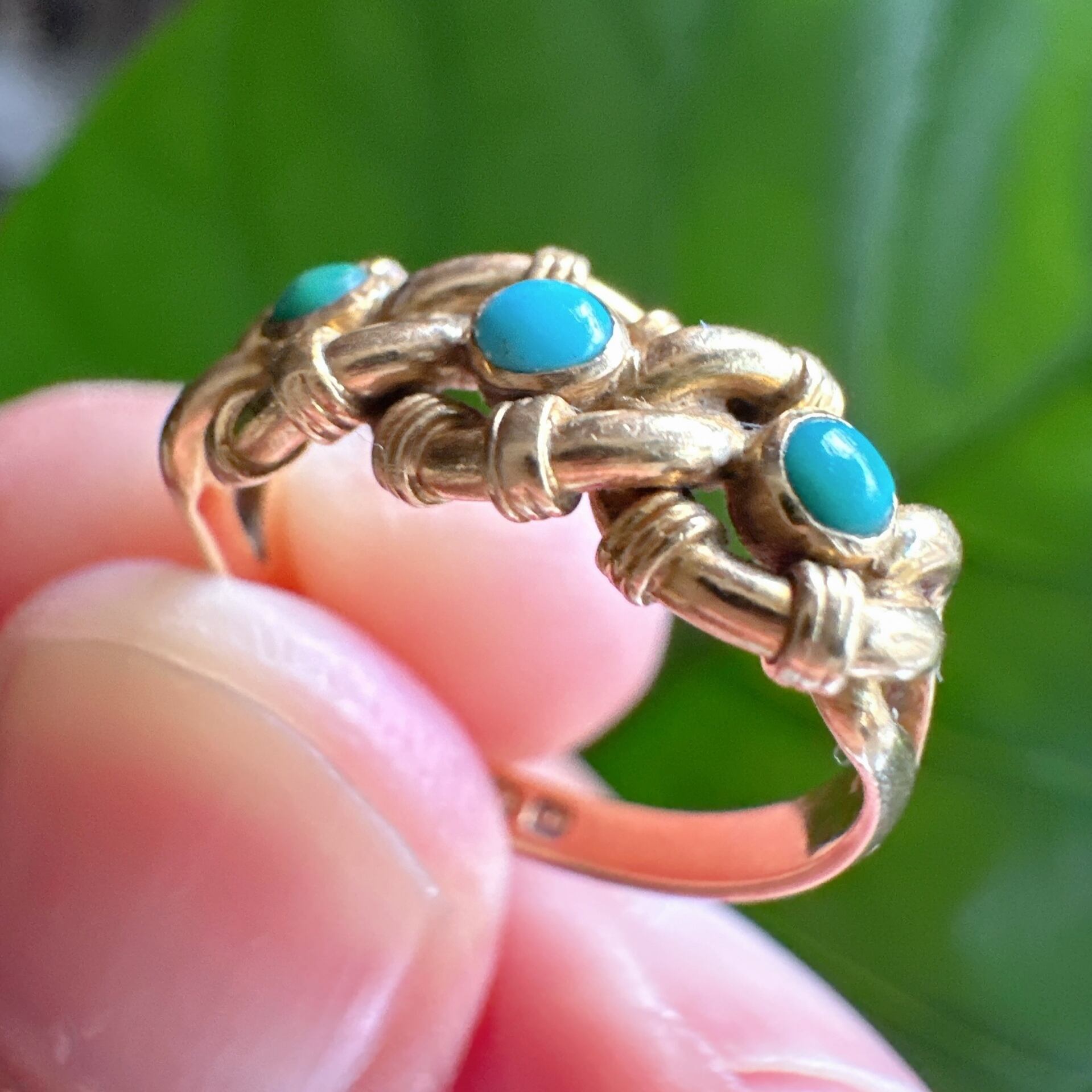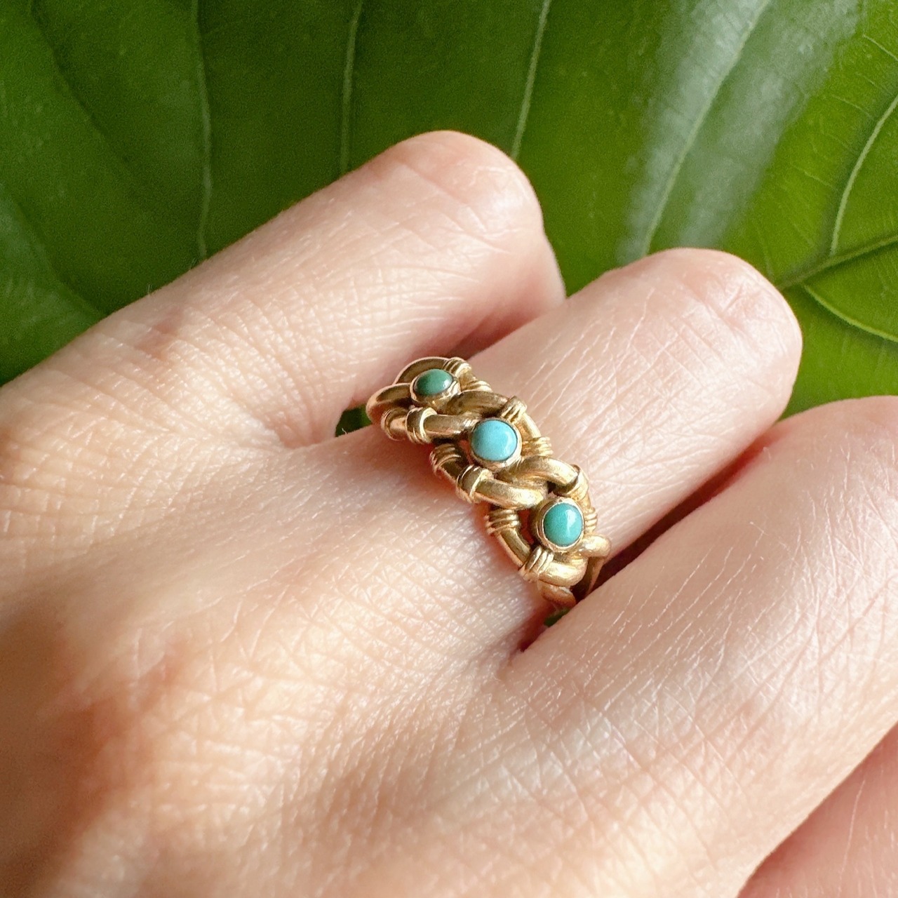 1901年ロンドンのホールマークが内側に残る、美しく磨かれた18金ゴールドのバンドに、3石のターコイズがセットされたノットリング。