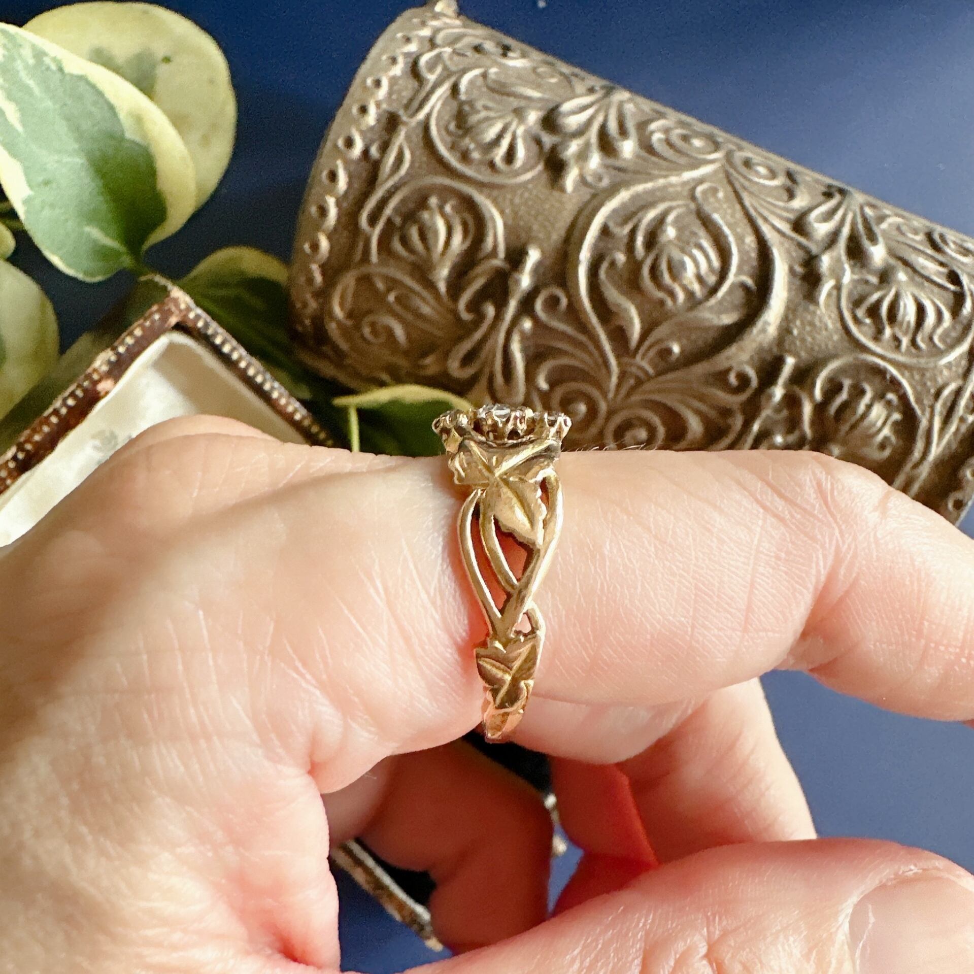 リングの横からのシルエットはとっても美しく、アイビーの蔦を素敵に表現したデザインが施され、オールドカットダイヤモンドの輝きと相まって、クラシックでありながらも独特な魅力を放っています。
