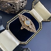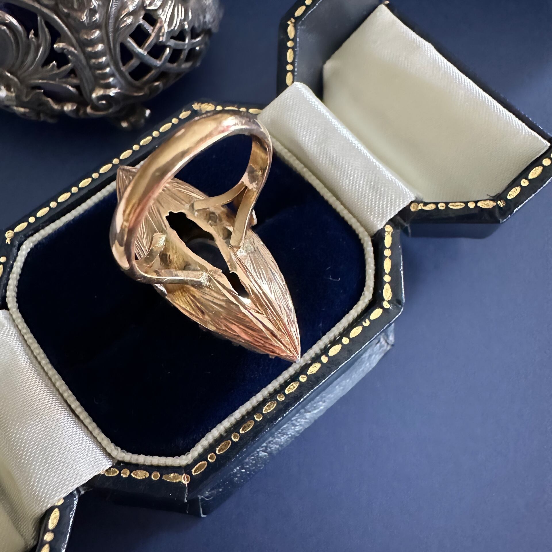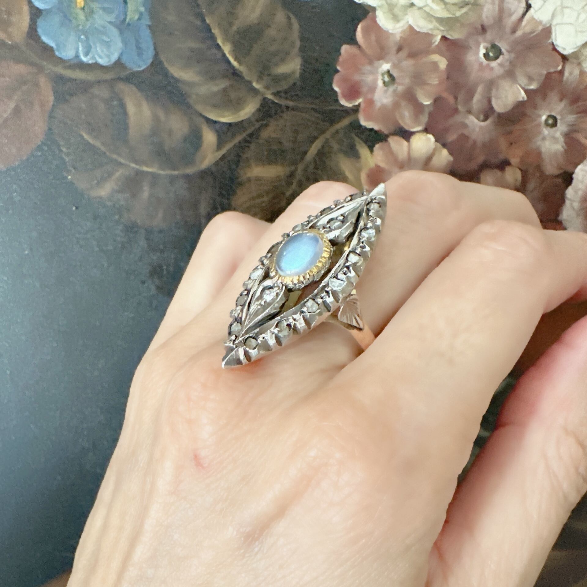 マーキーズシェープのボリューミーなリング、ヴィクトリアンリングらしいその外観、リングの中央には、幻想的な輝きを放つムーンストーンがセットされています。