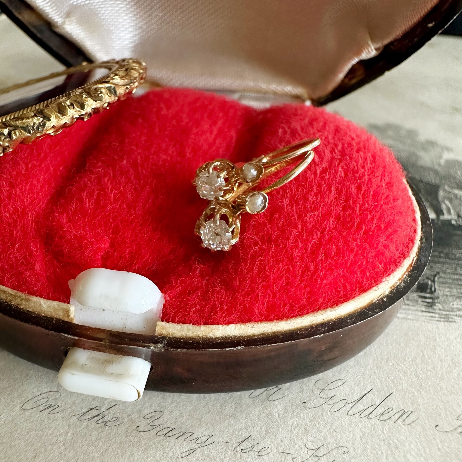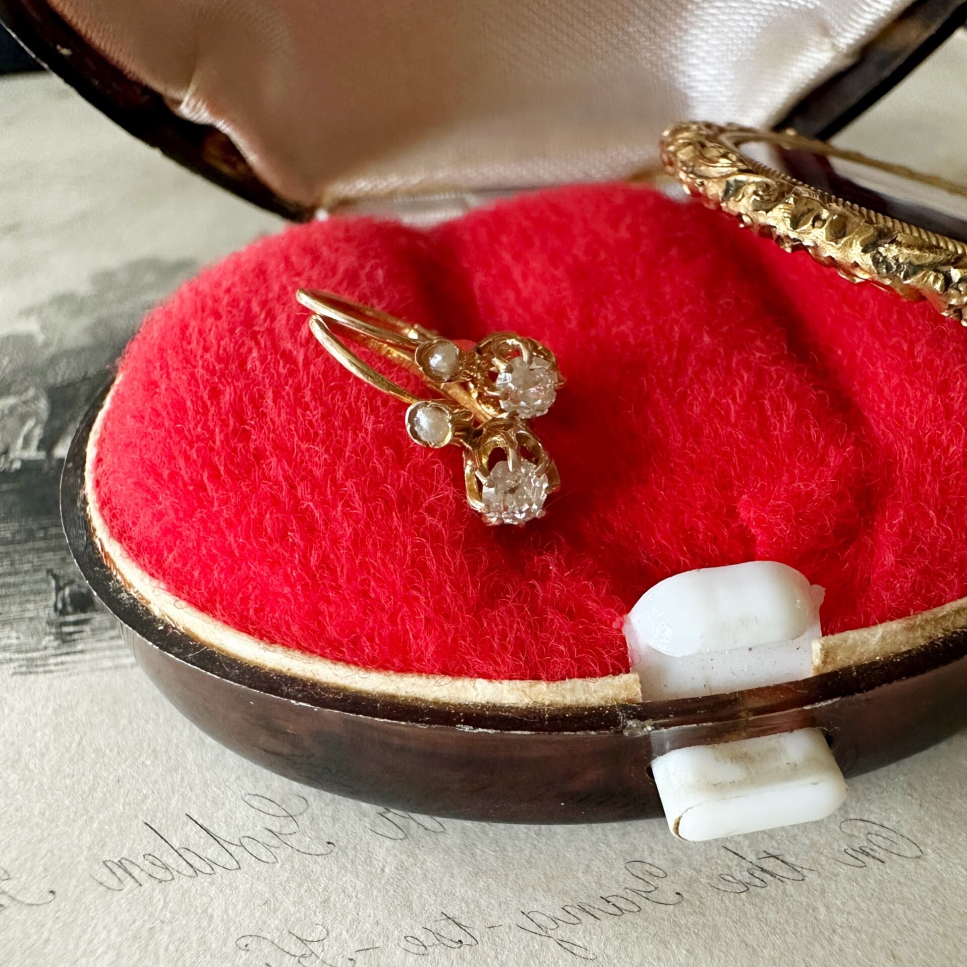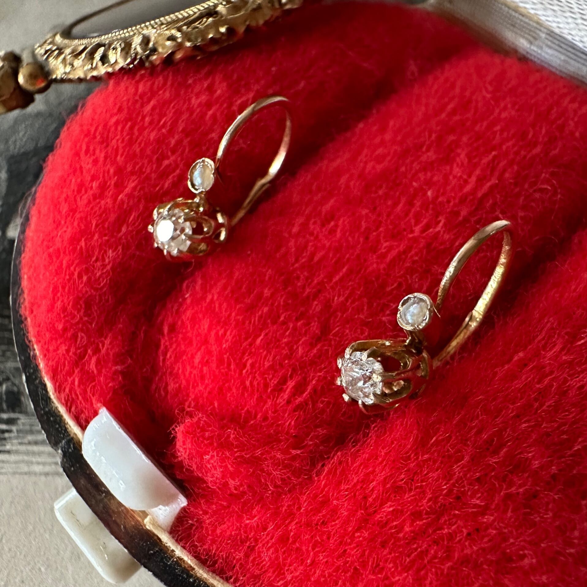 オープンキュレットの小さなオールドマインカットダイヤモンドと小さな小さなパールが絶妙なバランスでセットされ、ピアス全体に控えめでありながらも優雅な印象を与えているフレンチドルムーズピアス。