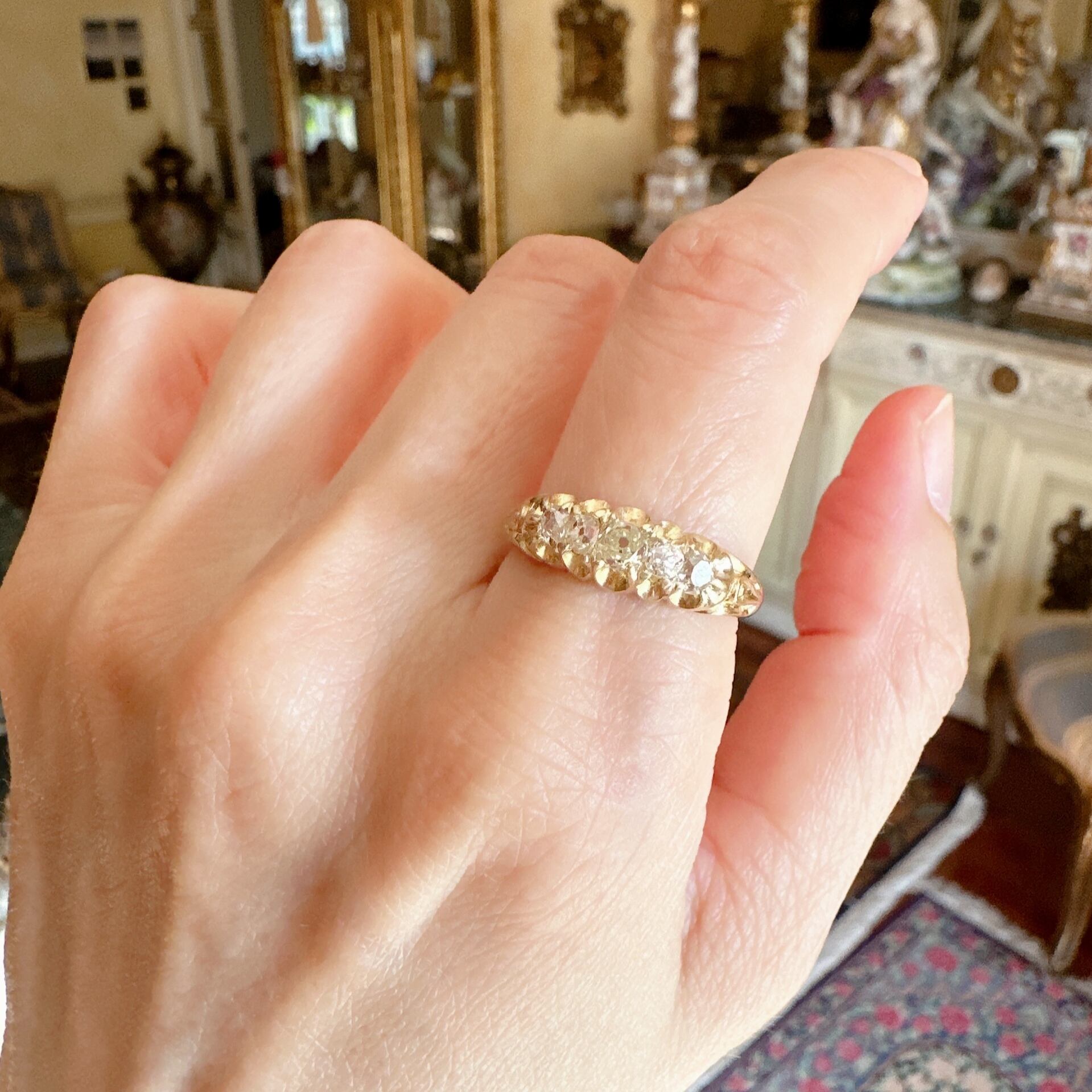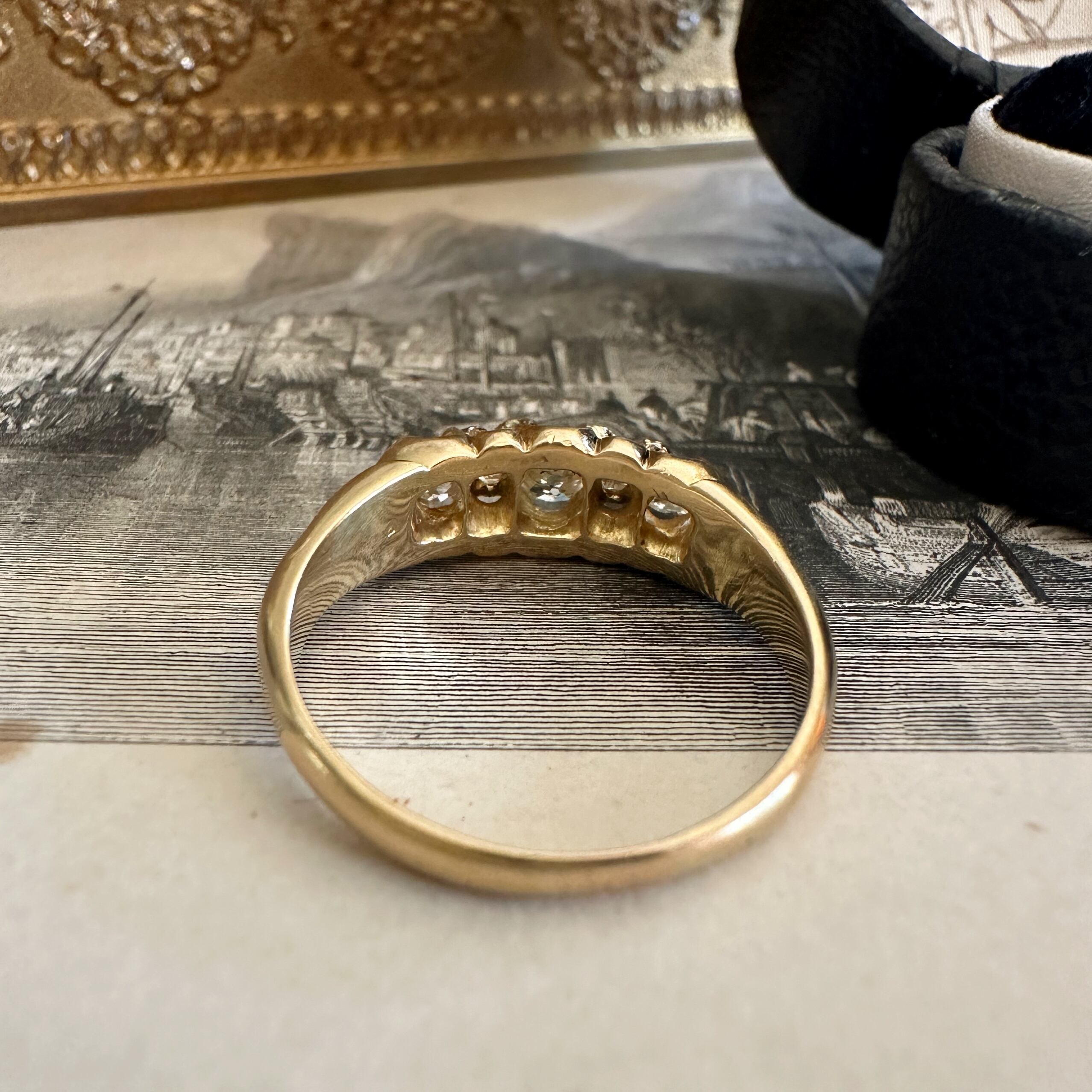 まるで歴史の一片を指先に纏うかのような特別な魅力を持っているように感じるオールドマインカットダイヤモンドのファイブストーンリングのご紹介です。