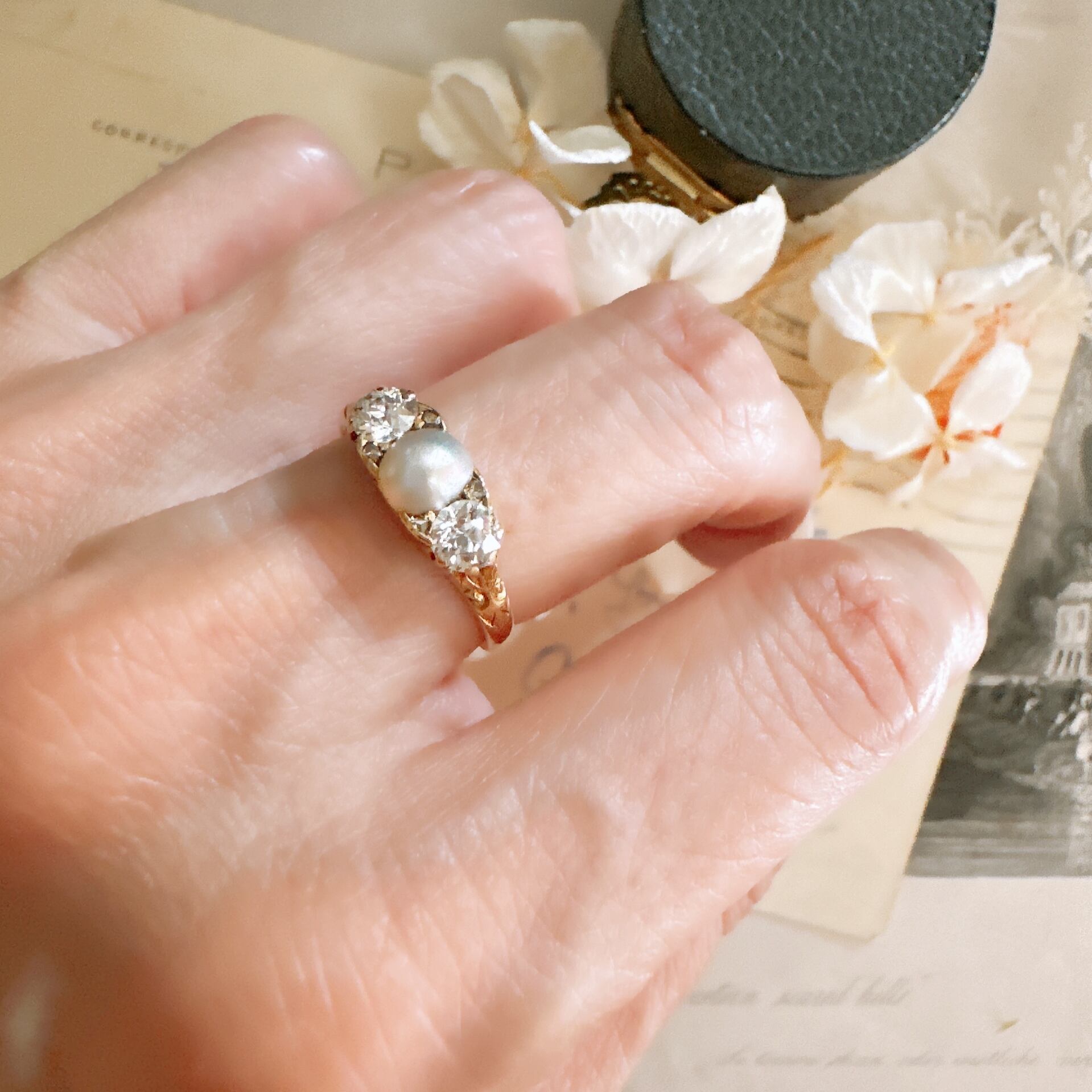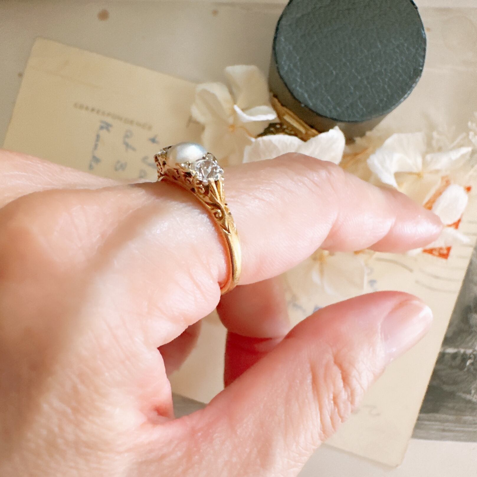 エドワーディアン時代は「白の時代」とも称され、プラチナや白い金属が多用されましたが、このリングはゴールドの台座を用いることで温かみを持ちながらも、パールとダイヤモンドの白のコンビネーションがエドワーディアンらしいエレガンスを保っています。