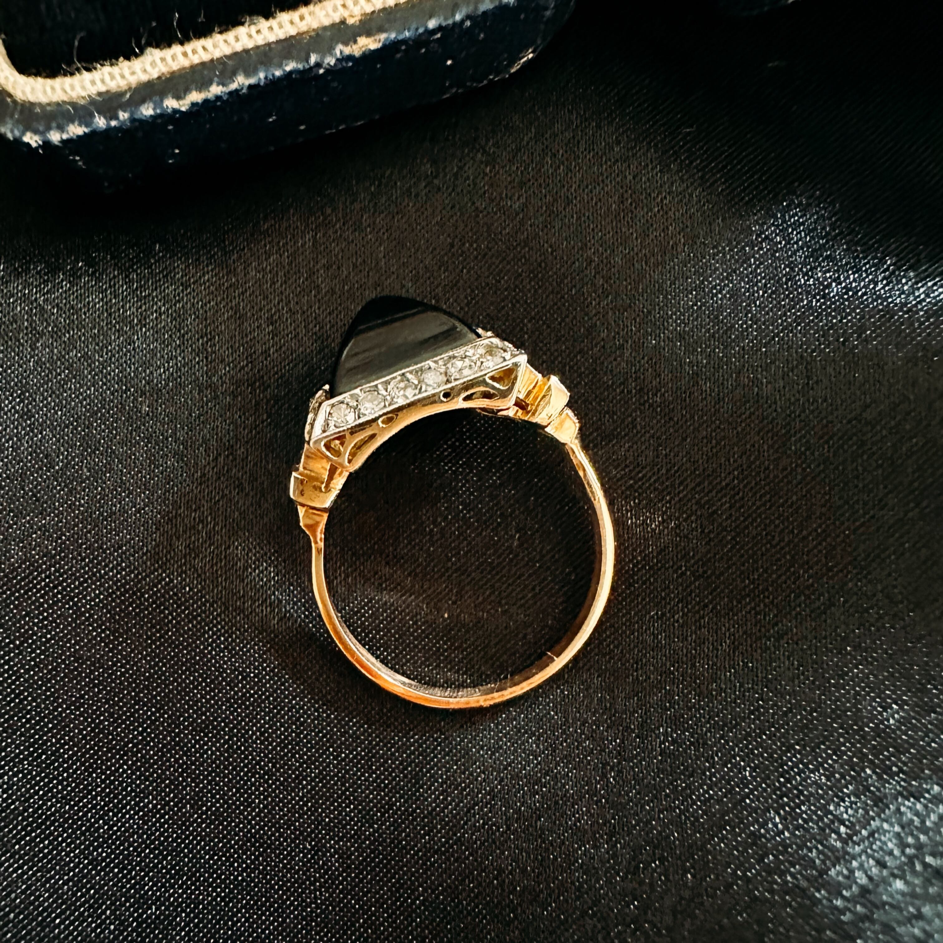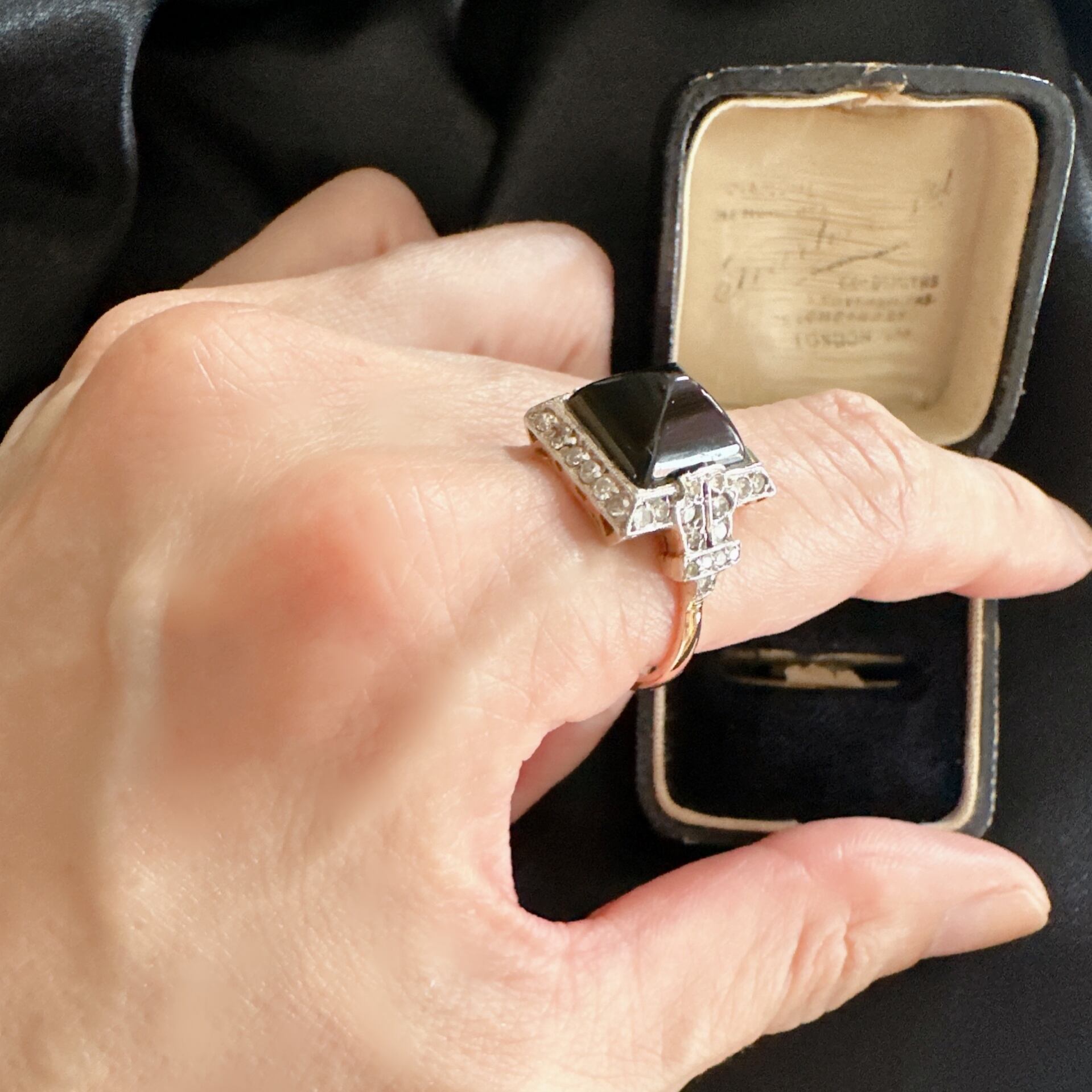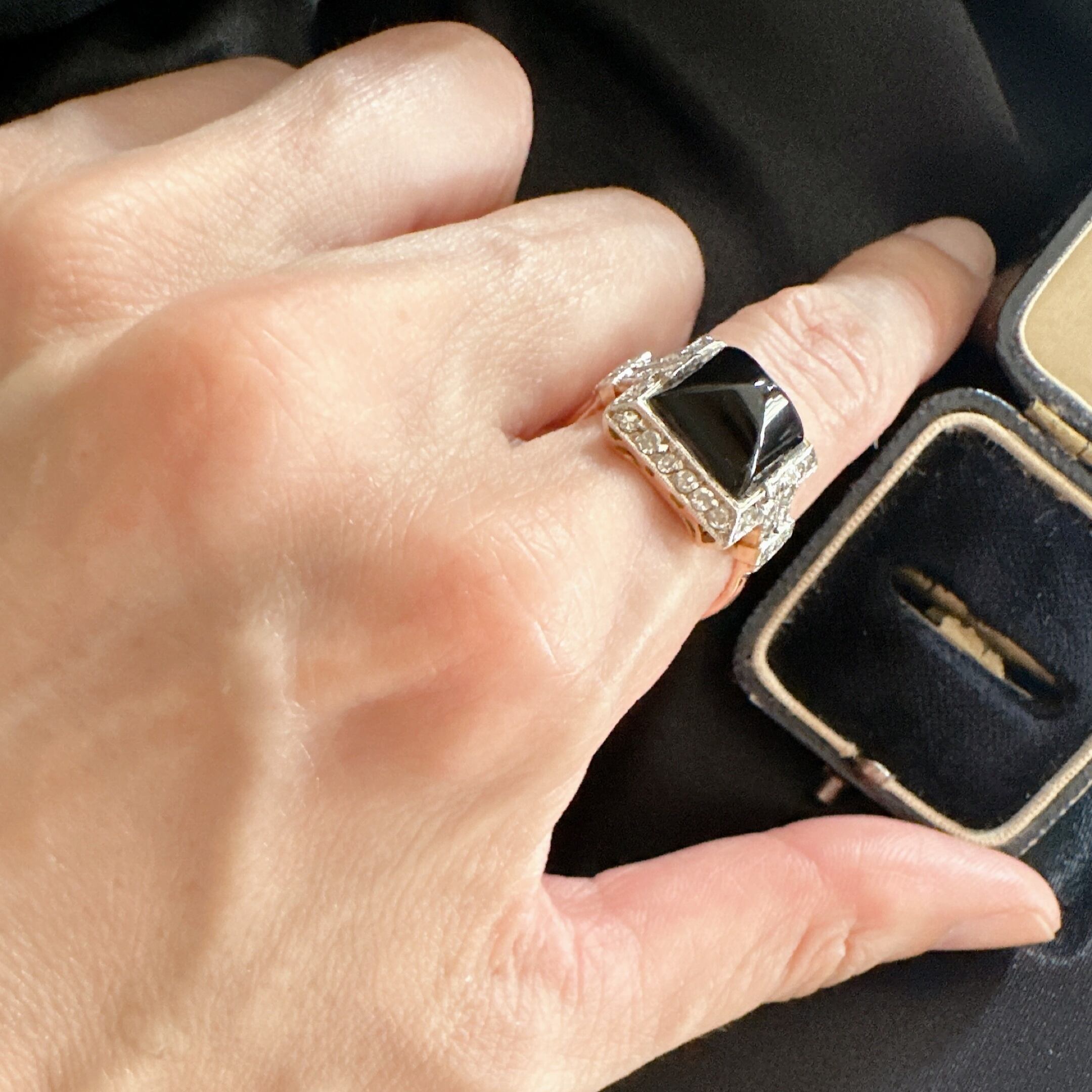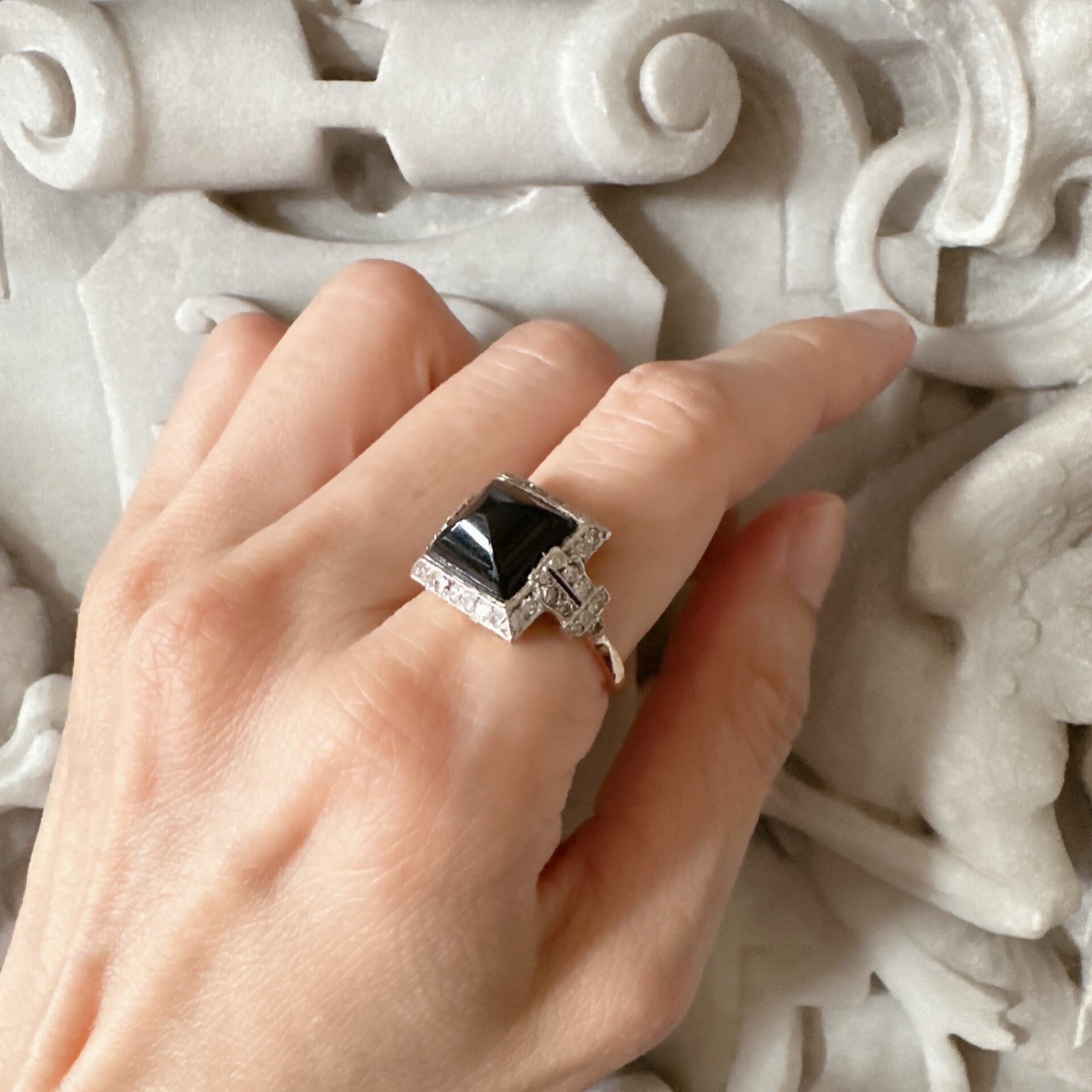 オニキスを取り囲むのは、小さなダイヤモンドが繊細にセットされた四角いフレームです。このフレームは、直線的で幾何学的な美しさを強調していて、アールデコの特徴である合理的で洗練されたデザインです。