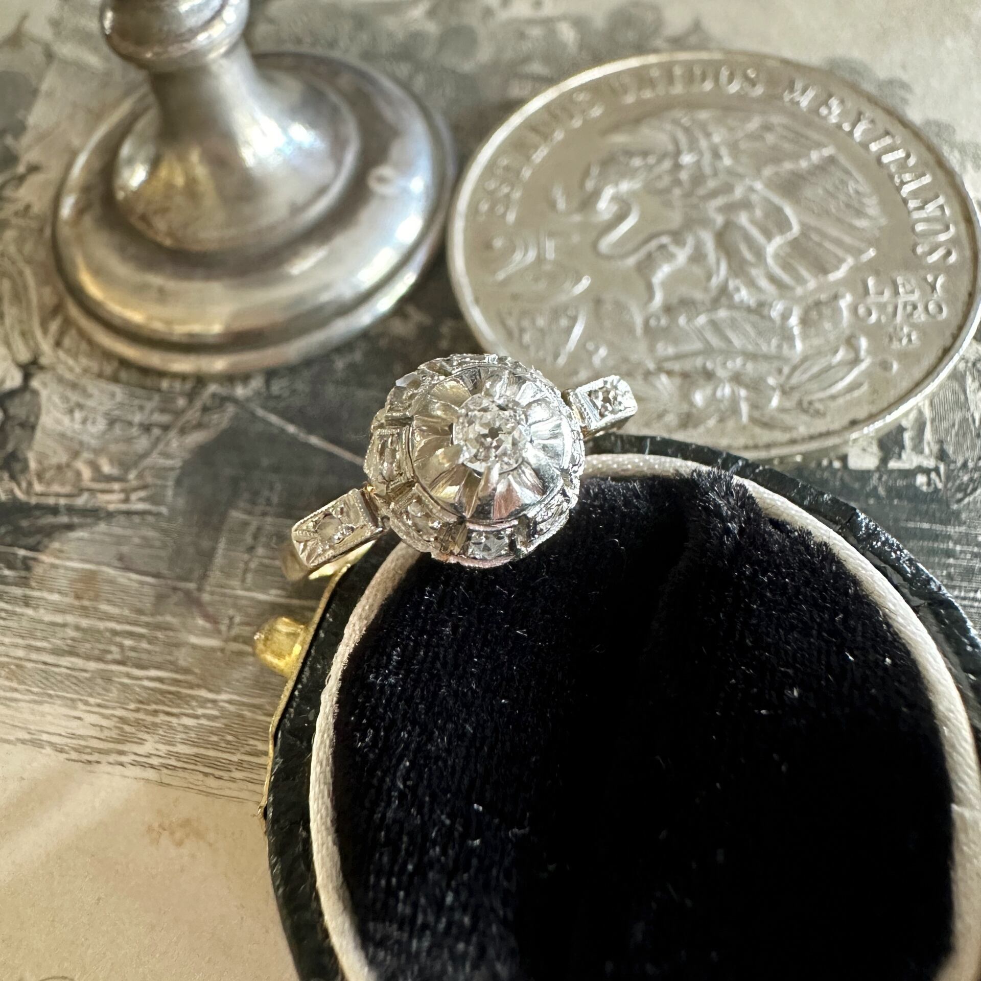 このリングの中央には、アンティークダイヤモンドがしっかりとセッティングされています。ダイヤモンドは小ぶりながらも、オープンキュレットでその厚みと深みがあり、現代のカットとは異なる独特の輝きを放ちます。アンティークダイヤモンド特有の温かみのある煌めきは、指先で優雅な輝きを生み出し、歴史の深さを感じさせてくれます。