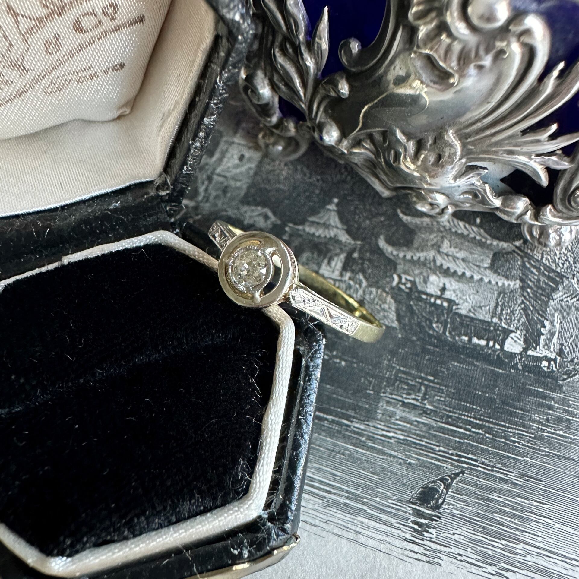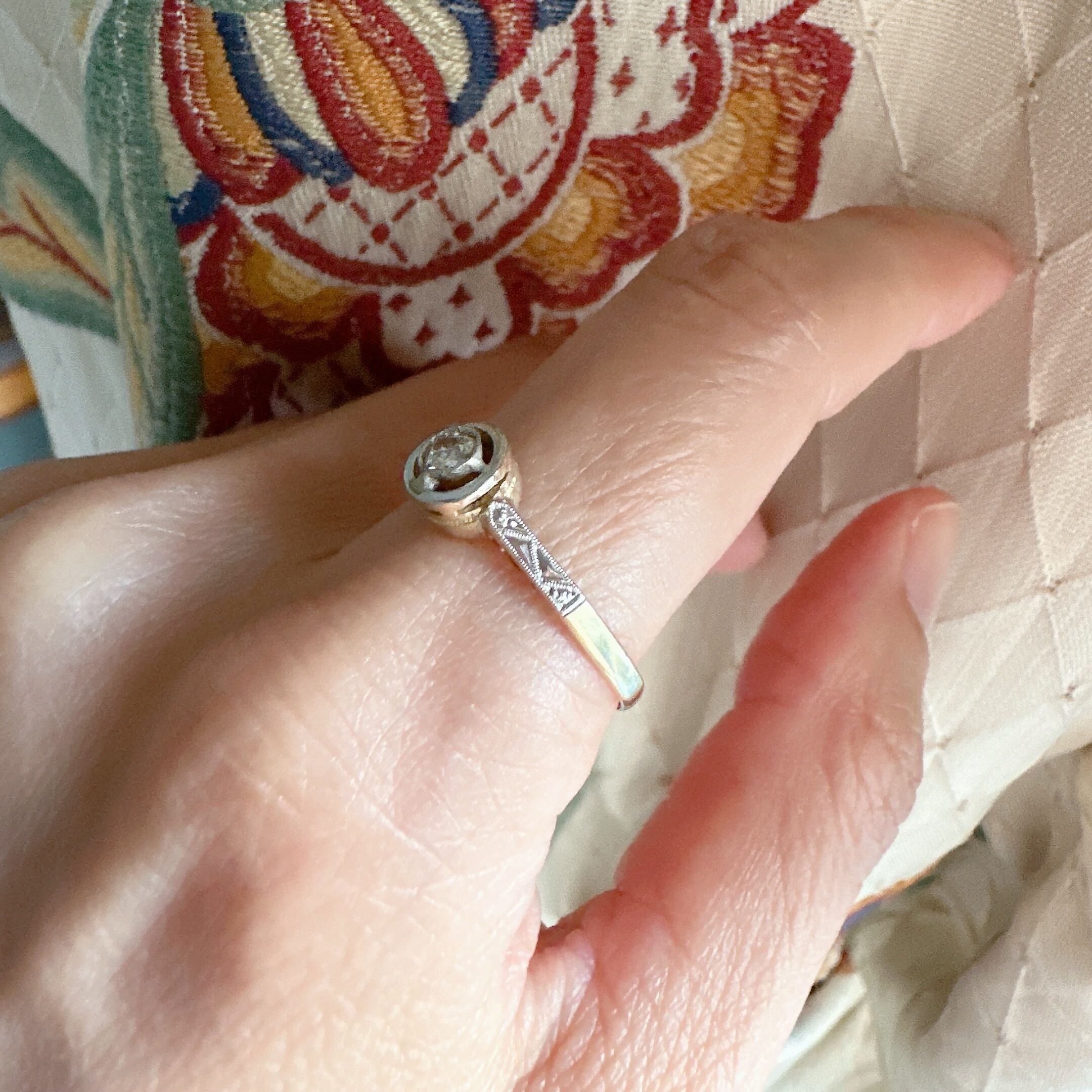 中心にはオールドカットダイヤモンドが据えられており、その周囲をプラチナのベゼルが取り囲むことで、ダイヤモンドが一層際立ちます。オールドカットダイヤモンド特有のファセットが柔らかな光を反射し、オールドカット開かれたキューレットによって柔らかくロマンティックな光を反射し、クラシックな輝きを放つこのリングは、現代のカットでは味わえない温かみのある光を楽しむことができます。