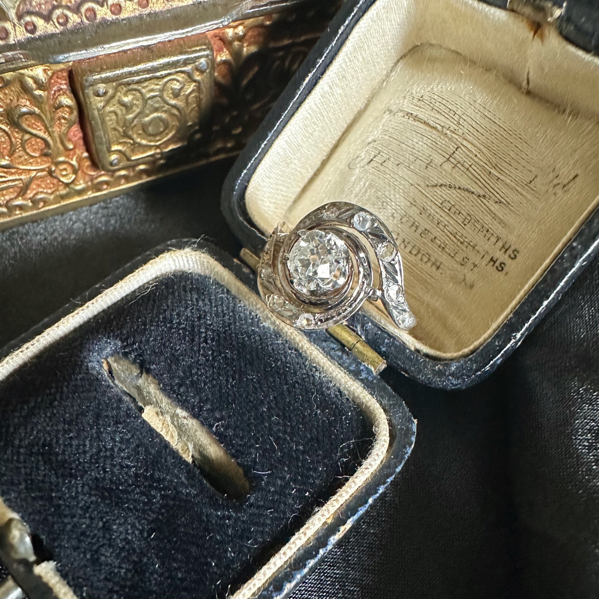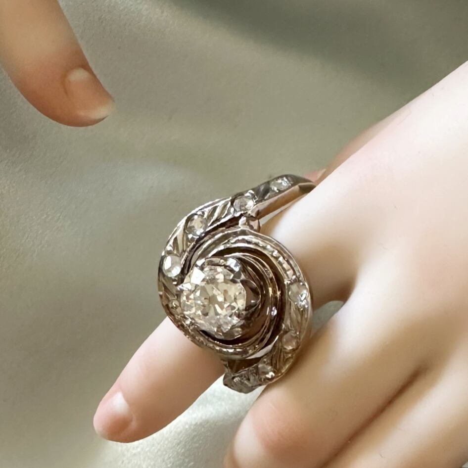リングの中心を飾るオールドマインカットダイヤモンドは、手作業で仕上げられたそのゴツゴツな歪感が唯一無二のダイヤモンドとして誇らしげに存在し、このダイヤモンドの特有の輝きは、現代のブリリアントカットでは表現しきれない、温かみのある光沢を放ち、まるでキャンドルの光が揺らめくかのようで、オールドカットならではのその柔らかい輝きは、100年以上経った今でも時代を超えて煌めき続けています。