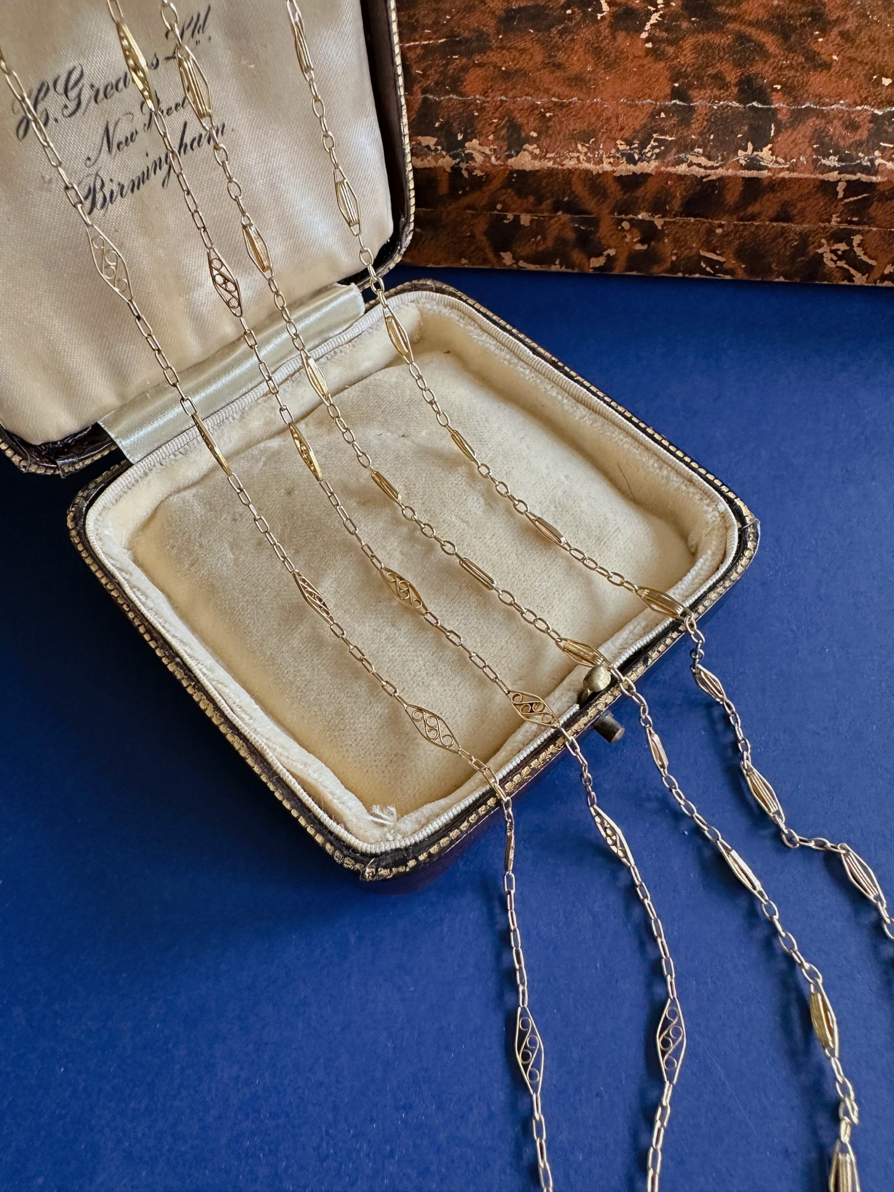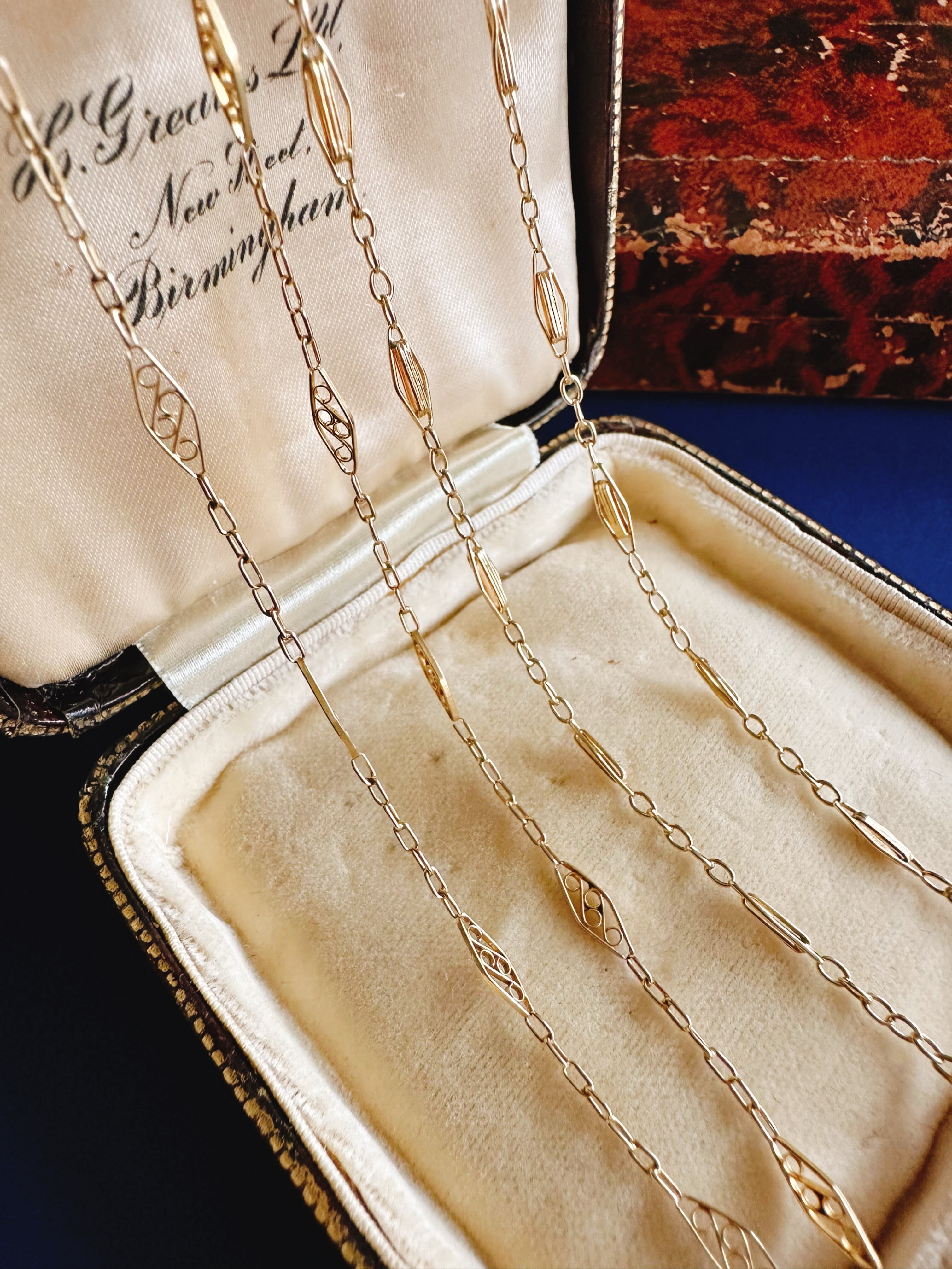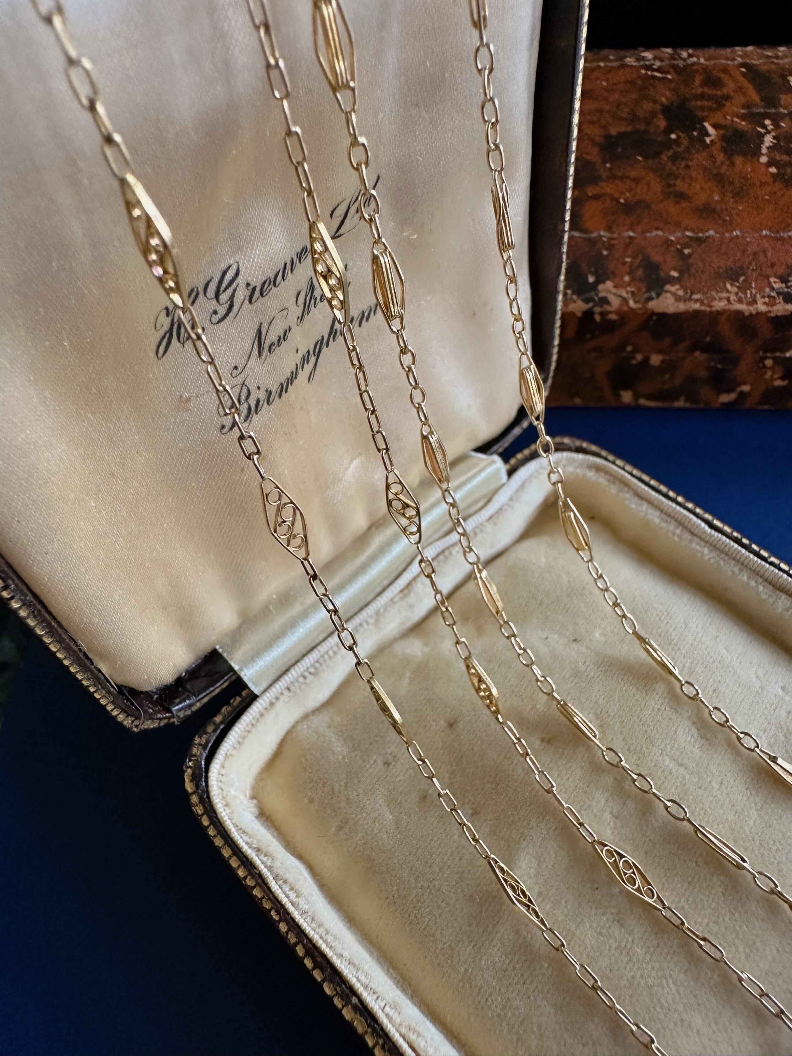 14金のアンティークチェーンネックレスのご紹介です。このネックレスは、その美しさだけでなく、細部にまでこだわったデザインや作りの工夫が際立ち、他のジュエリーにはない特別な魅力を放っています。