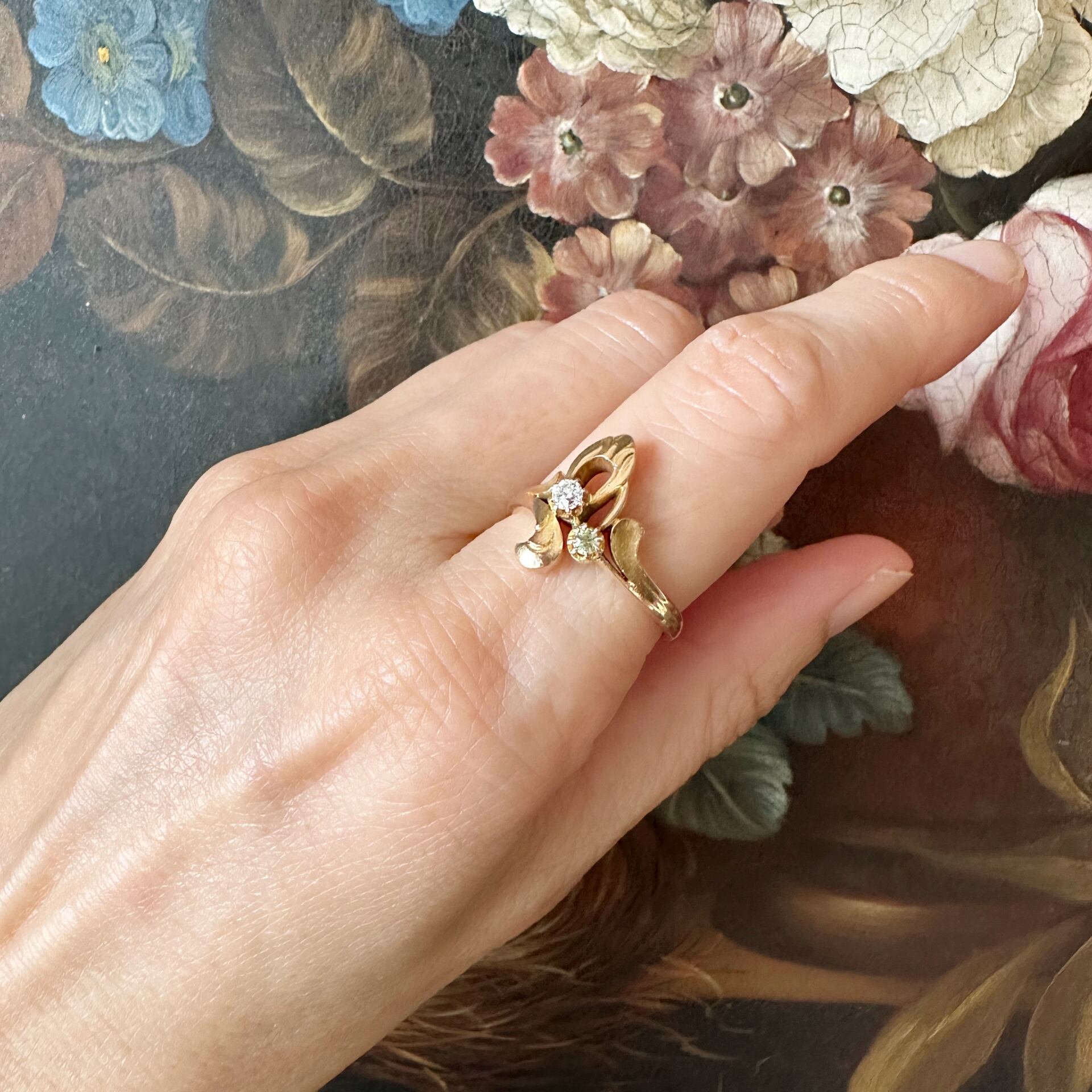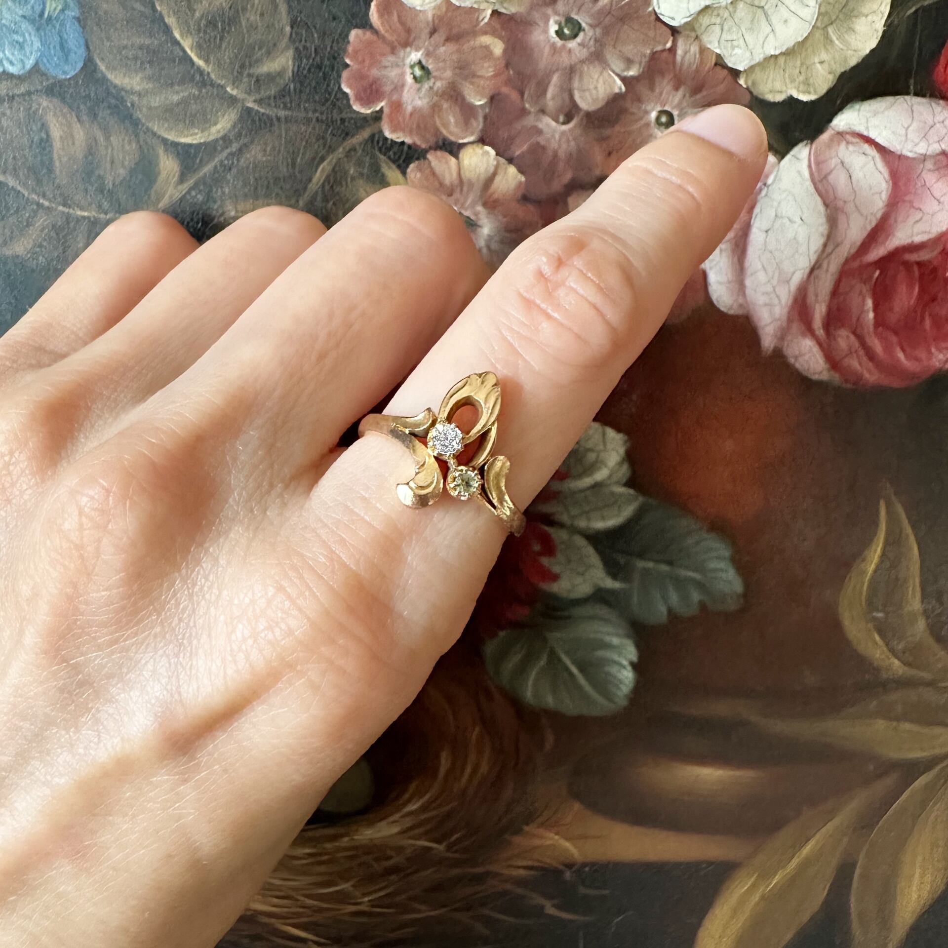 植物の蔓や自然のフォルムからインスピレーションを得たデザインは、アール・ヌーヴォー特有の「自然への回帰」を表現しています。リング全体を取り巻くカーブは繊細でありながら力強く、まるで自然界の動きをそのままジュエリーとして固めたかのような、流動的な美しさを感じさせますね。